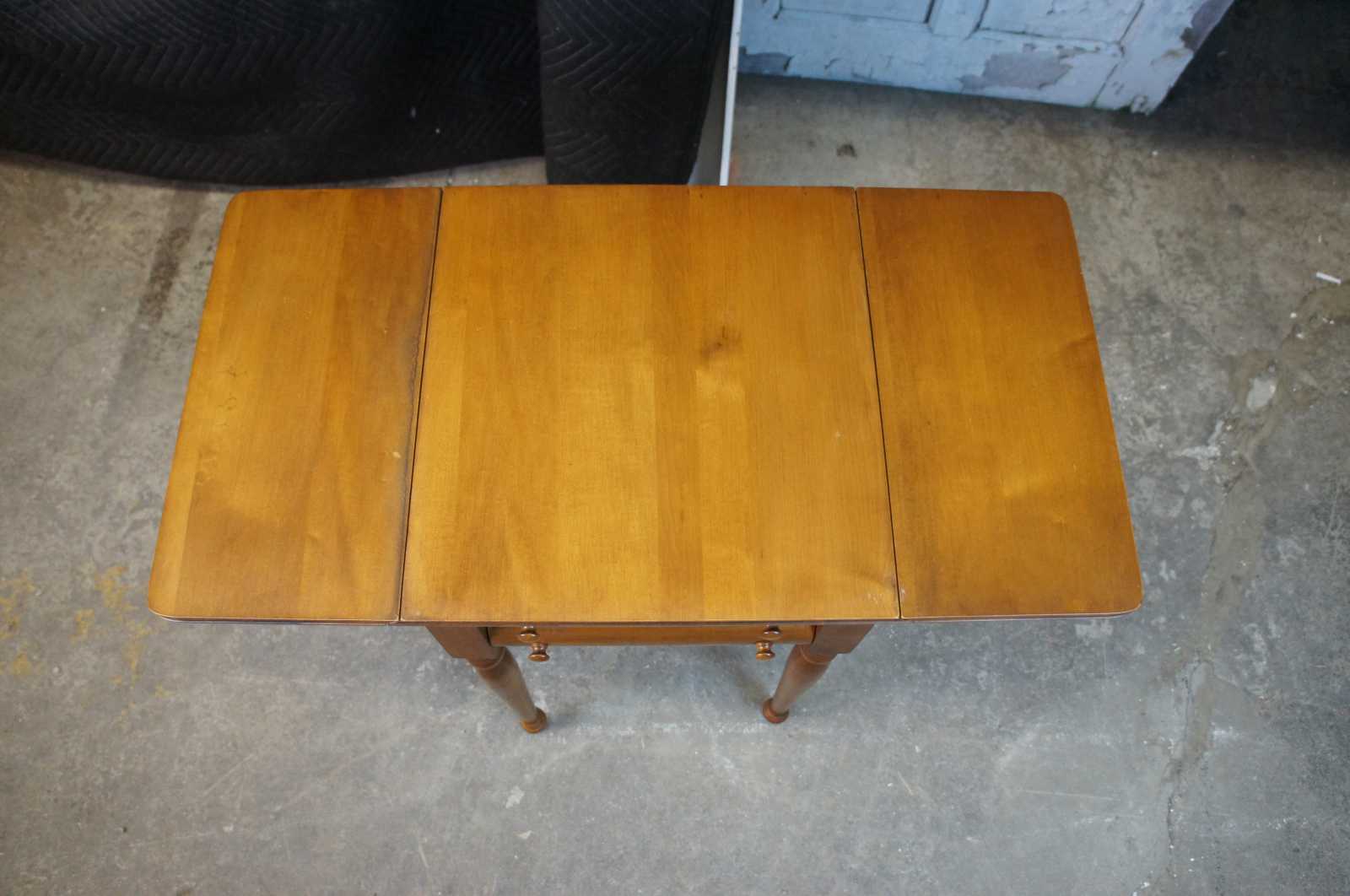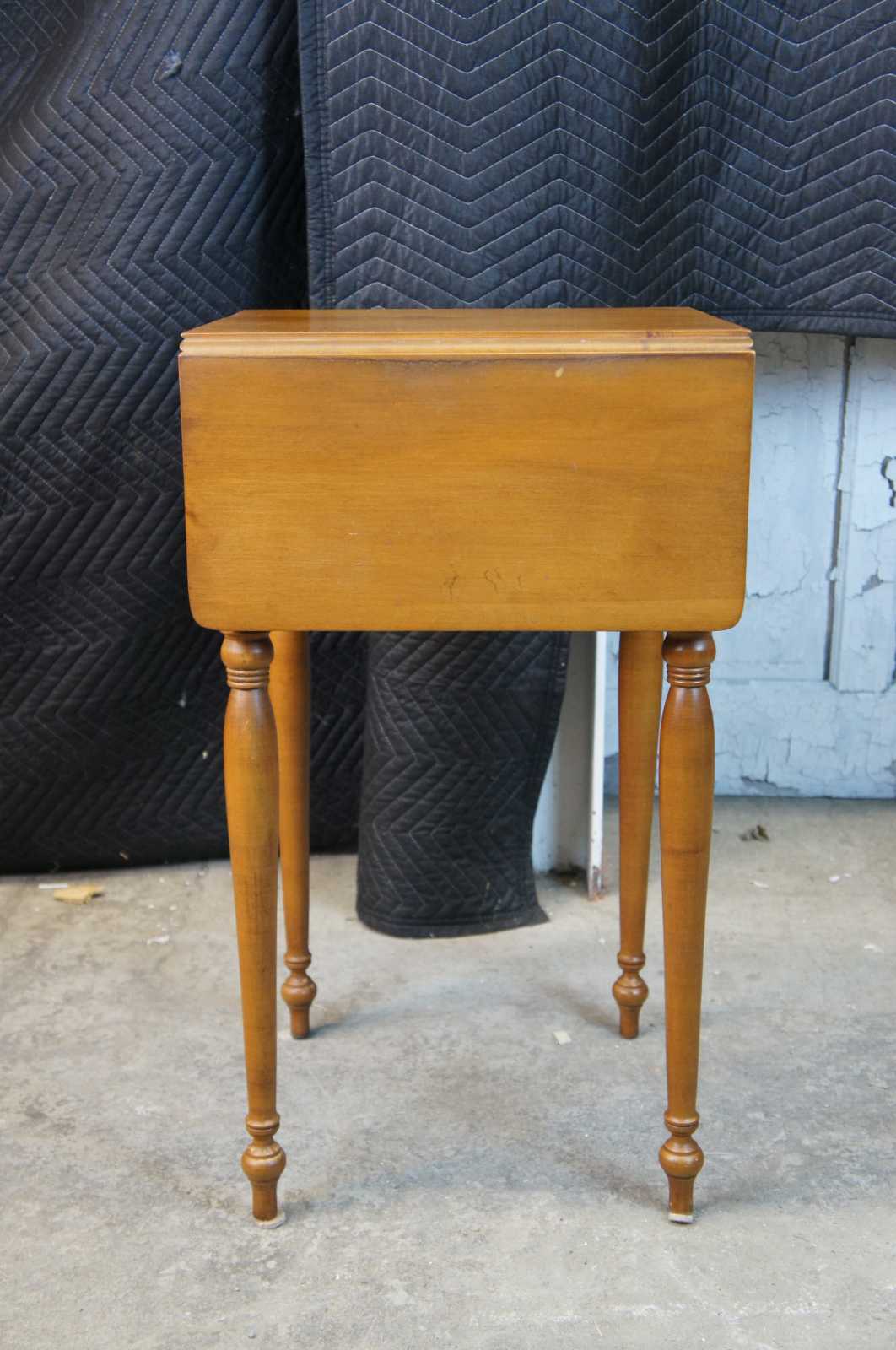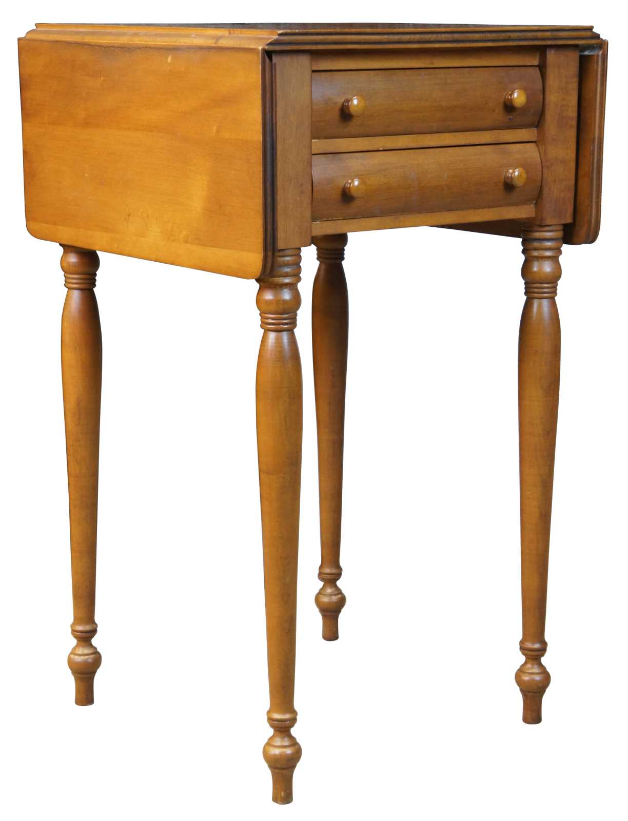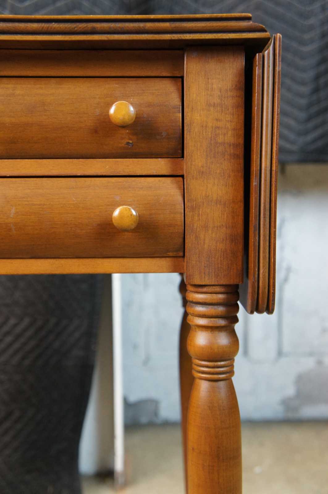 Antique Conant & Ball drop leaf pedestal side table / plant stand / nightstand. Made of maple featuring two drop leaves and two drawers supported by long turned legs. Conant & Ball were famous for reproductions of old New England Furniture.