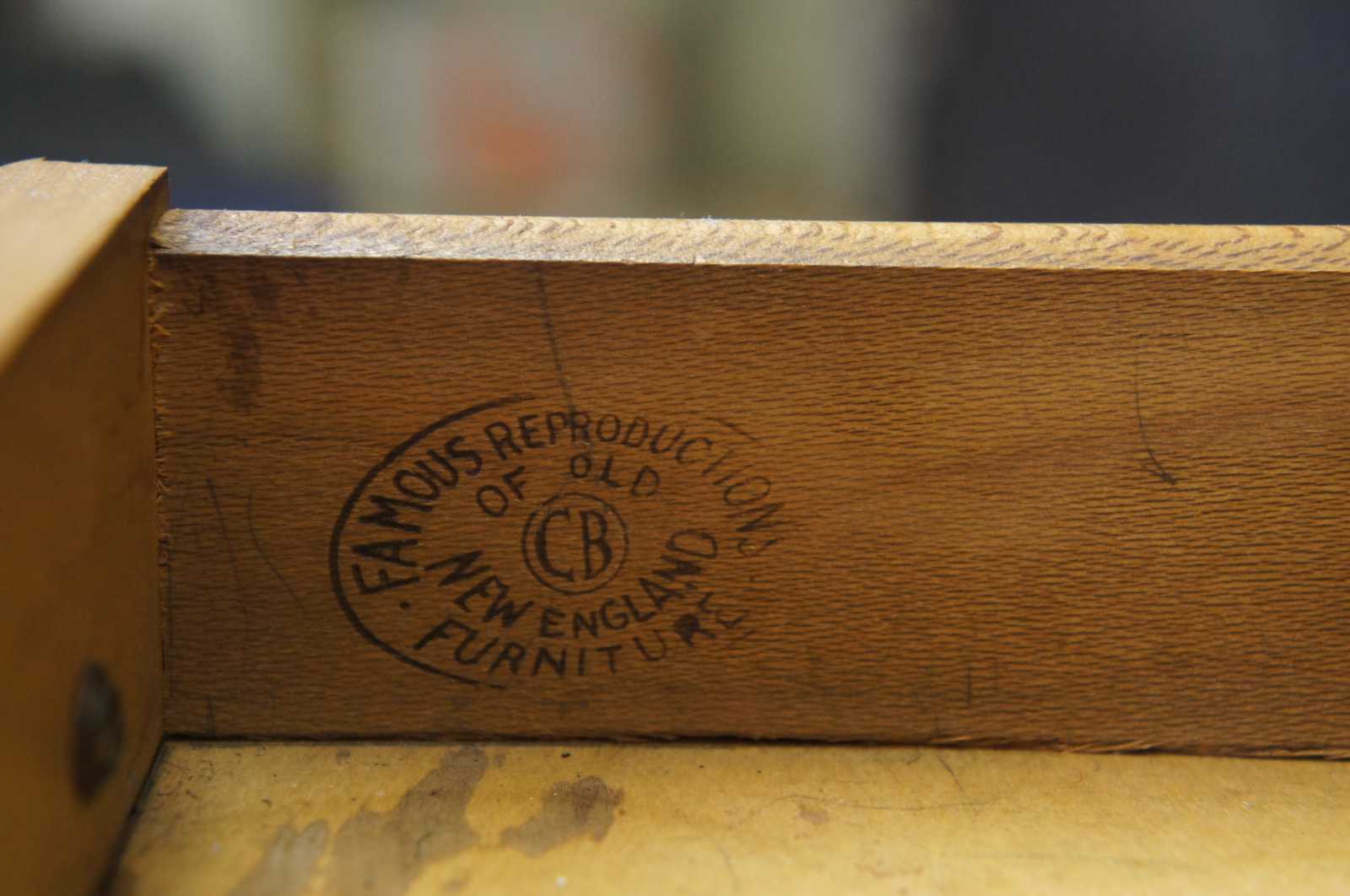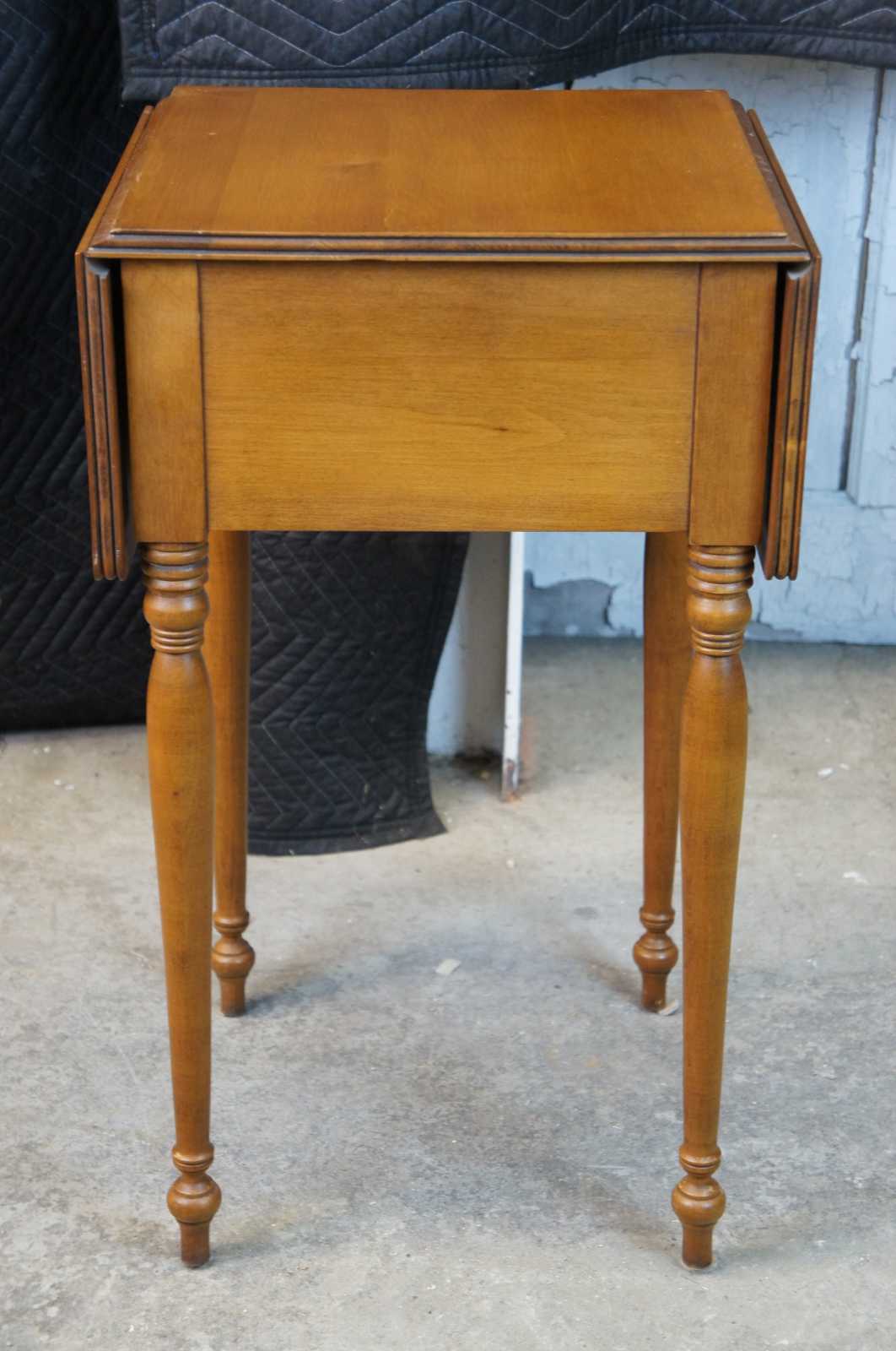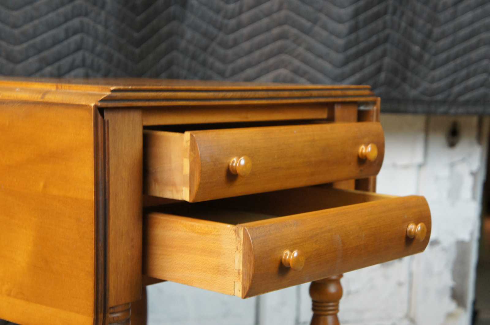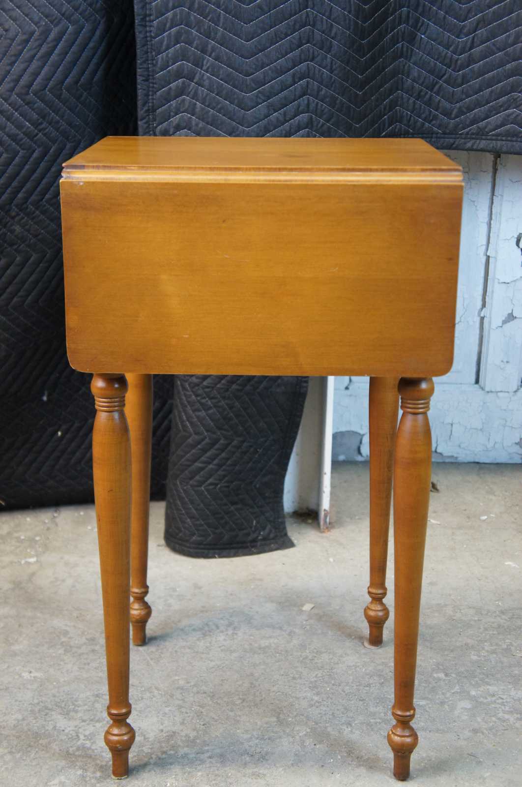 Antique Conant & Ball drop leaf pedestal side table / plant stand / nightstand. Made of maple featuring two drop leaves and two drawers supported by long turned legs. Conant & Ball were famous for reproductions of old New England Furniture.