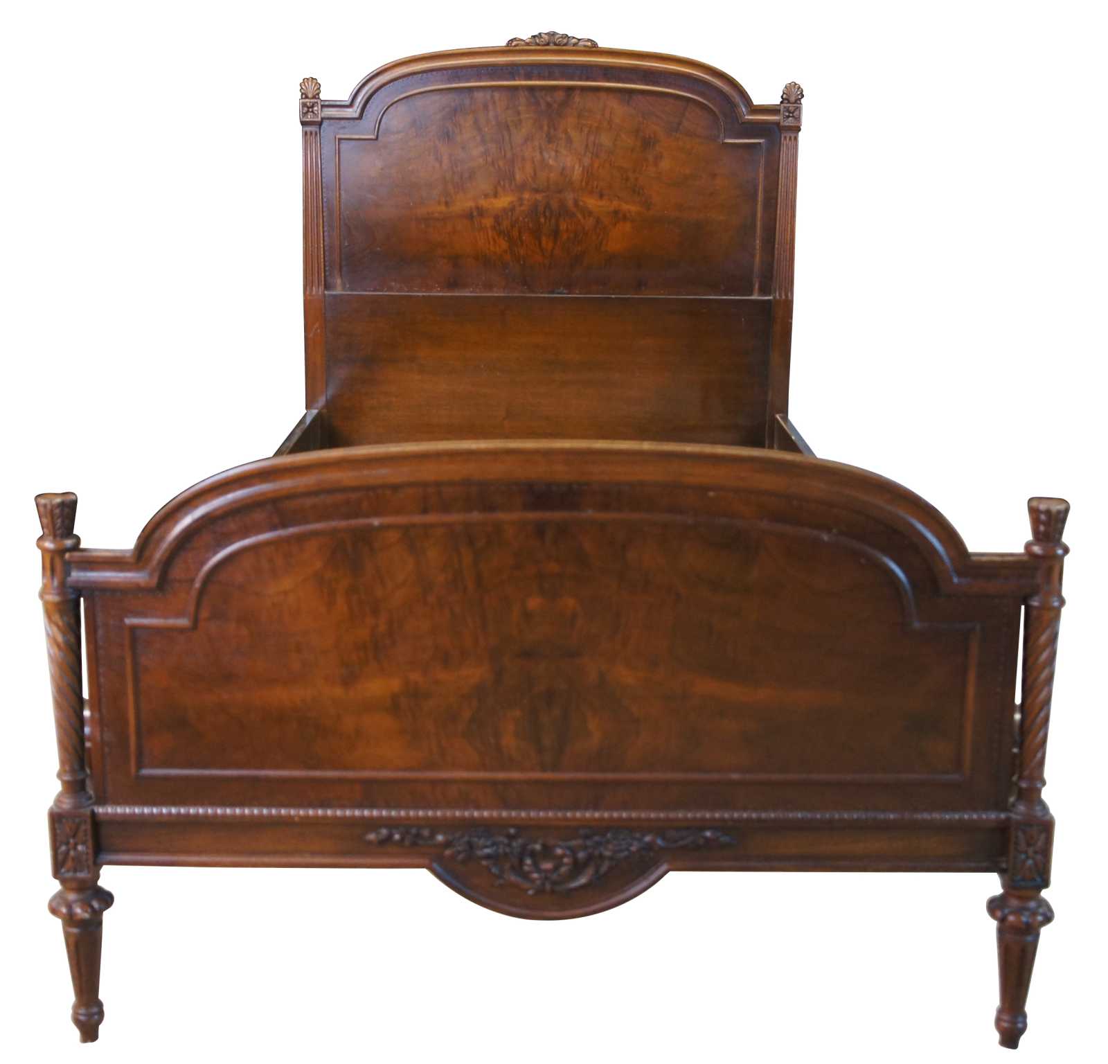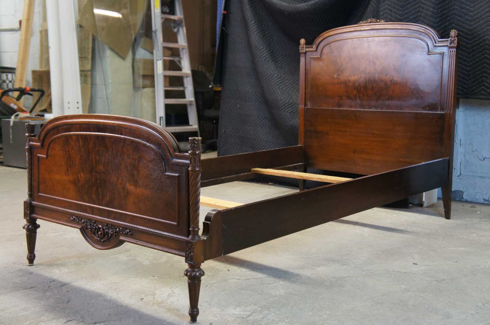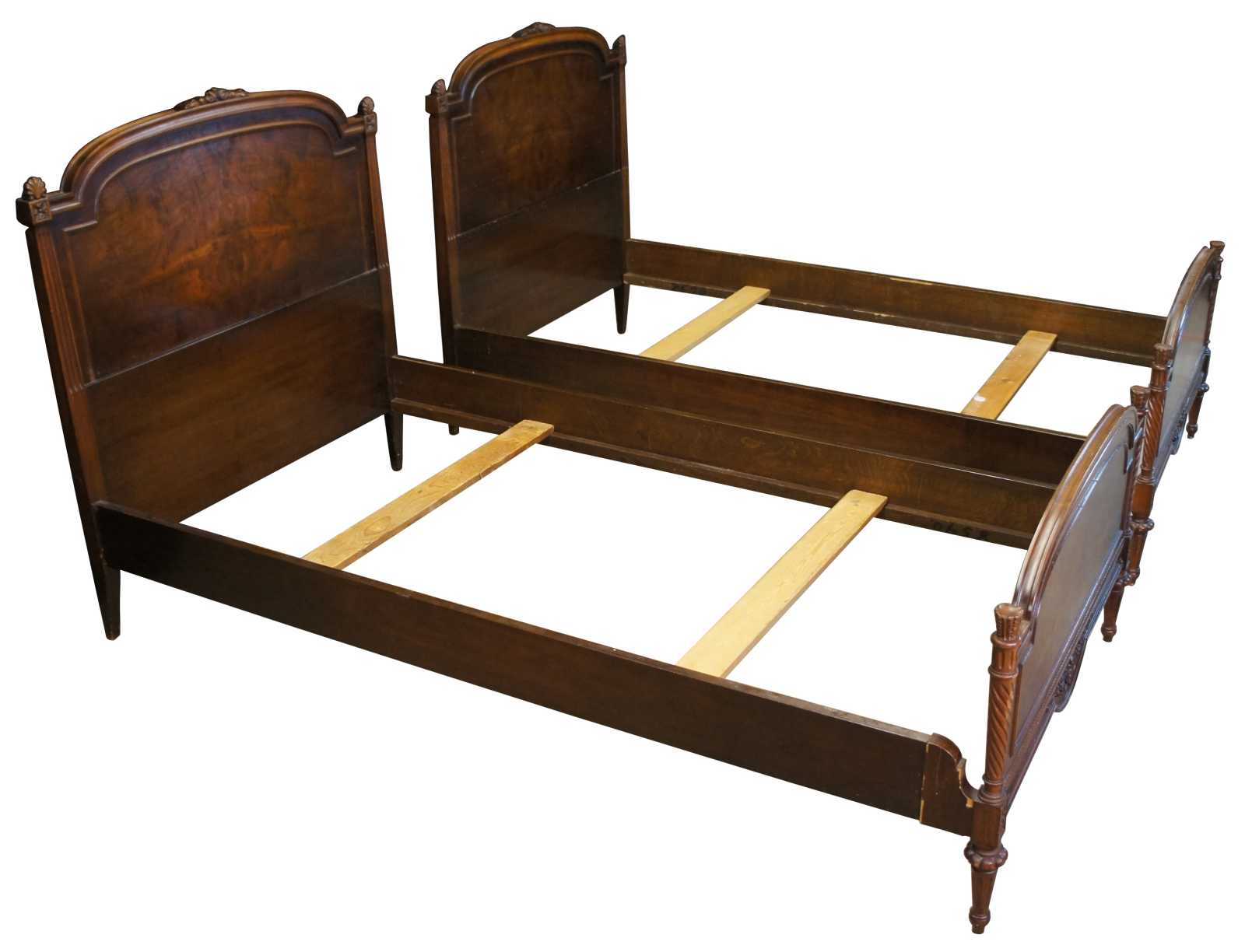 Pair of antique Johnson Furniture Company twin size bed frames. Made of walnut featuring French Neoclassical styling with carved fluted and twisted accents with carved floral, ribbon and shell motifs.