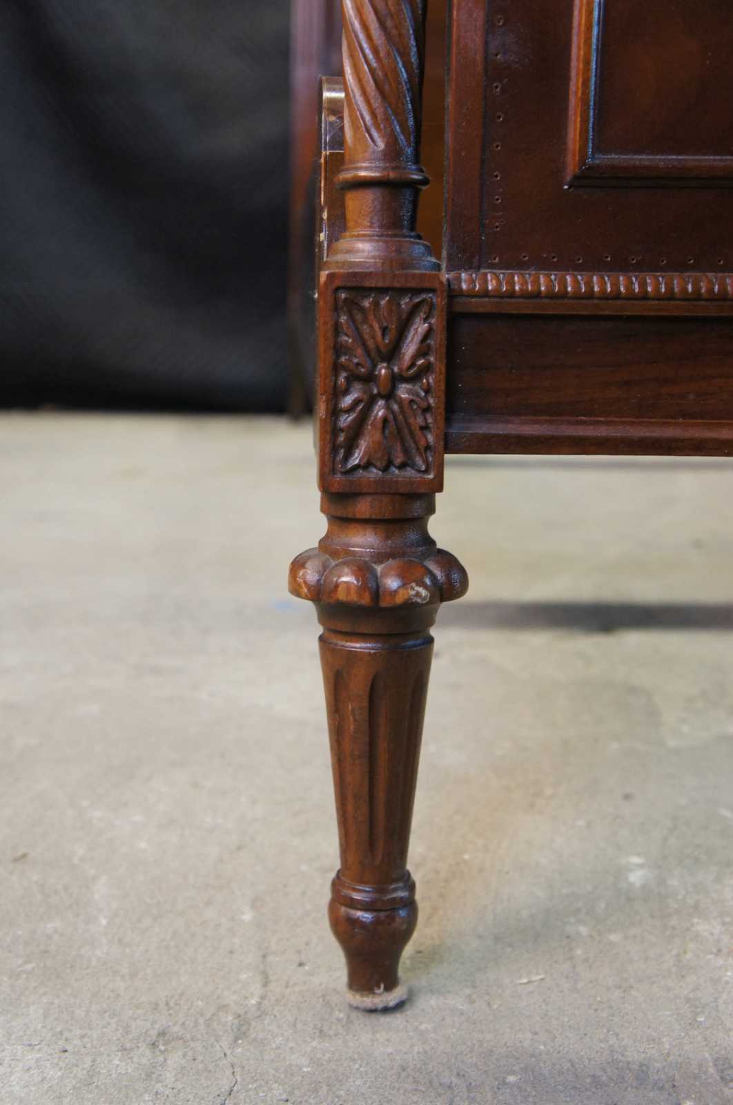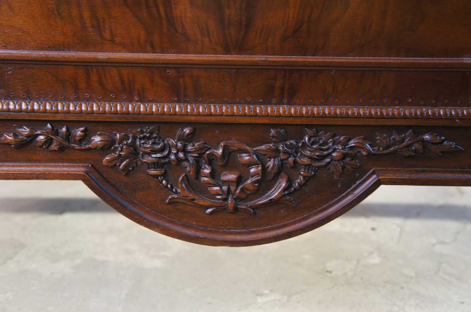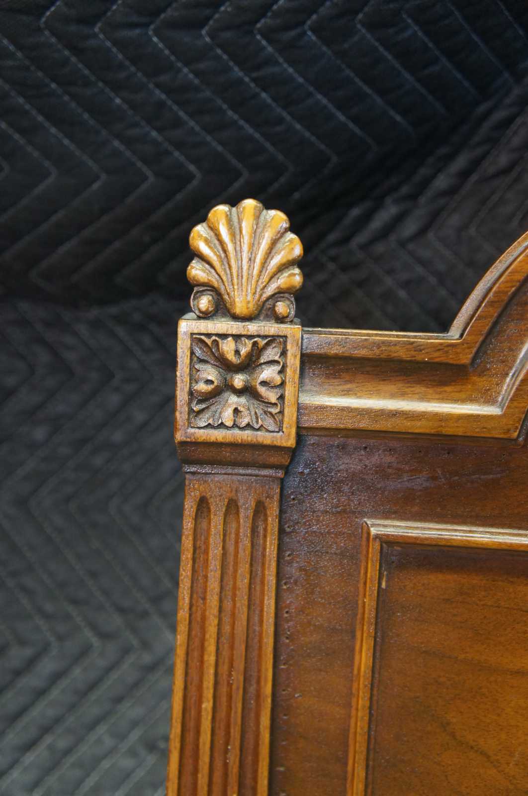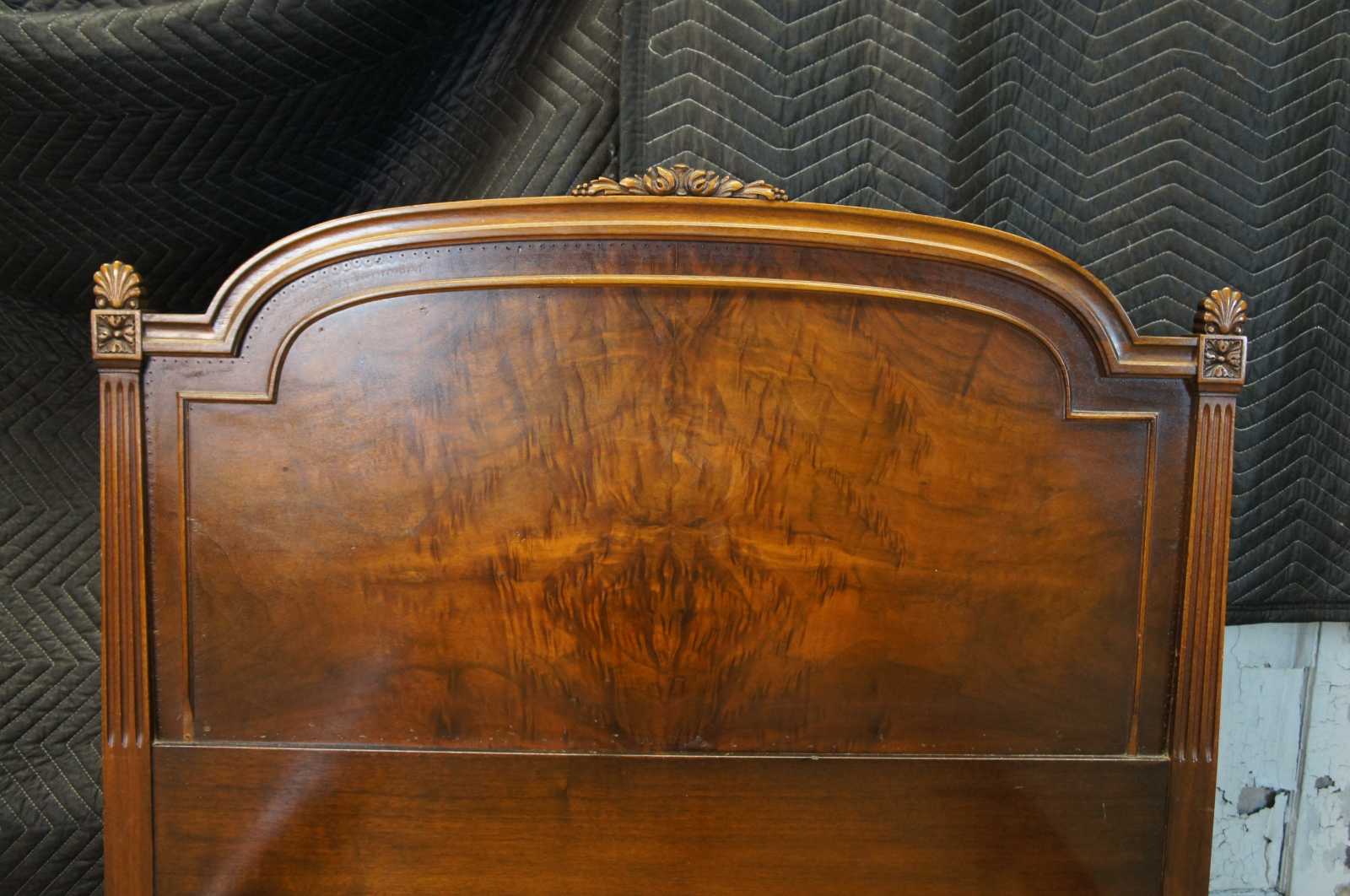 Pair of antique Johnson Furniture Company twin size bed frames. Made of walnut featuring French Neoclassical styling with carved fluted and twisted accents with carved floral, ribbon and shell motifs.