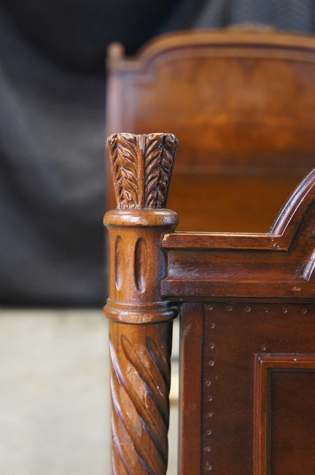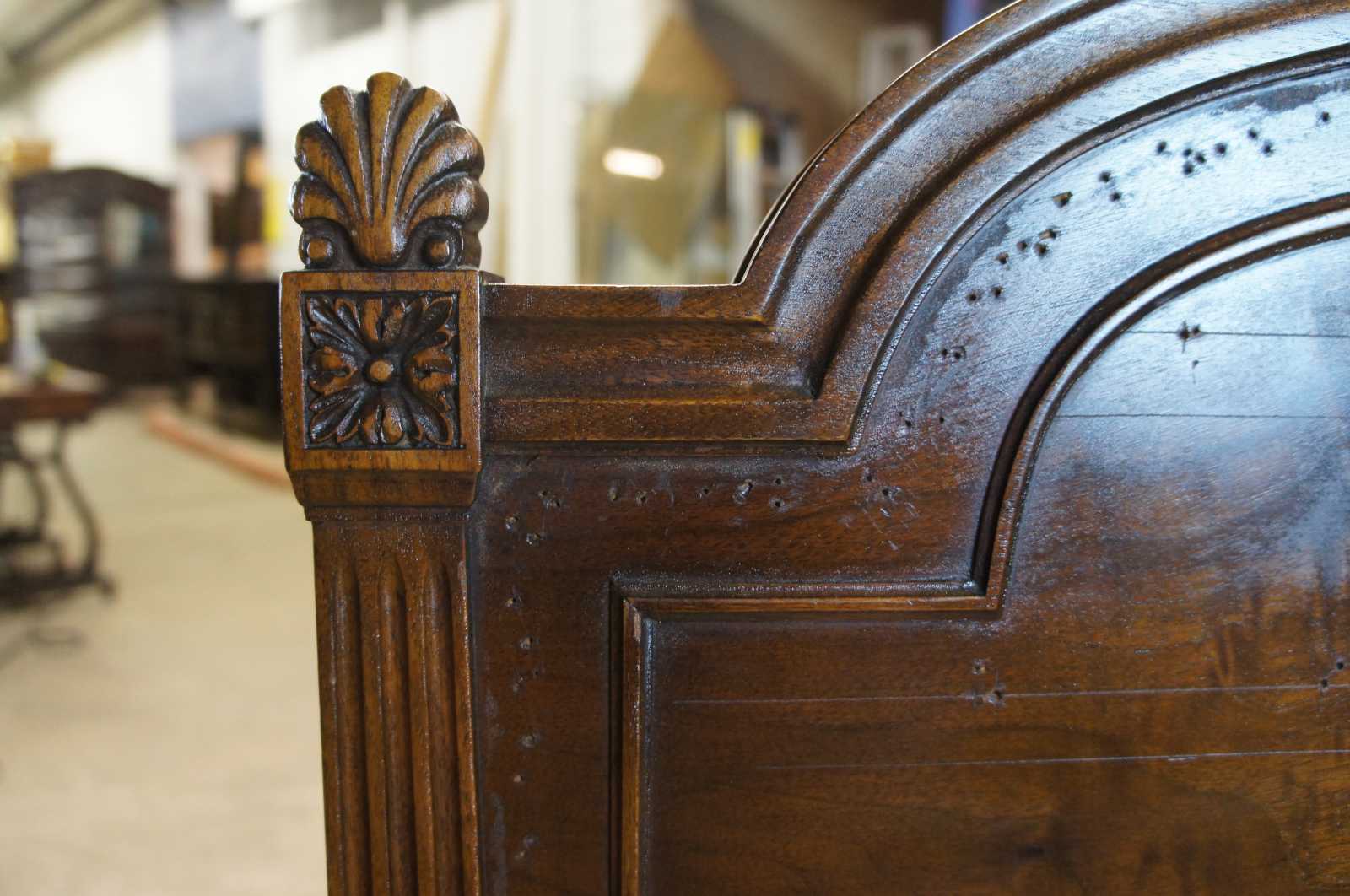 Good overall condition, wear and distressing commensurate with age and use, tack holes along head and foot boards where fabric was added, and subsequently removed.