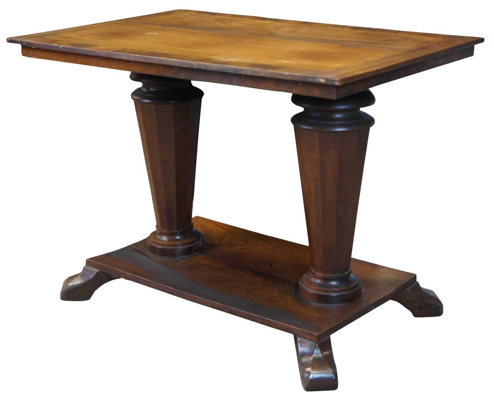 Antique American Empire double pedestal / pillar library table. Made of mahogany featuring rectangular form with two large turned and tapered columns.