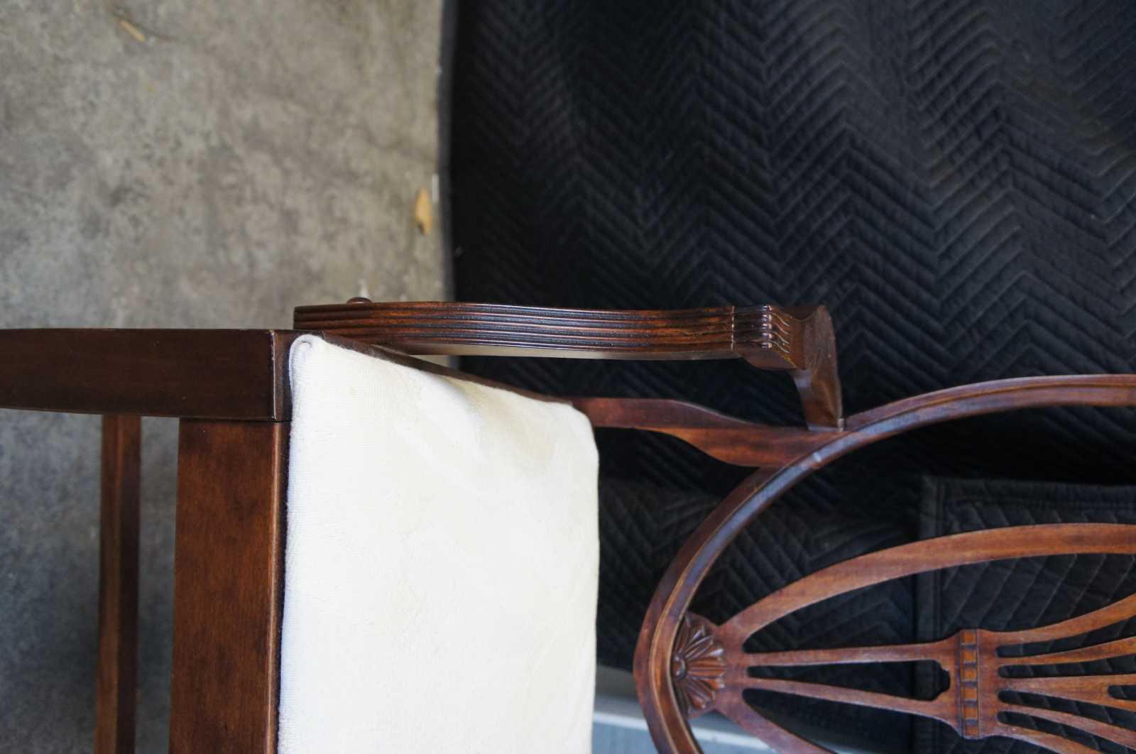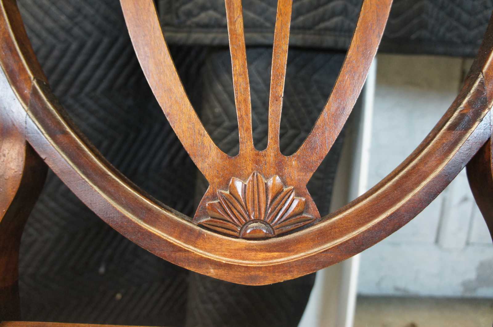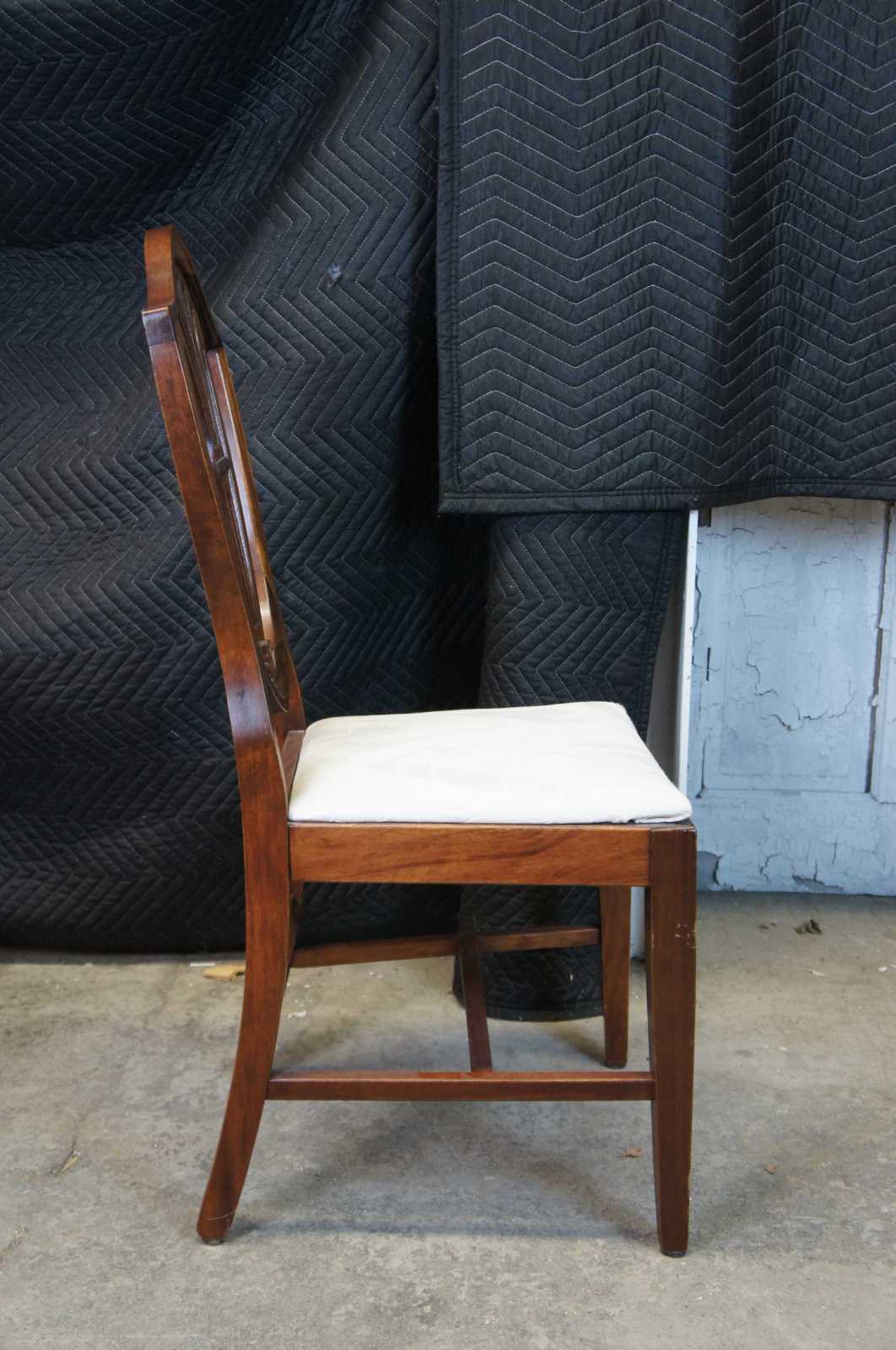 Three vintage shield back dining chairs. Made of mahogany featuring Sheraton and Hepplewhite styling with pierced back, floral carving and tapered legs.