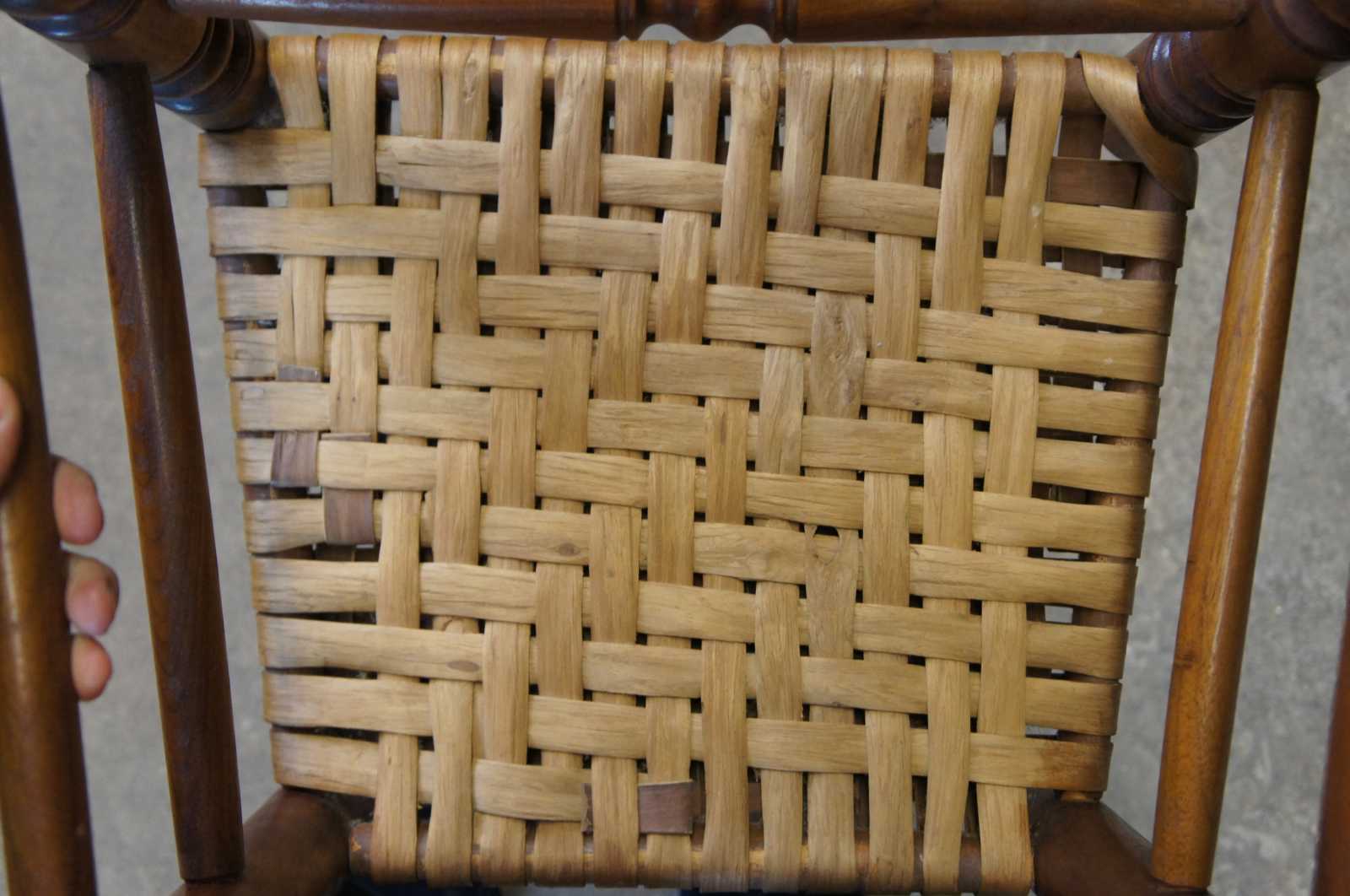 Six antique Shaker farmhouse side dining chairs. Made of walnut featuring tall ladderback form with teardrop shaped finials, round turned supports and woven rush seat.