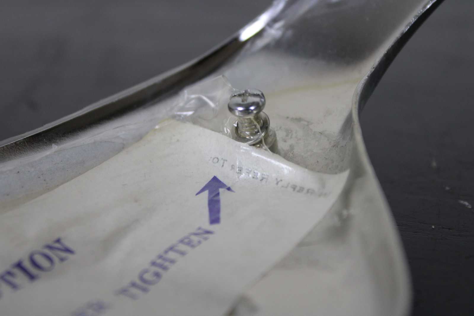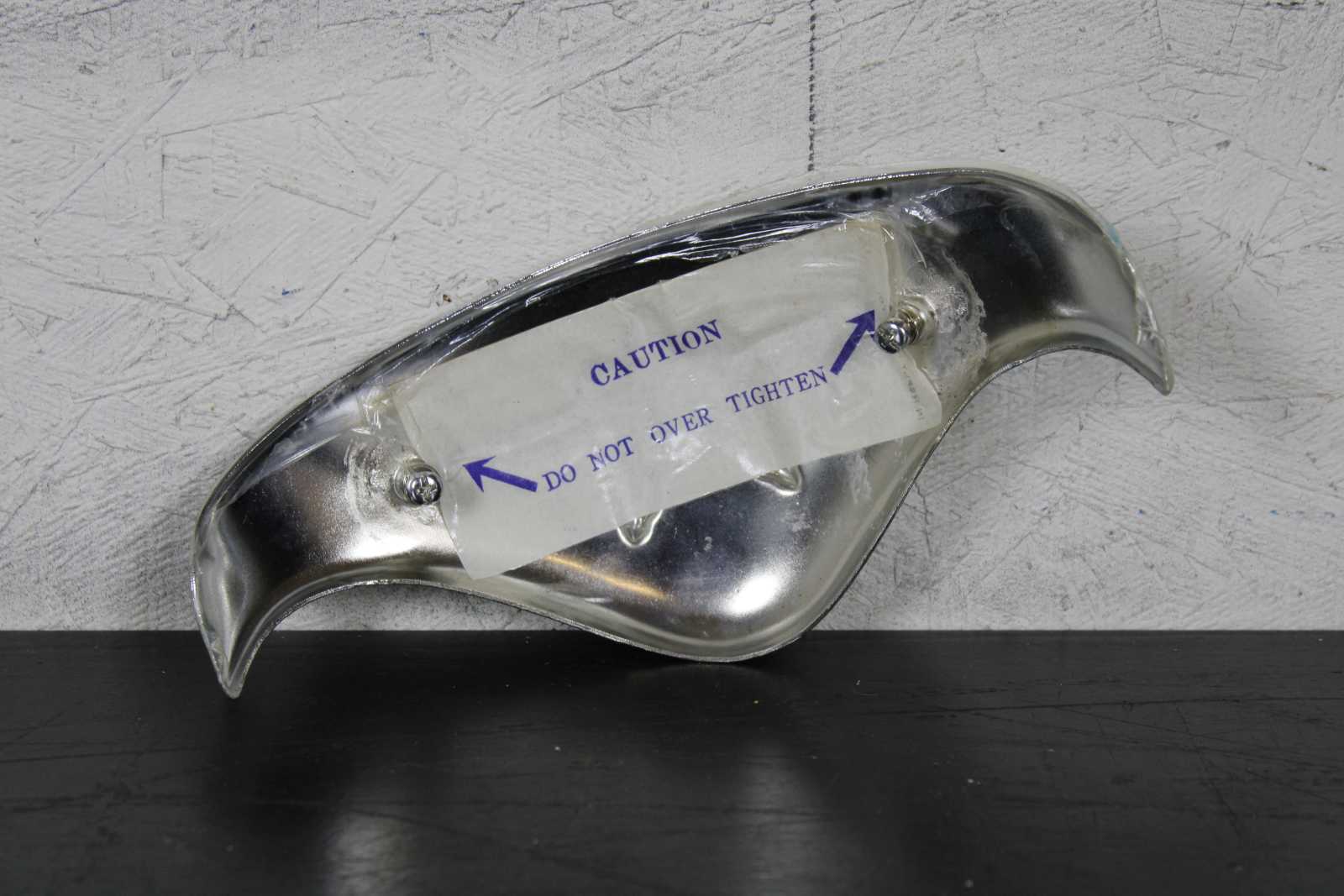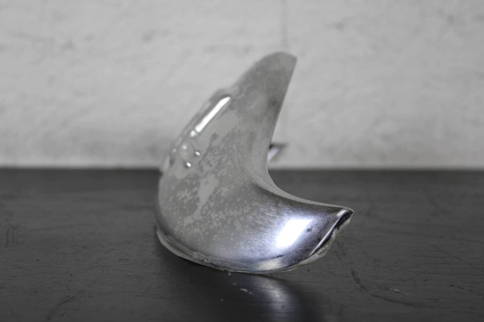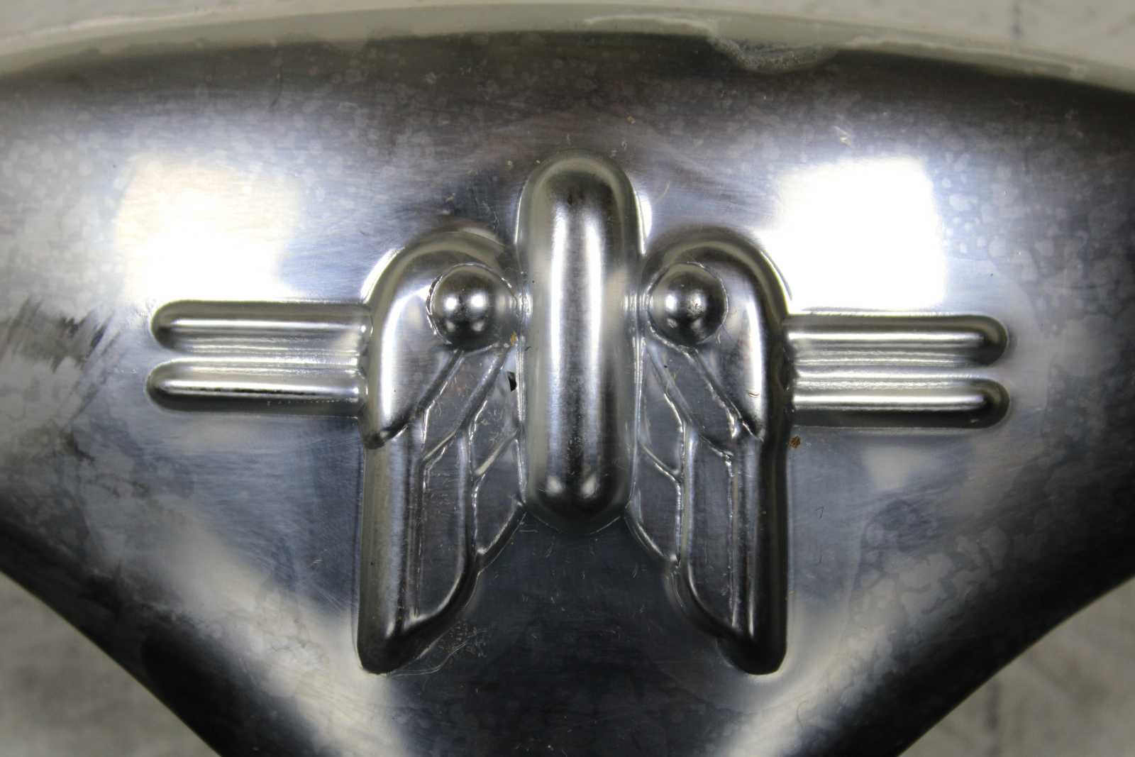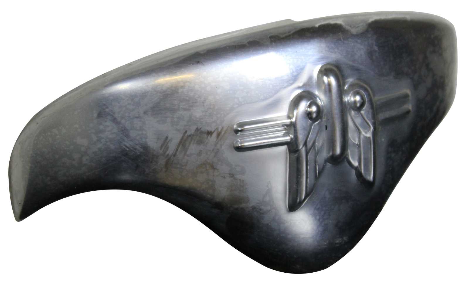 Vintage sealed Harley Davidson Knucklehead Panhead chrome front fender tip with winged rocket design.