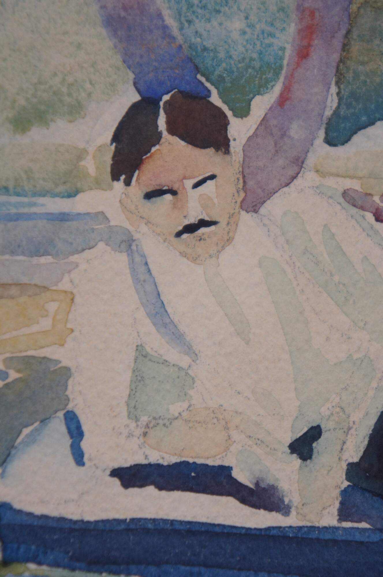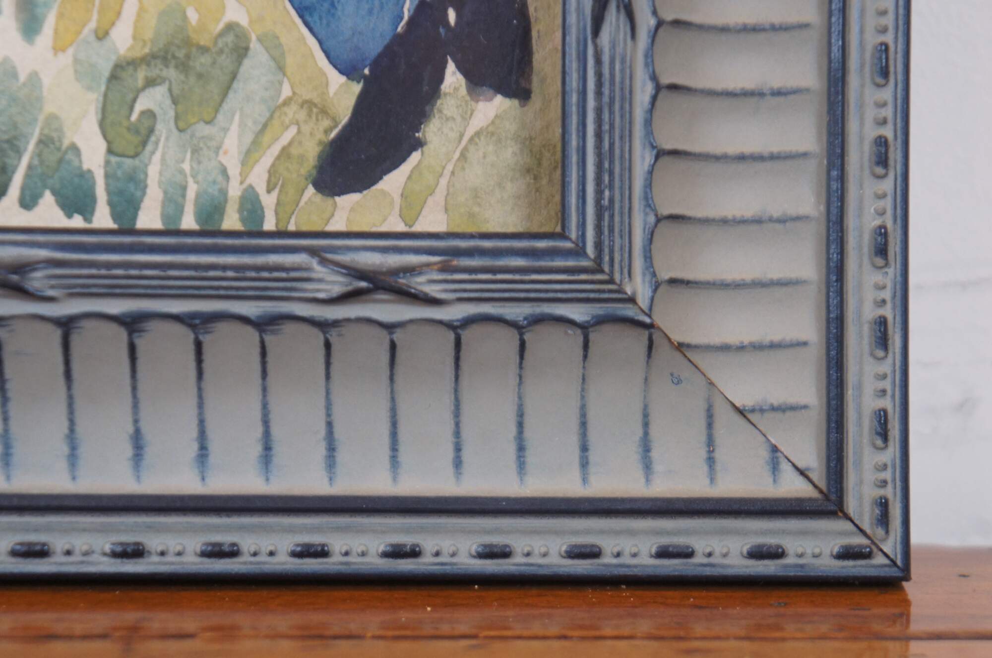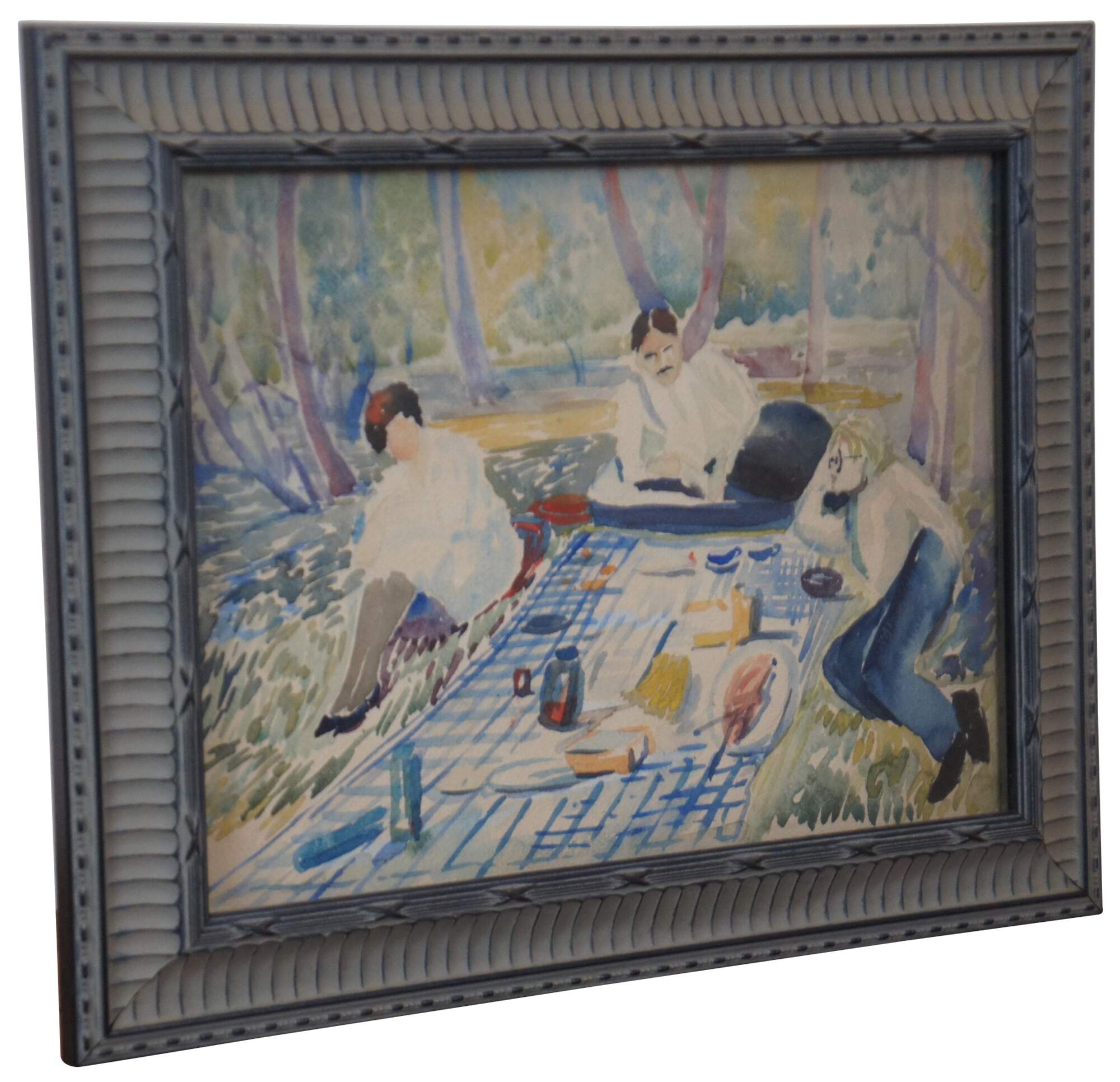 Vintage framed impressionist watercolor folk painting showing a park landscape with three figures having a picnic.