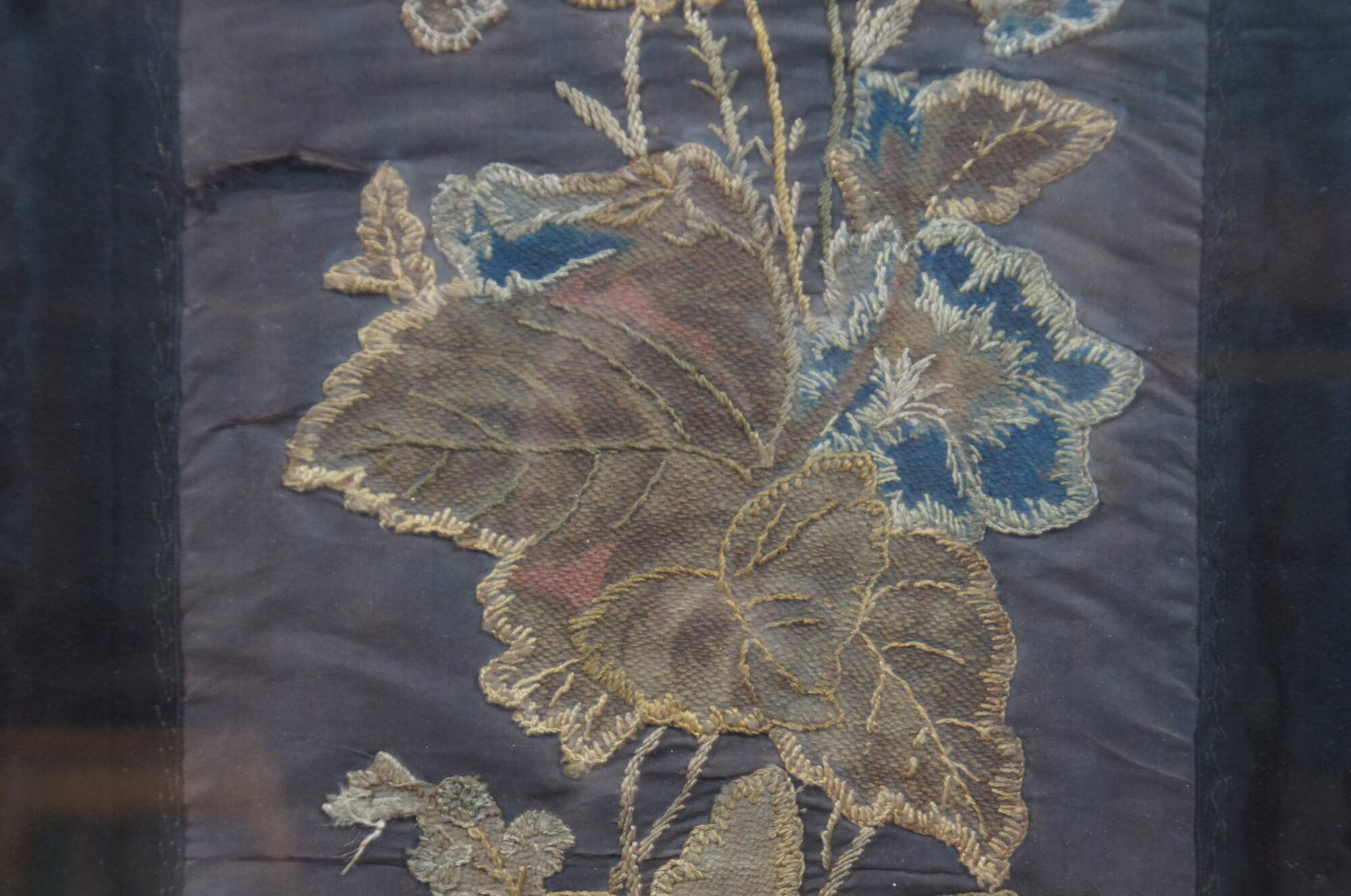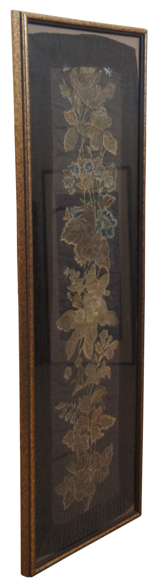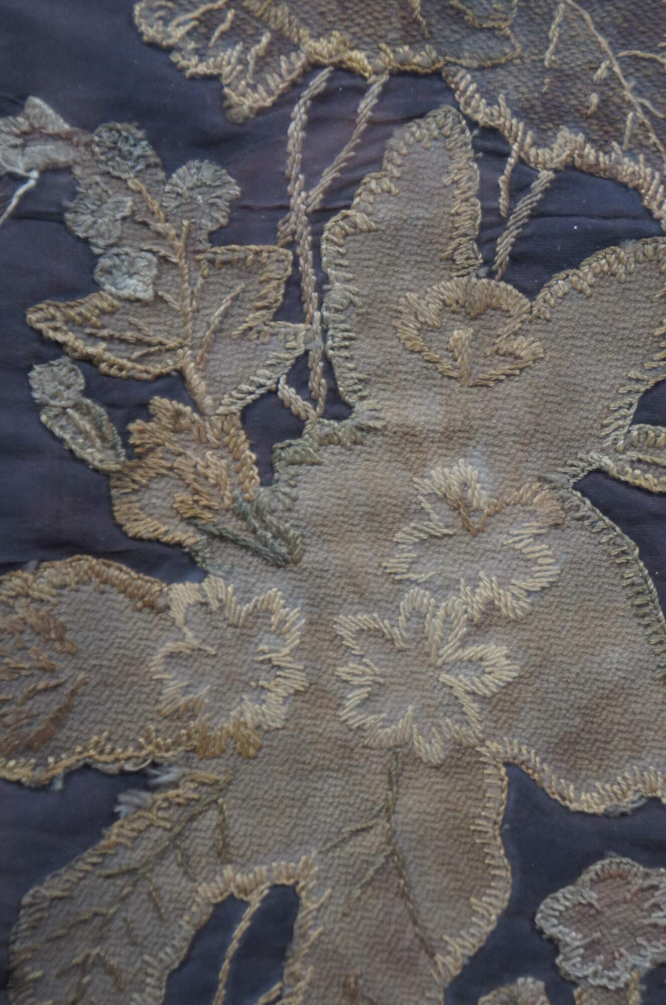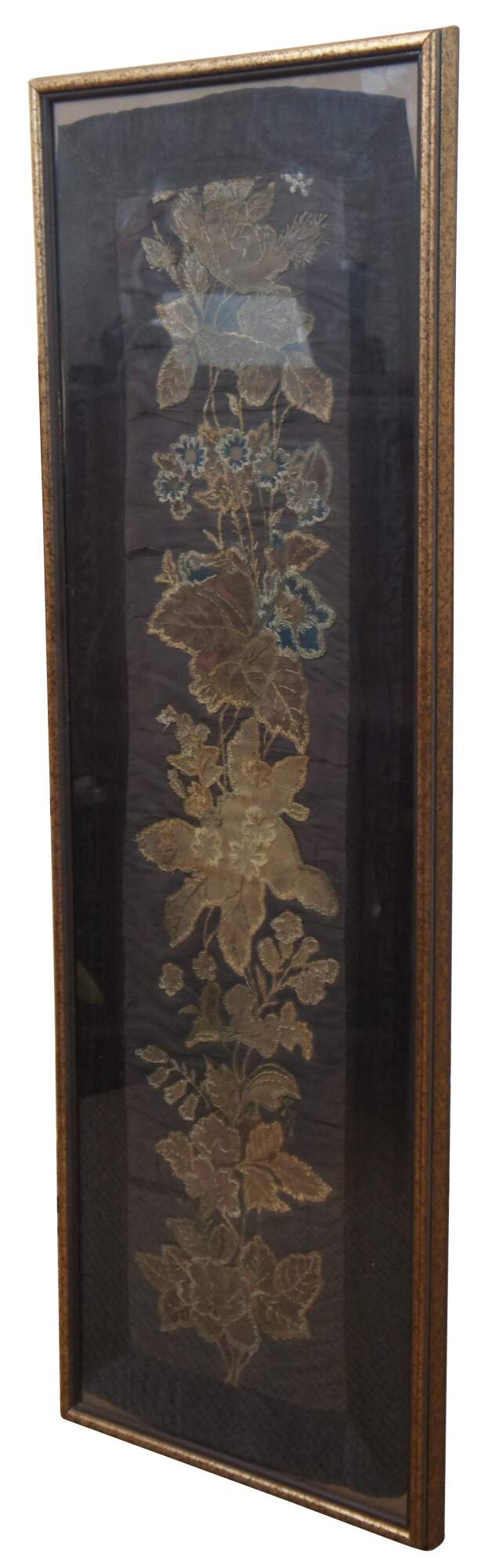 Large antique framed Chinese black silk folk art textile / tapestry panel or table runner embroidered with brown, gold and blue flowers / leaves.