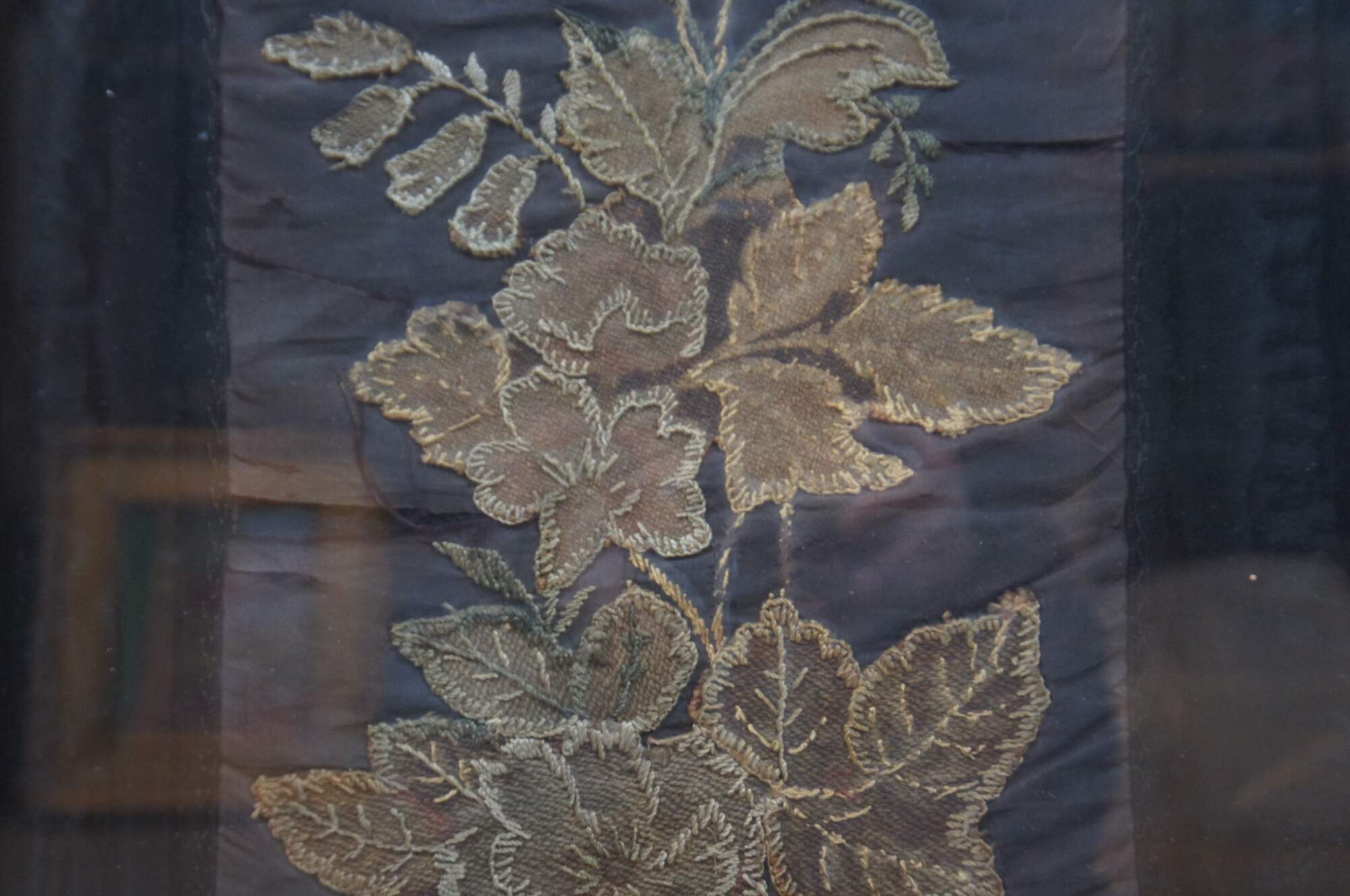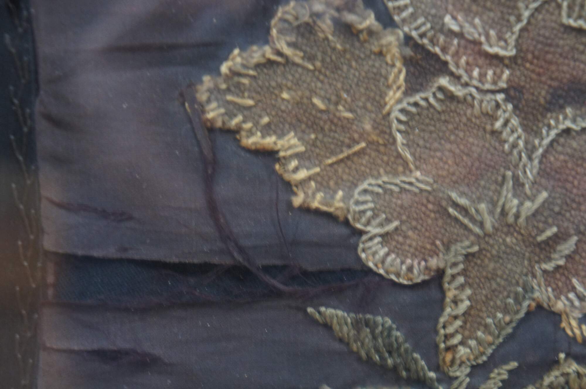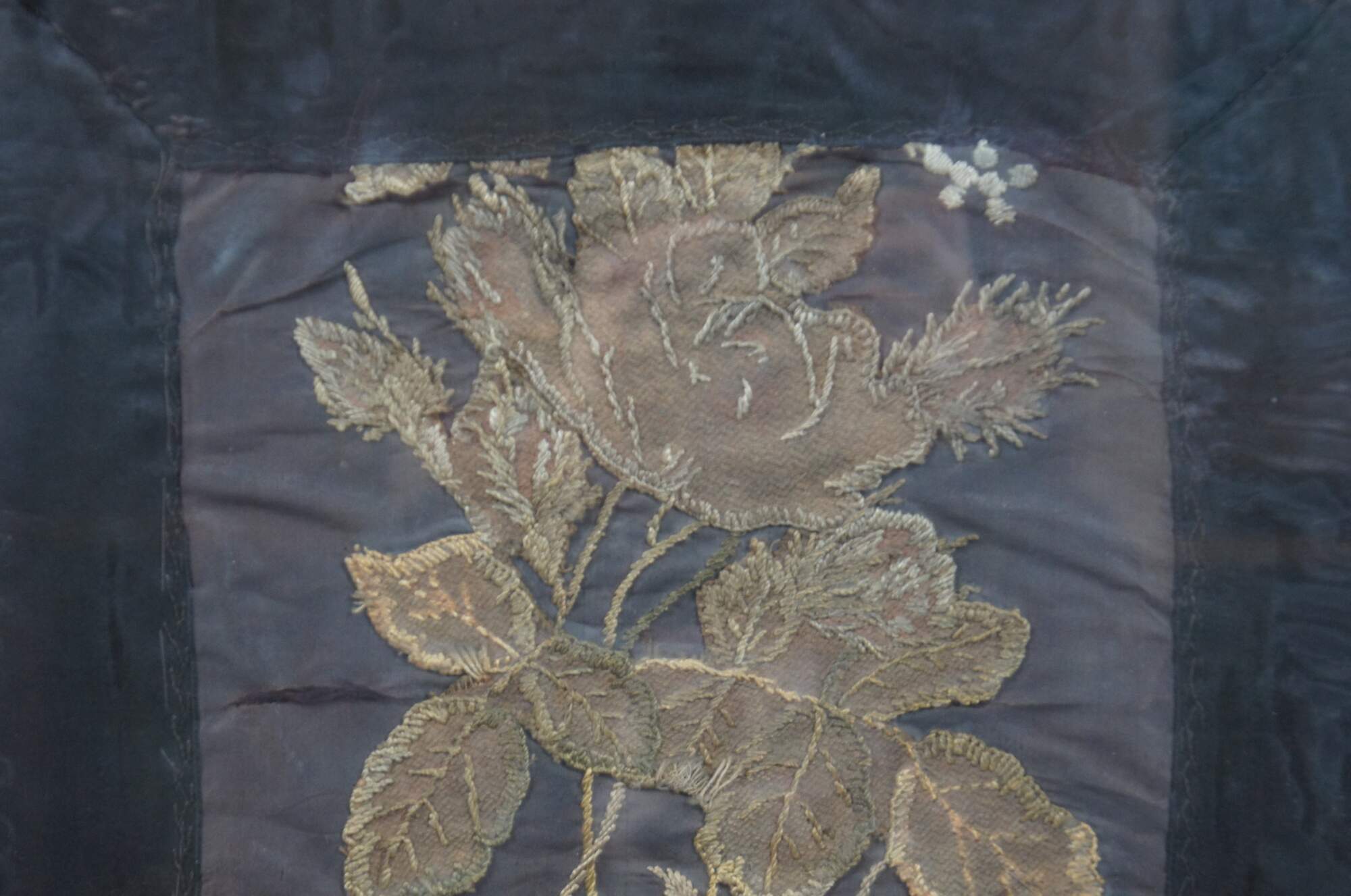 Large antique framed Chinese black silk folk art textile / tapestry panel or table runner embroidered with brown, gold and blue flowers / leaves.