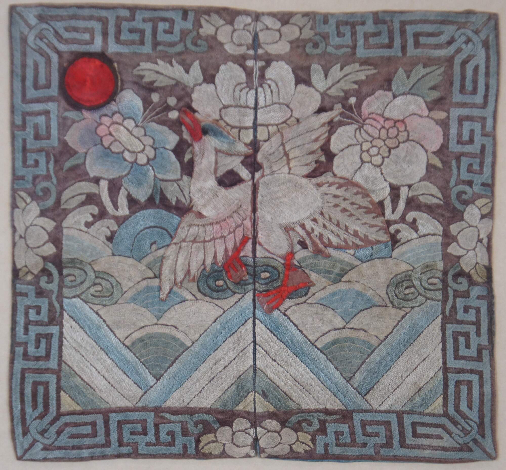 Continued: Rank badges (also called rank insignia or Mandarin squares) were used in China during the Ming (1368–1644) and Qing (1644–1911) dynasties to demonstrate the wearer’s rank. In 1391 new clothing regulations directed court officials to wear decorative squares indicating their rank—birds for civil officials and animals for military officials. During the Qing dynasty rank badge design was regulated, and certain creatures were associated with specific ranks. Qing badges depict a representation of the universe with a landscape and a central creature, surrounded by clouds and facing the sun. The sun represented the emperor and this composition showed the official’s loyalty to him. An official’s wife wore rank badges that mirrored her husband’s. Most of the examples in CMA’s collection depict creatures facing a sun on the left. Attached to the front and back of a ceremonial robe, rank badges were woven in pairs with identical imagery. One was divided vertically up the center to attach to the front of a robe with a center opening. Rank badges are generally square or rectangular, although round examples exist. They are typically satin weave or slit tapestry weave (kesi) silk. Satin weave badges often have dark backgrounds with silk and/or metal thread embroidery. Some badges incorporate peacock feathers or beads. Late in the Qing dynasty appliqué replaced embroidery to allow for quicker production and a change in rank.