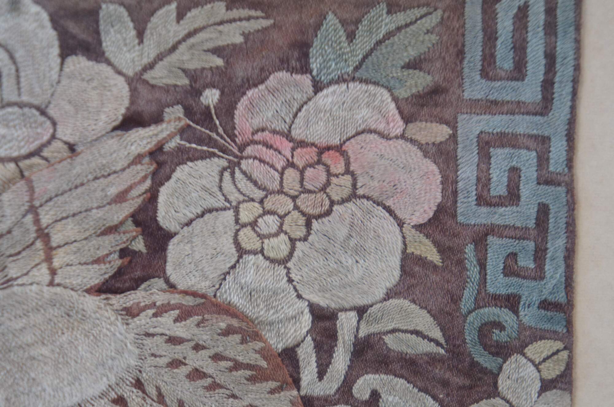 Pair of antique Chinese Qing Dynasty silk textile / tapestry court rank military buzi badges or panels embroidered with a scene of a dancing Manchurian Crane / bird in front of flowers, looking towards a red sun. Framed in faux bamboo.