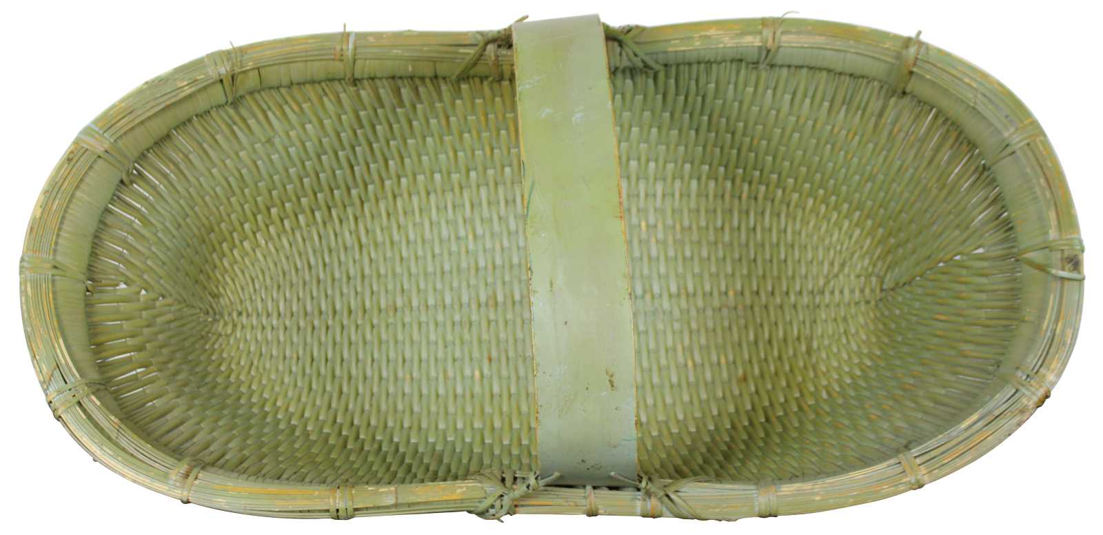 Large antique American country farmhouse oval shaped, green folk painted, tightly woven harvest or Moses basket with wide, sturdy handle.