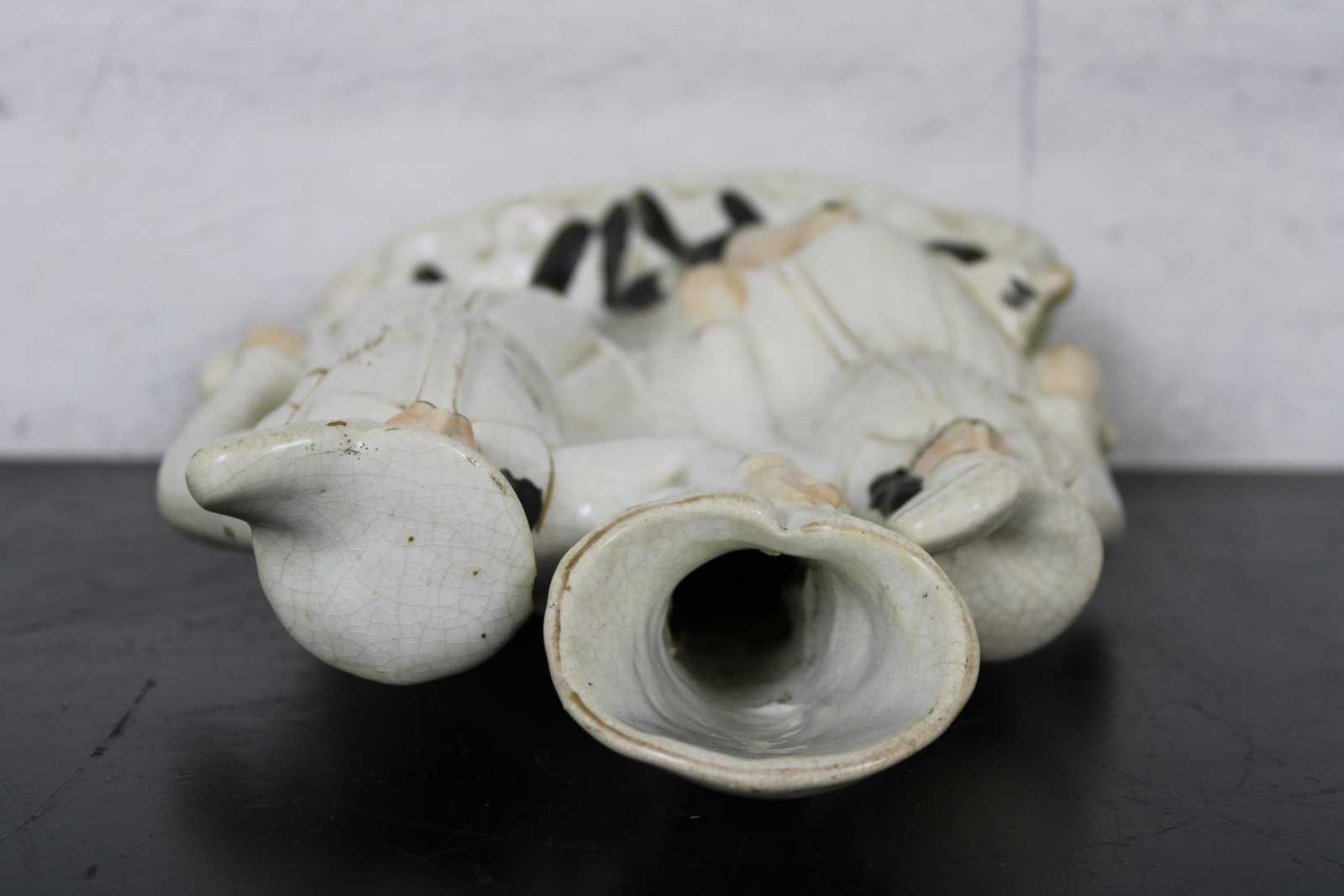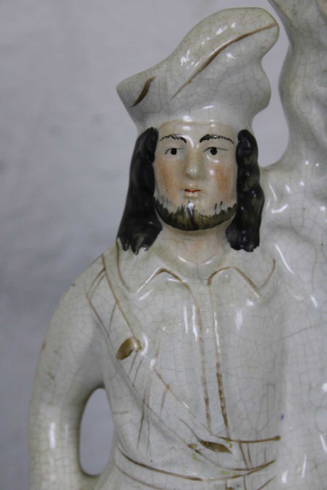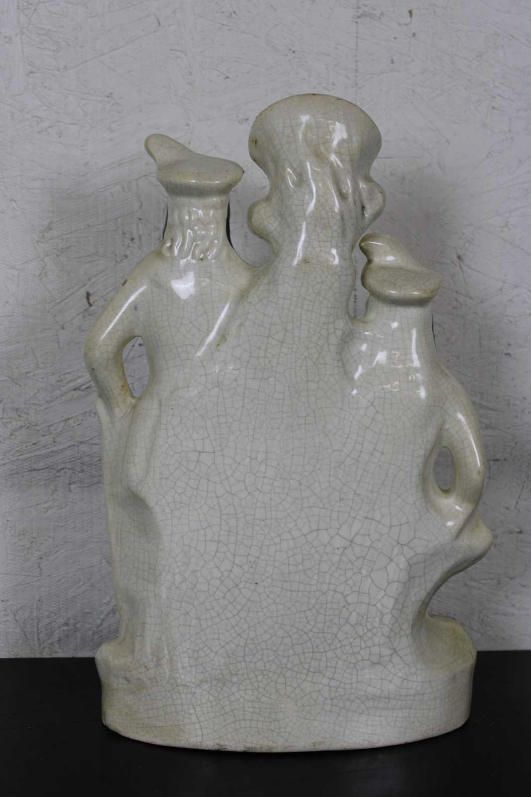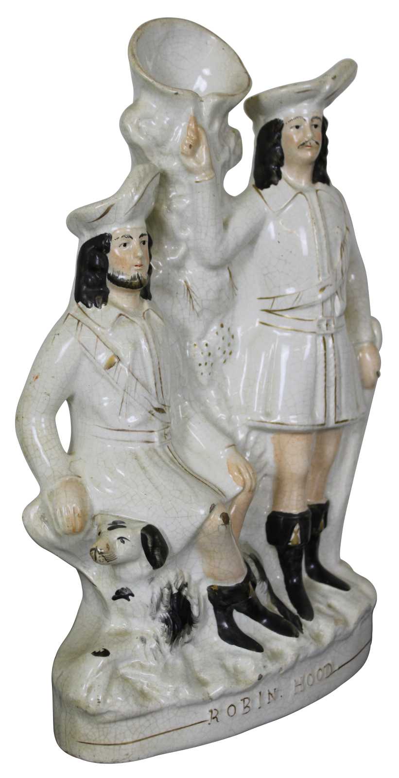 Circa mid 19th century antique Staffordshire English porcelain spill flower vase sculpture showing the folk heroes Robin Hood and Little John with a dog.