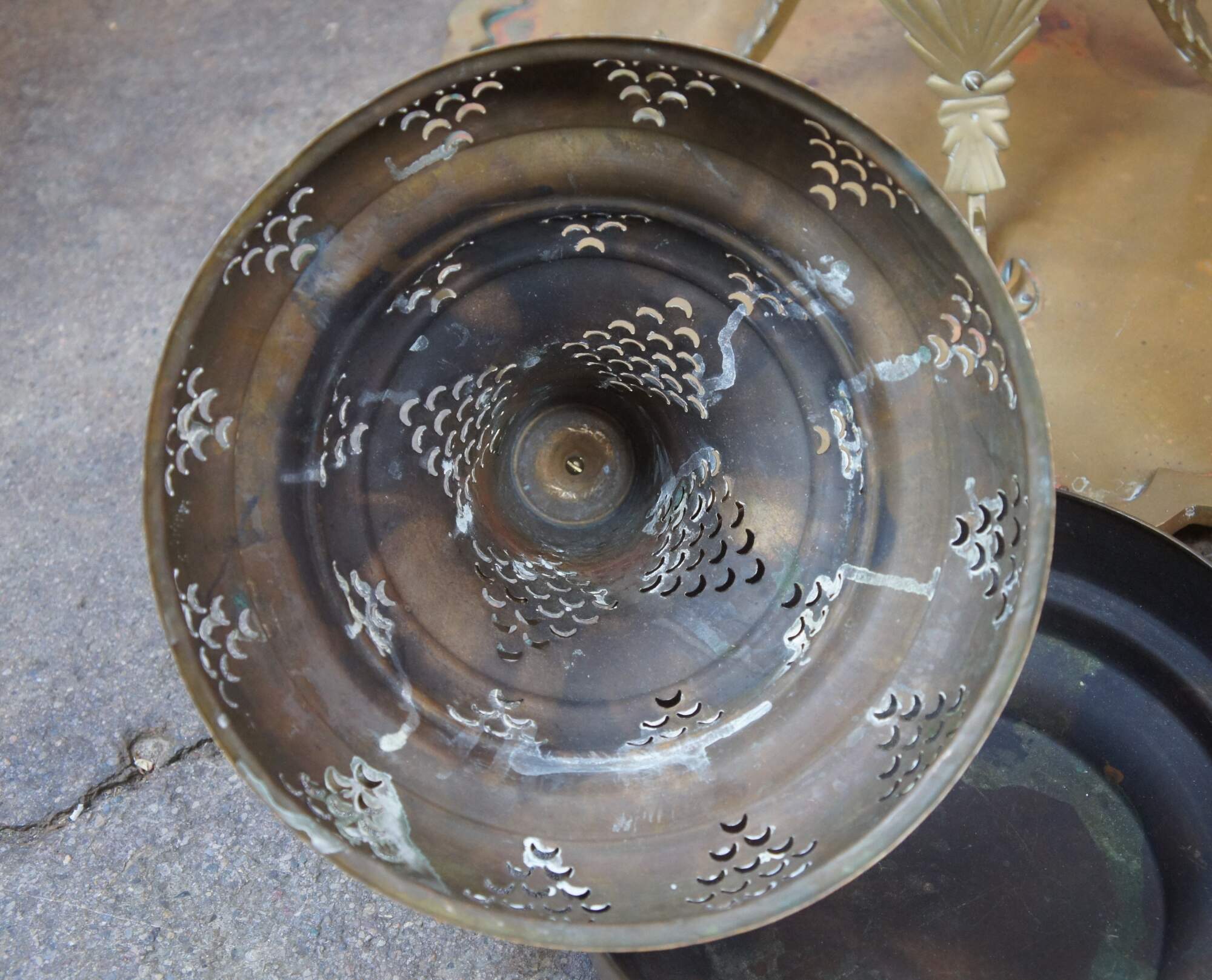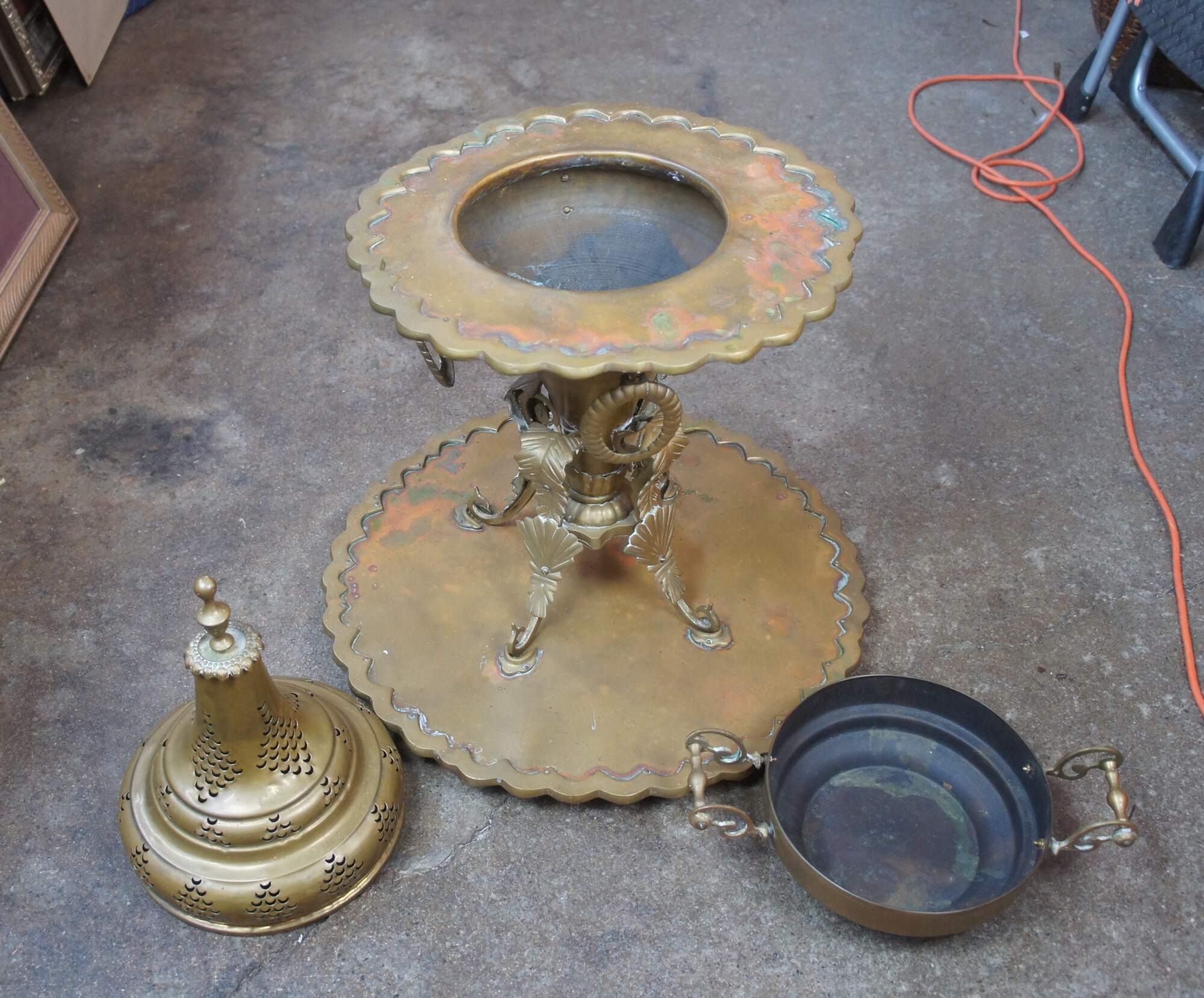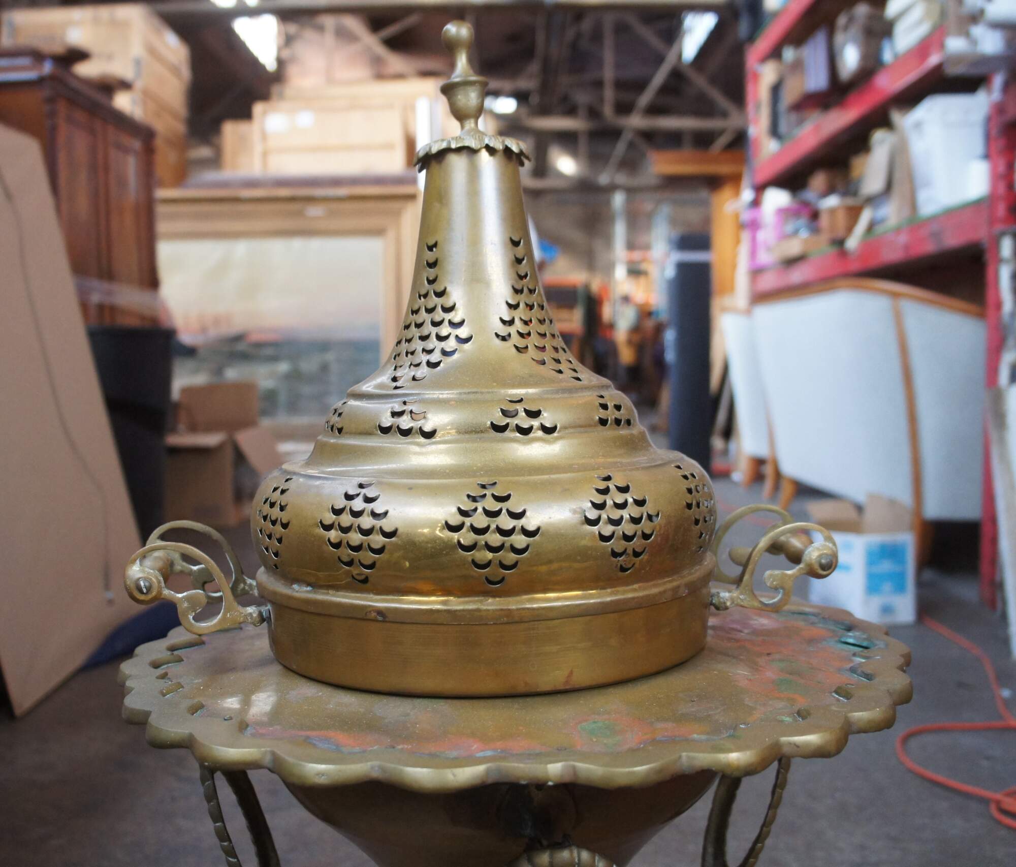 20th century tent warmer or brazier from the Middle East, Turkey or Morocco. Features reticulated brass/copper with separating pieces and wood reinforced base.