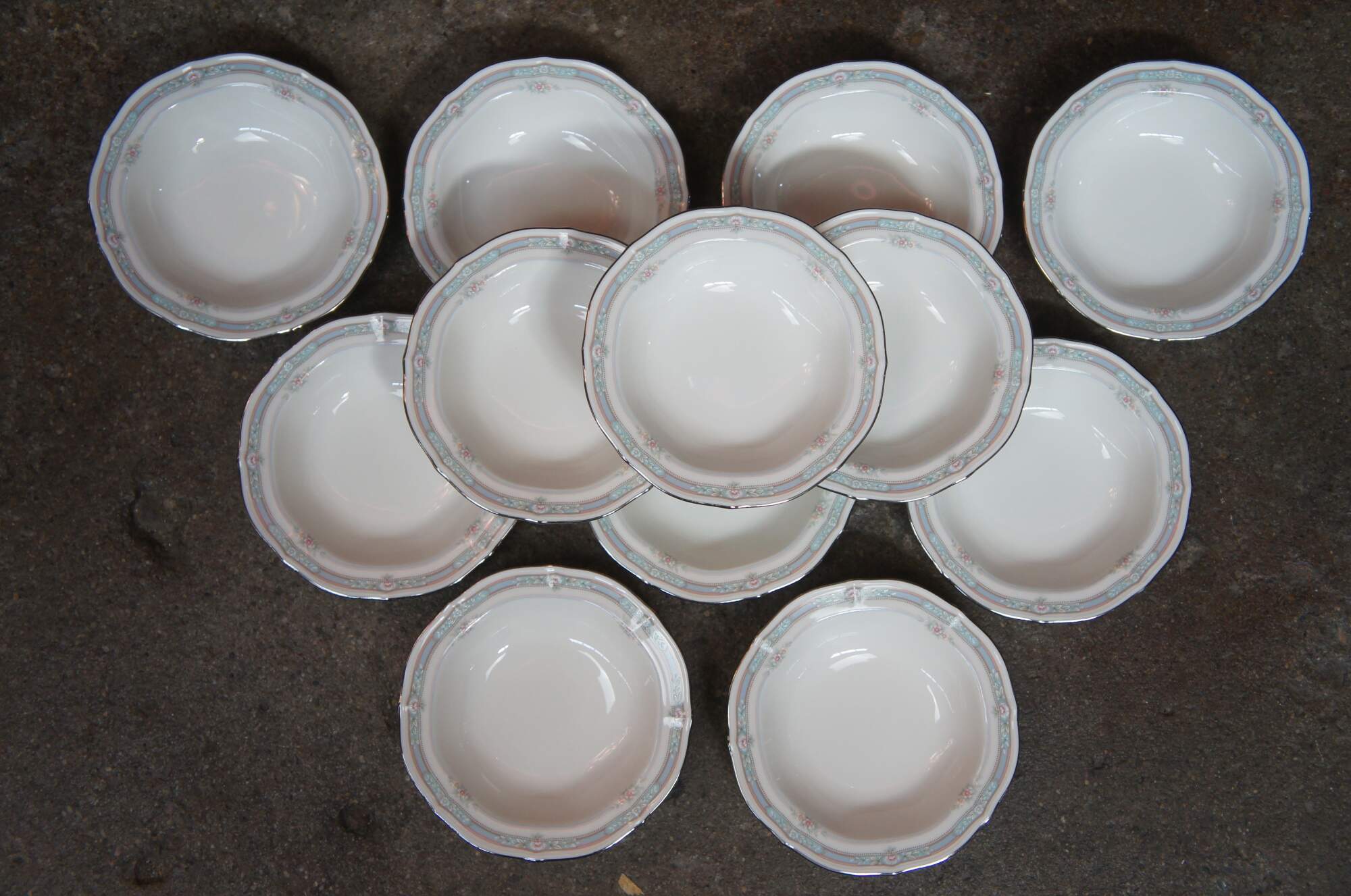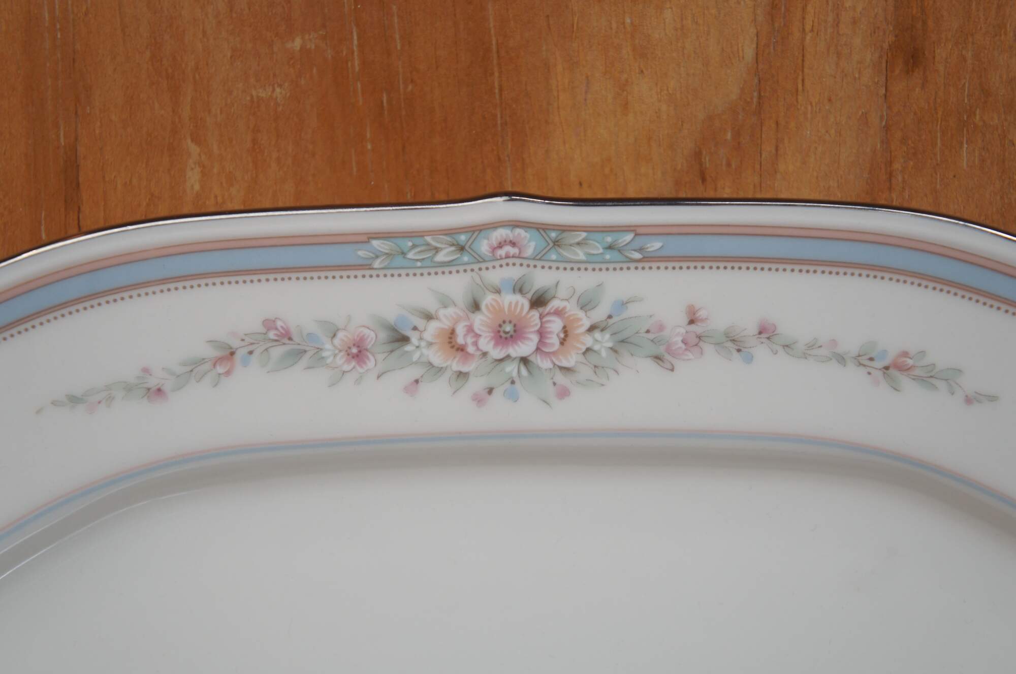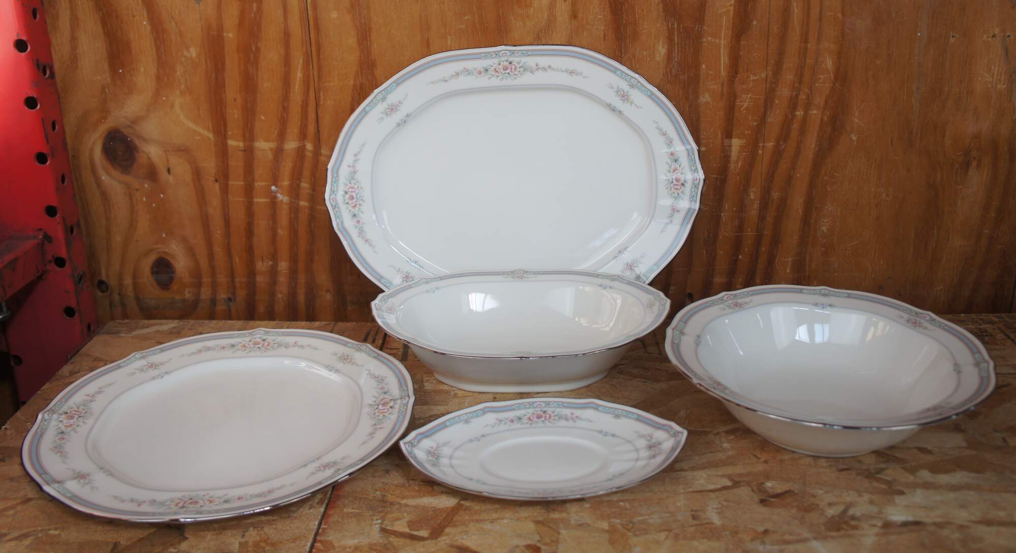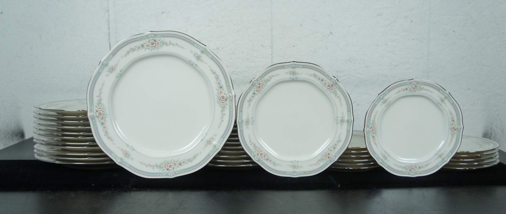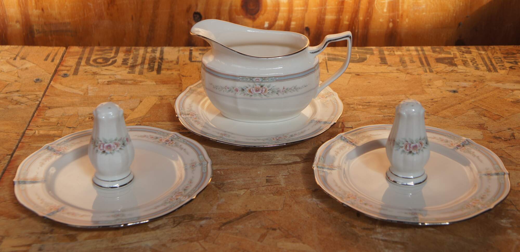 94 piece china set by Noritake in the Rothschild floral pattern with teapot, creamer, sugar bowl, shakers, gravy boat, serving bowls, platter, plates, teacups and saucers. 7293, Japan. Service for 12