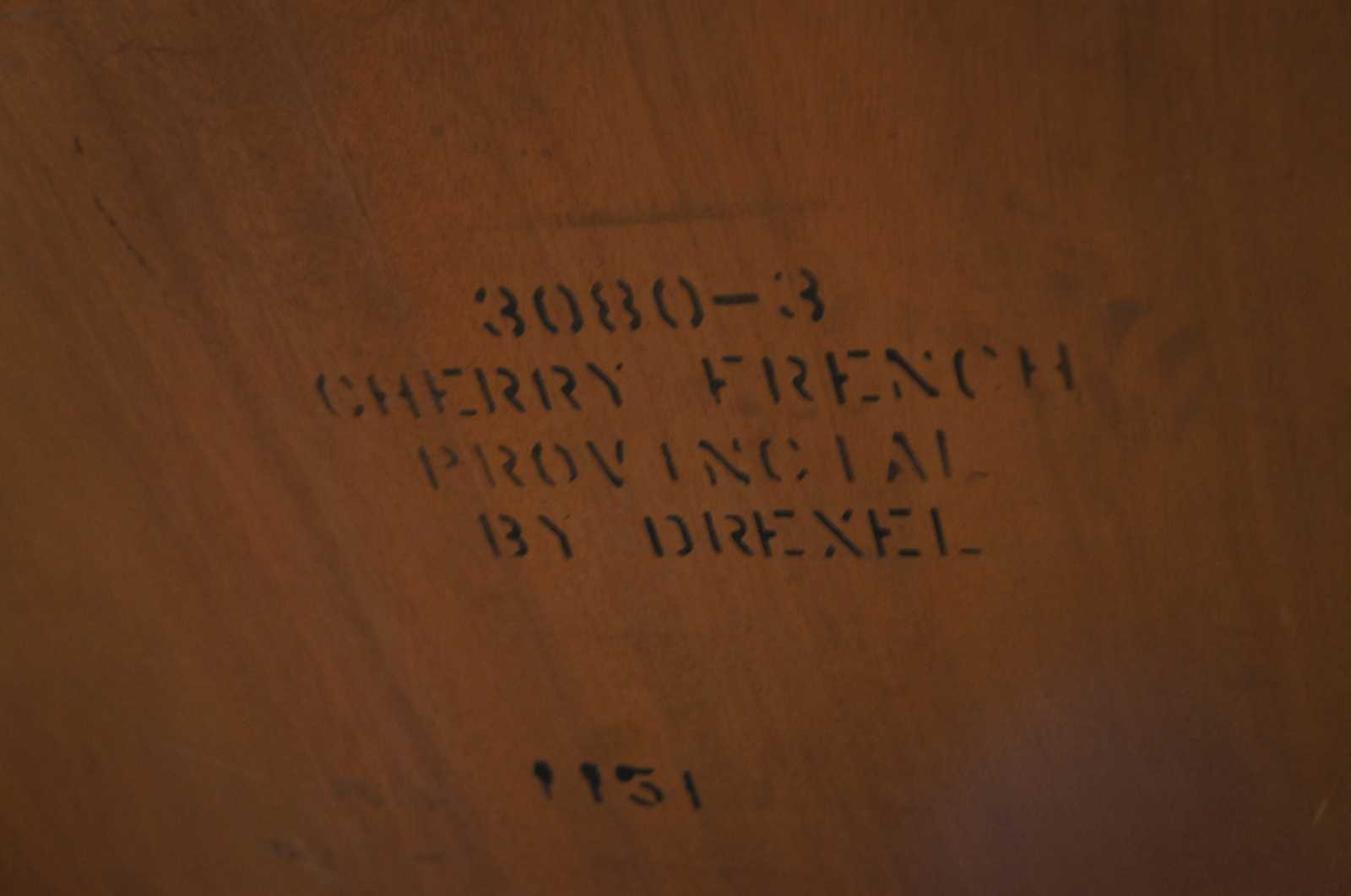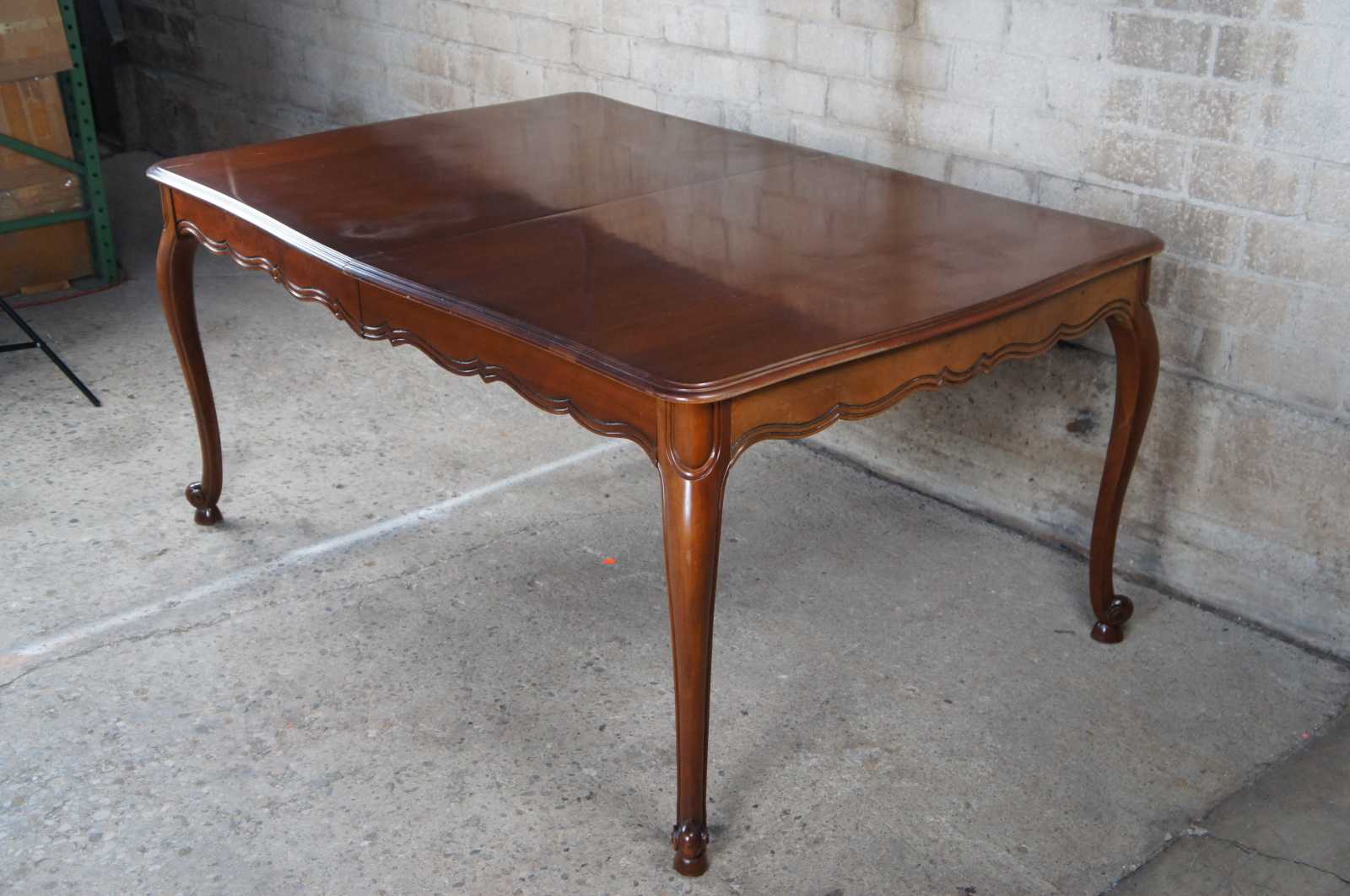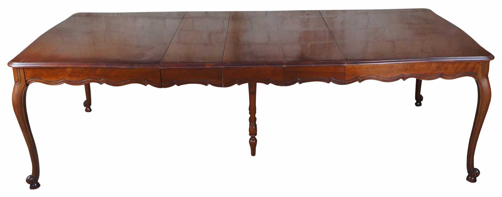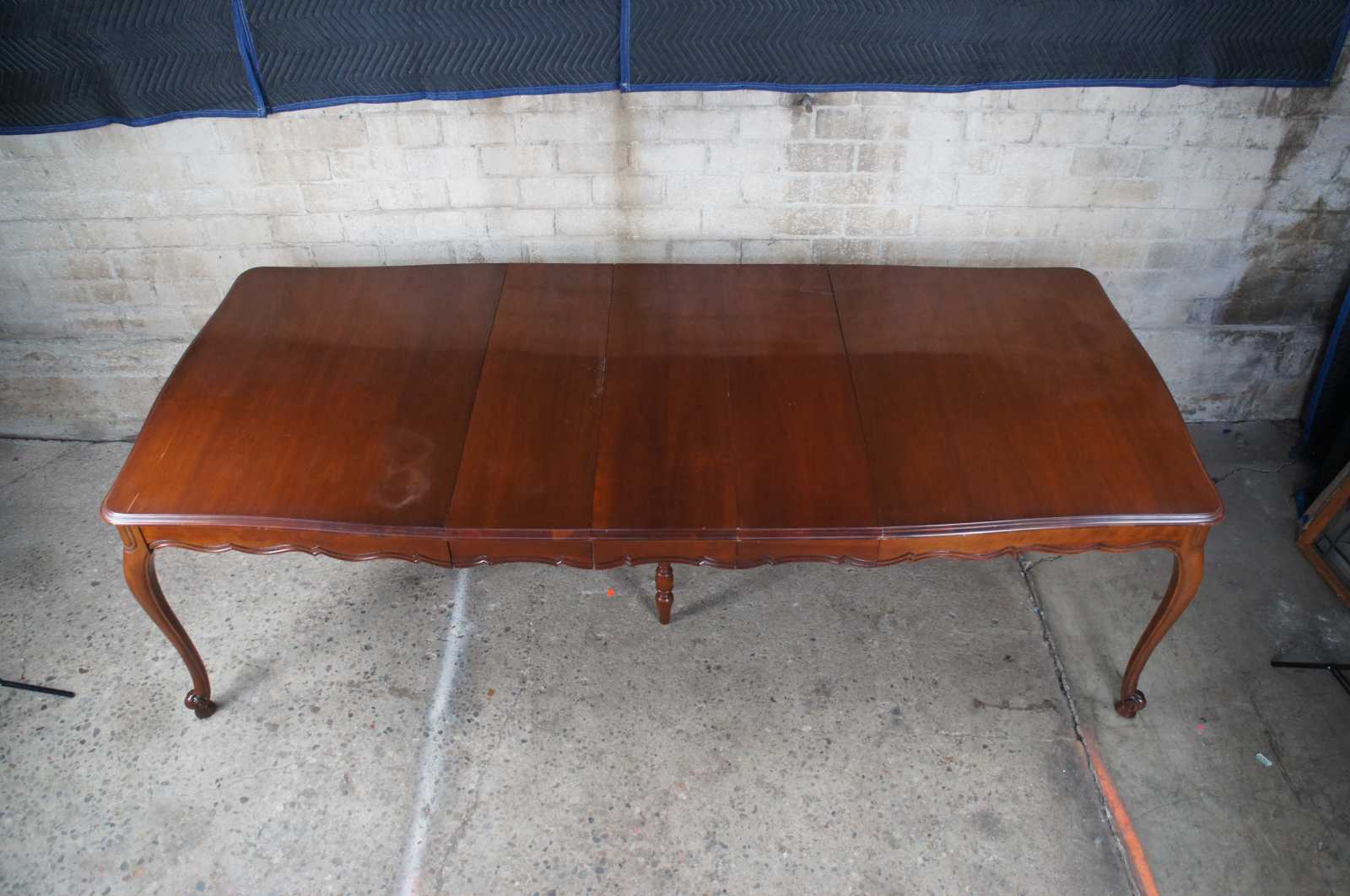 Vintage Drexel Heritage French Provincial dining table. Made of cherry featuring scalloped rectangular form with fluted accents, cabriole legs and three extending leaves