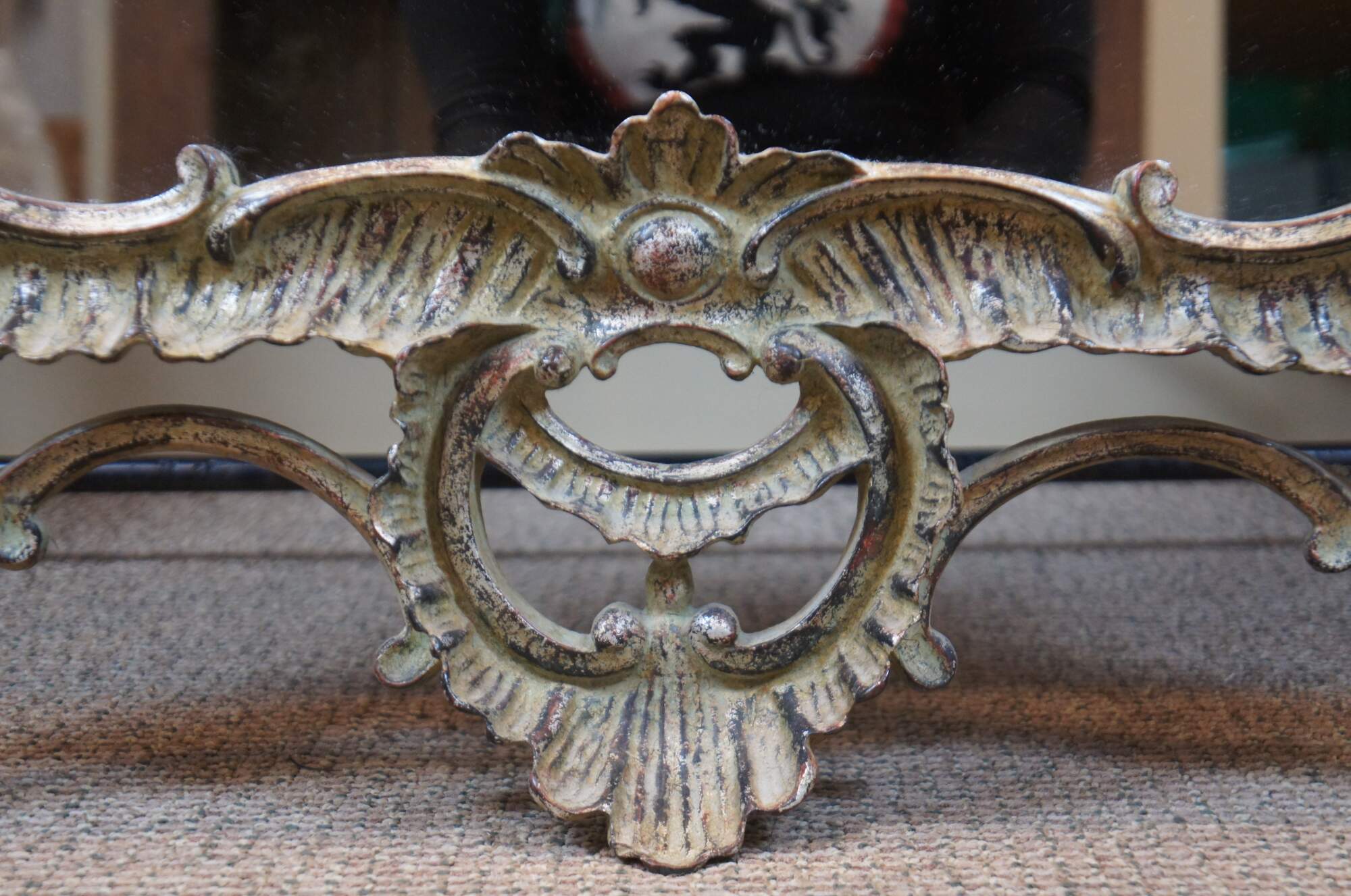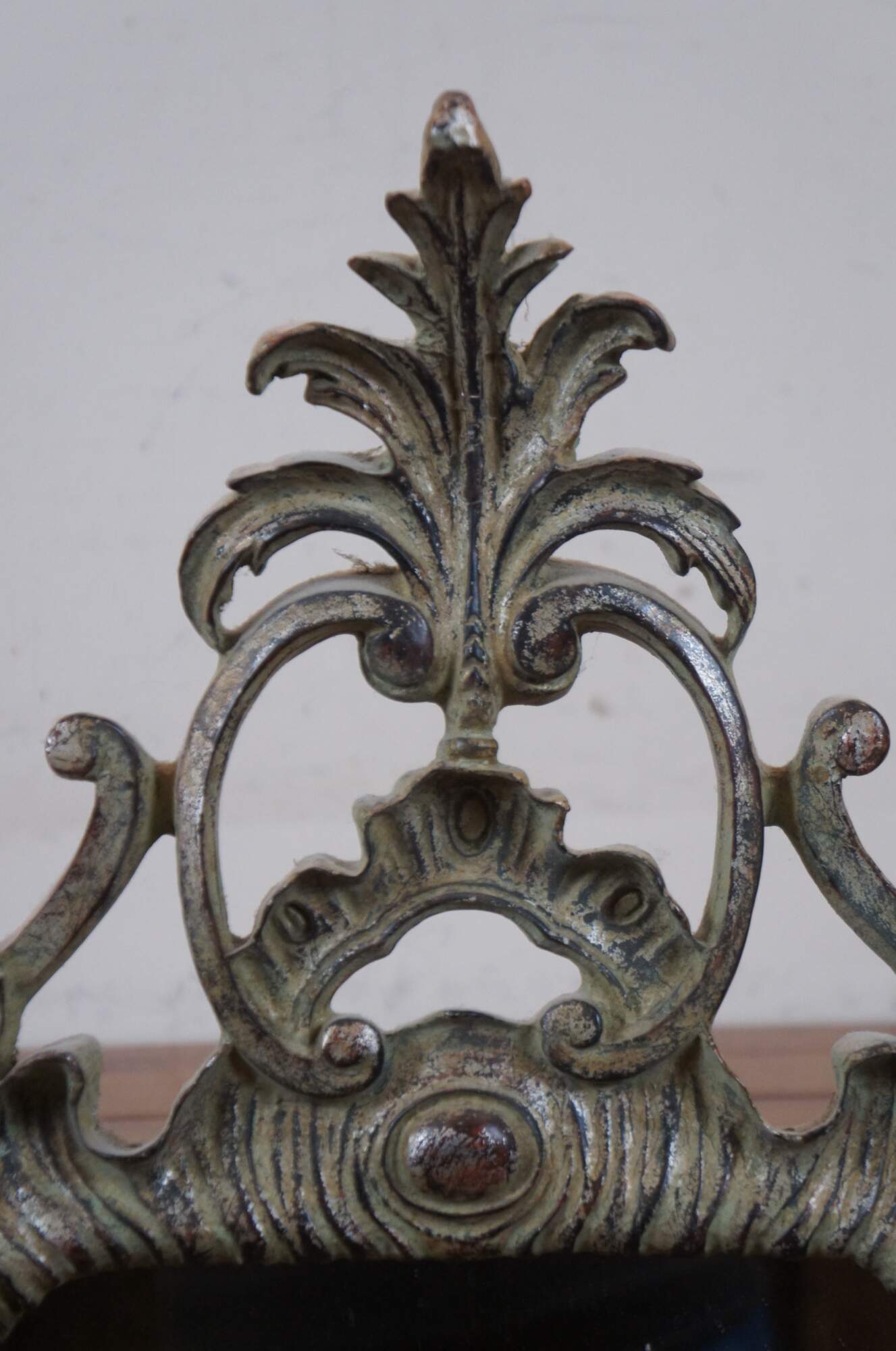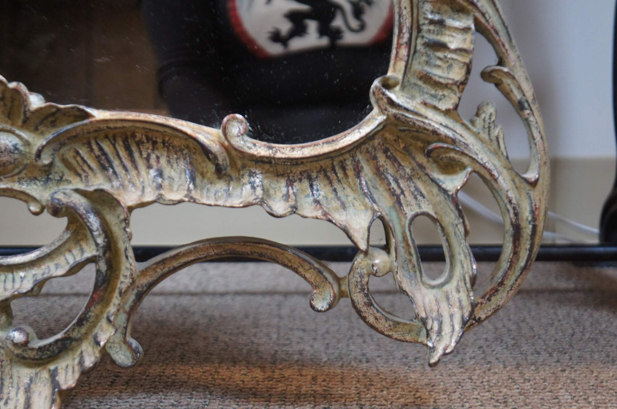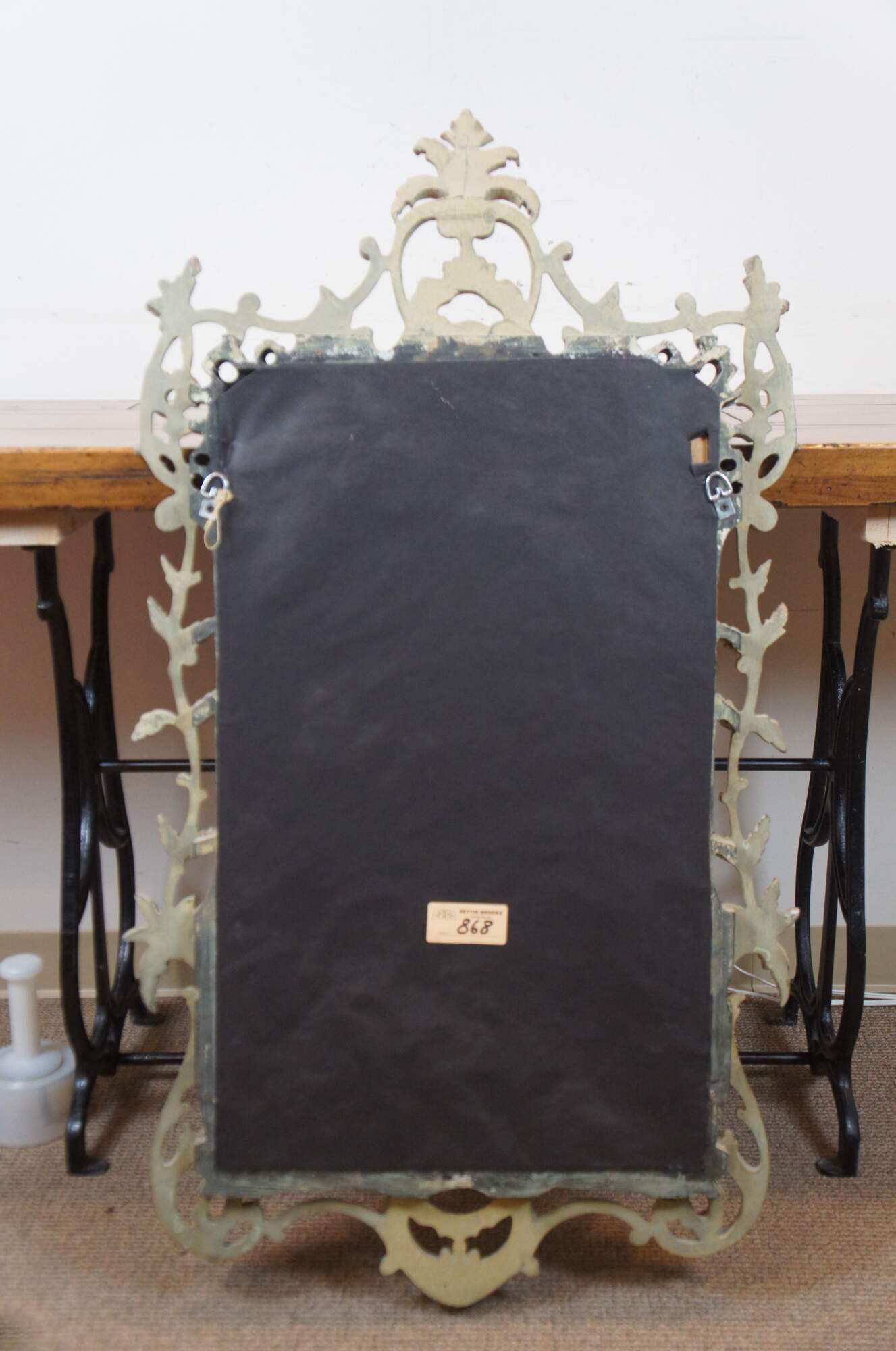 Large vintage Baroque style wall mirror by Bettis Brooke, painted with a distressed, aged patina over pierced and swirling branches and leaves.