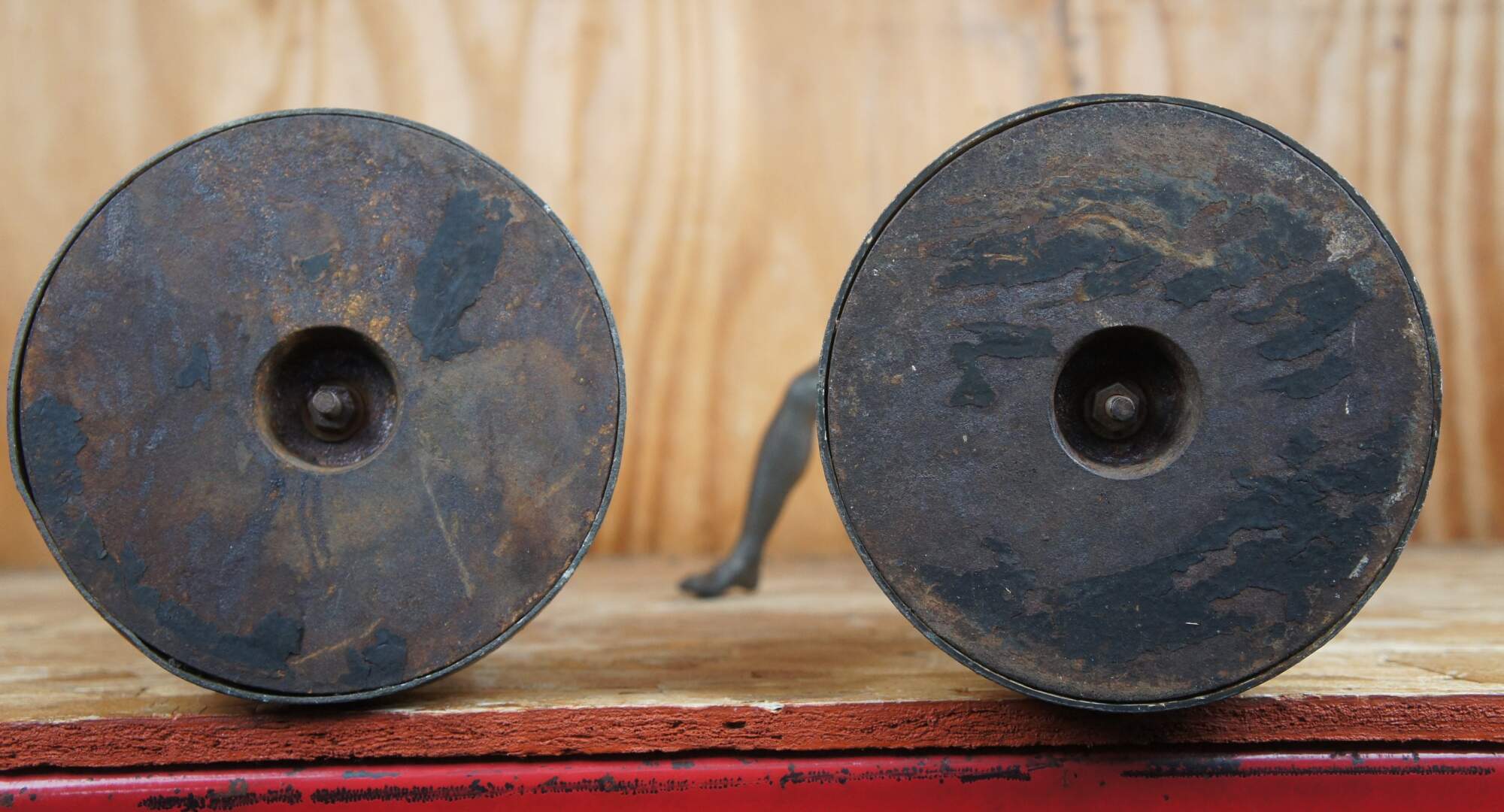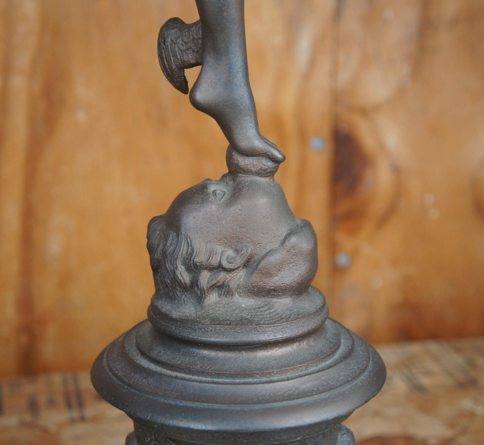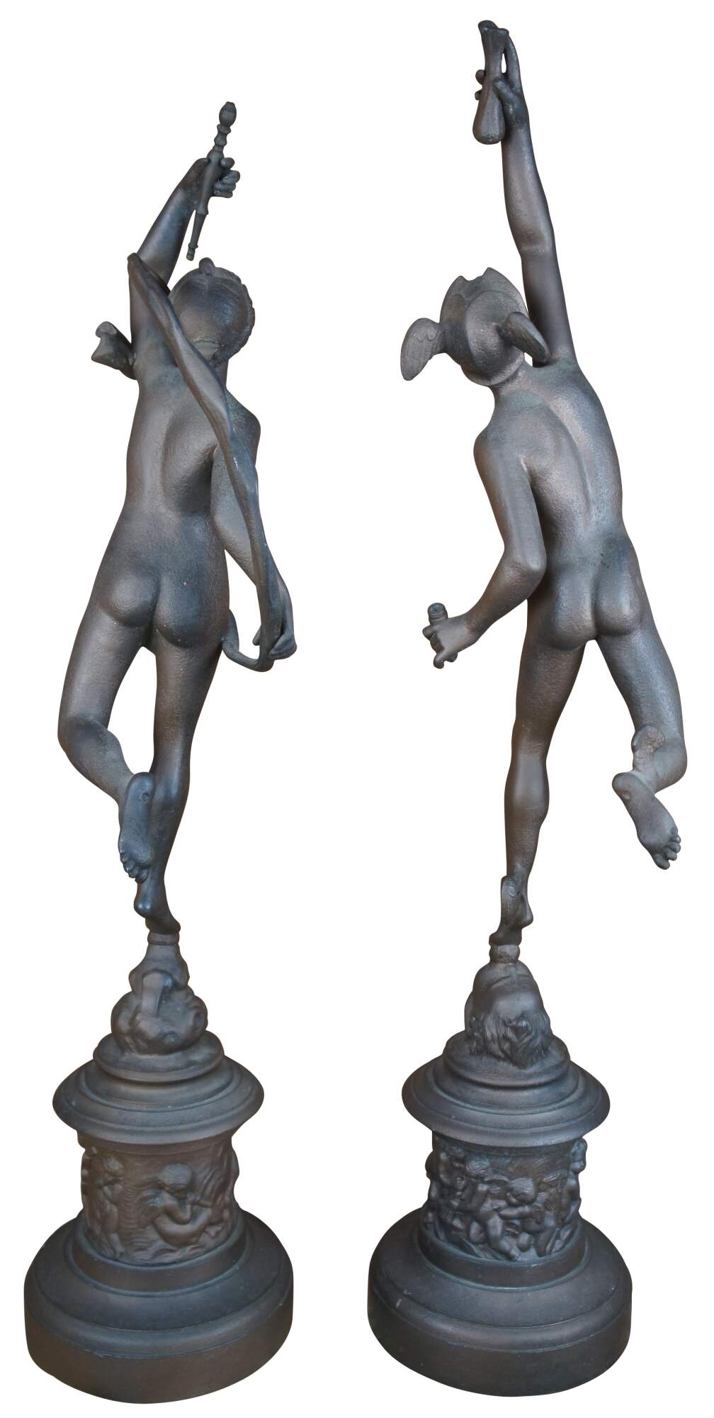 This metal sculpture of Fortuna, the goddess of fortune and luck, and Mercury the messenger of the Gods, after the famous Renaissance statue in Florence, Italy. The renowned sculptor of the original, Giovanni de Giambologna lived 1529-1608.This antique work of art has a rich original deep chocolate patina. Both are raised on high relief circular plinths having scenes with cherubic The movement and grace of the figures are unforgettable. circa 1920s.