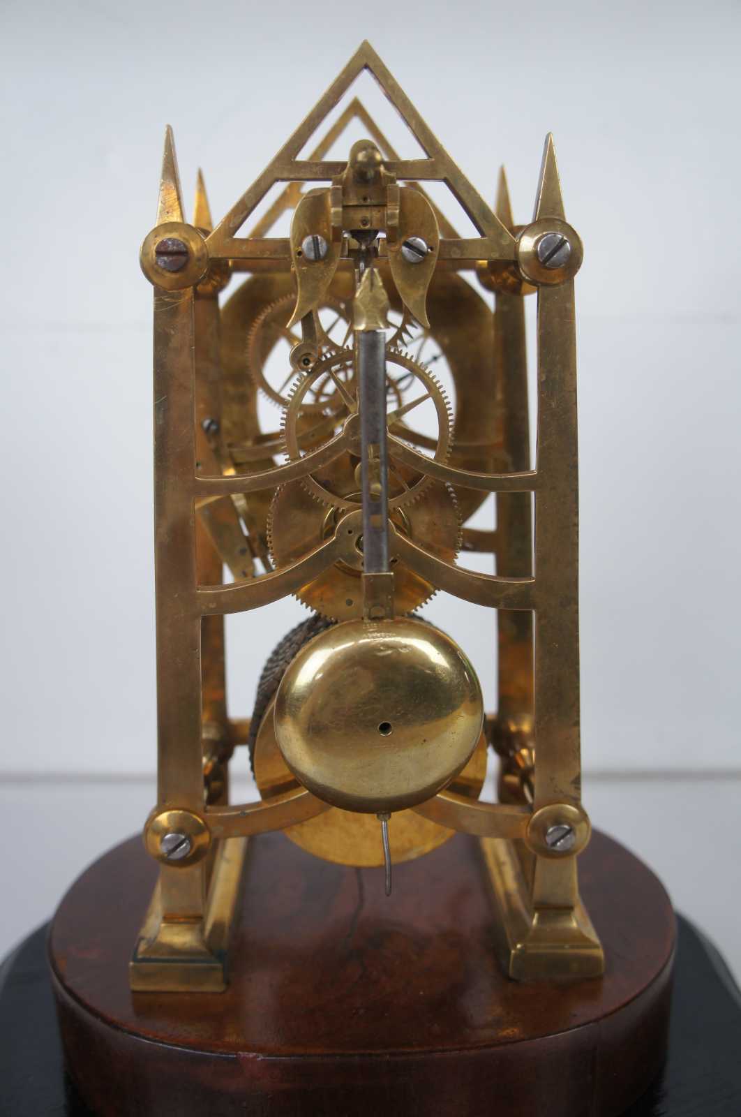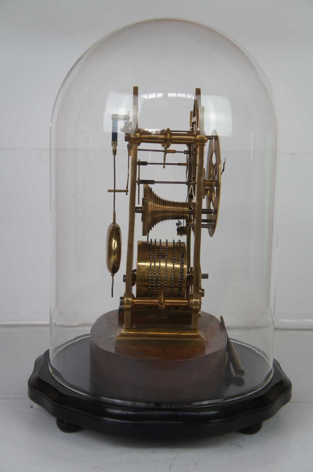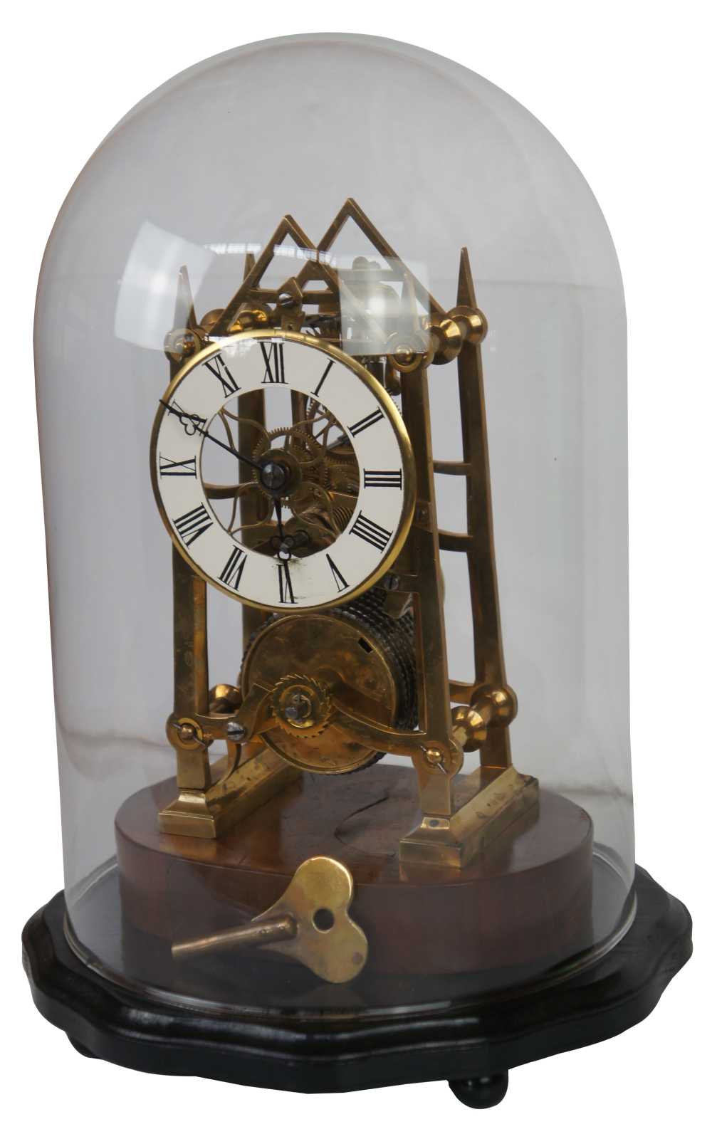 Antique mid 19th century 8 day skeleton clock. Centrally mounted on wood base featuring exposed Fusee movement and protected from dust by a glass dome