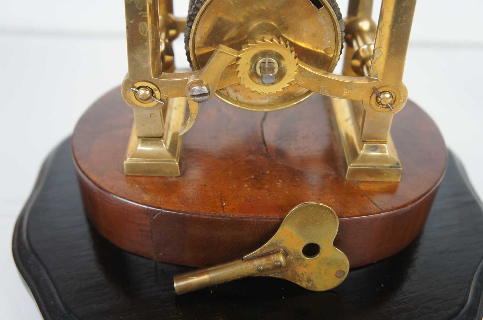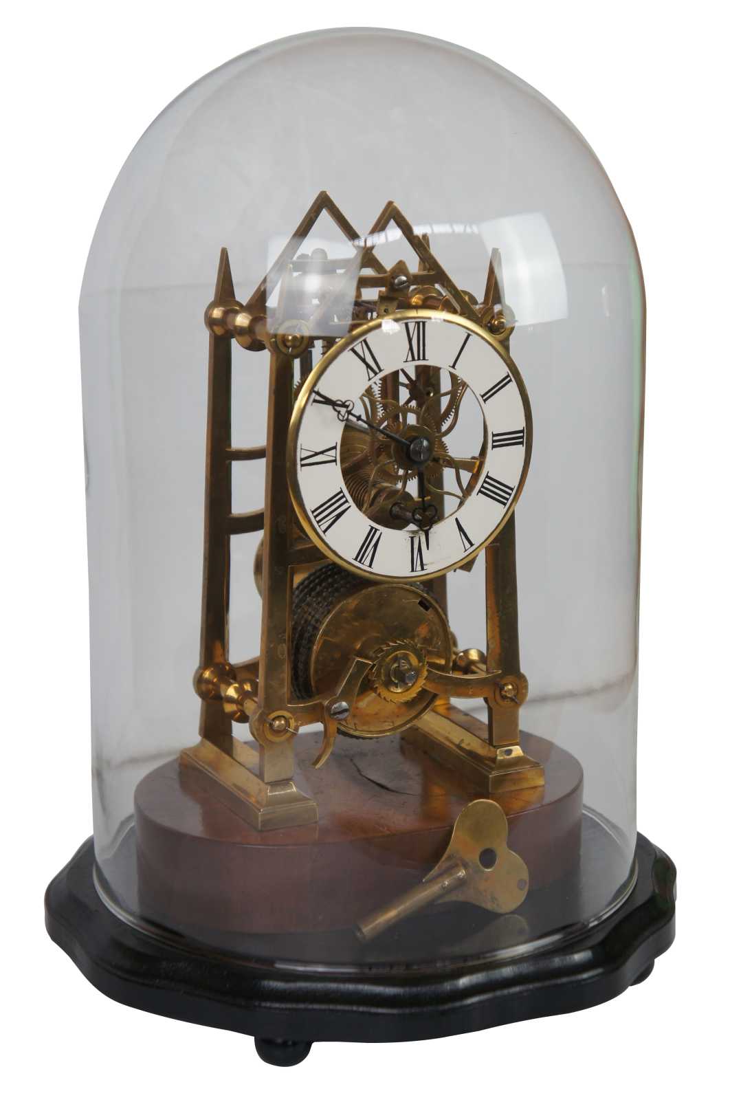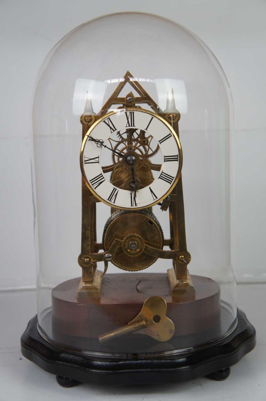 Antique mid 19th century 8 day skeleton clock. Centrally mounted on wood base featuring exposed Fusee movement and protected from dust by a glass dome