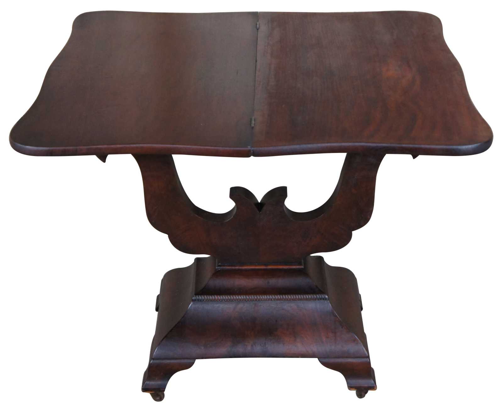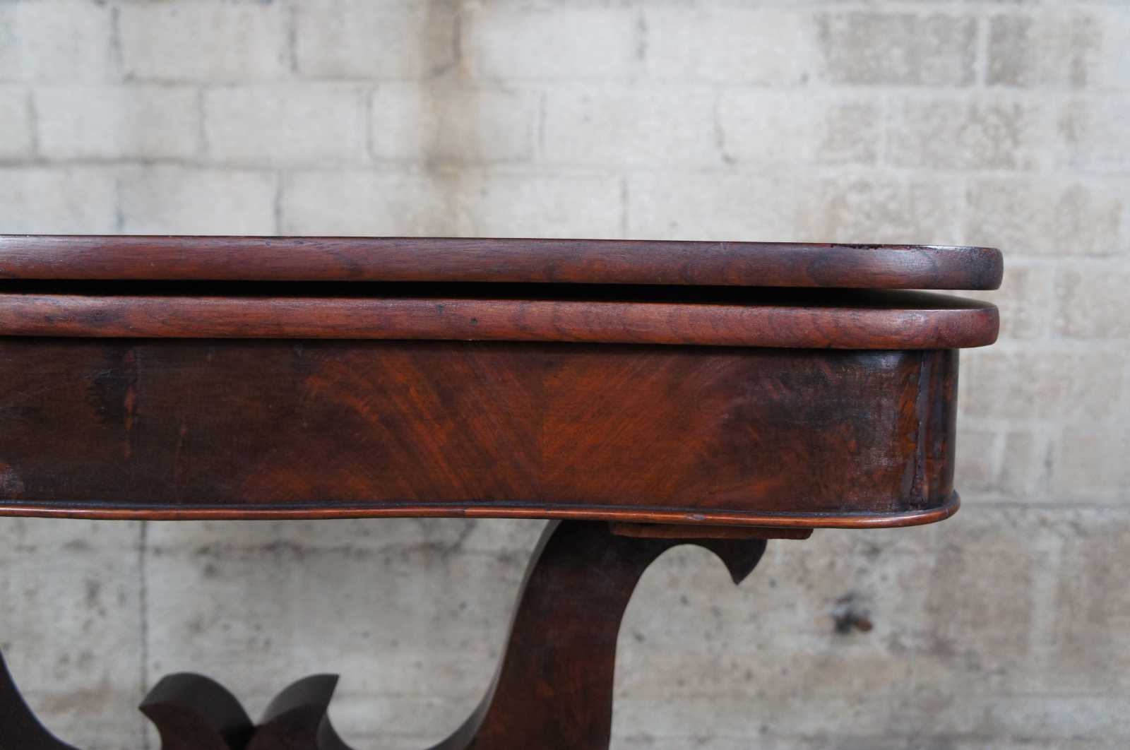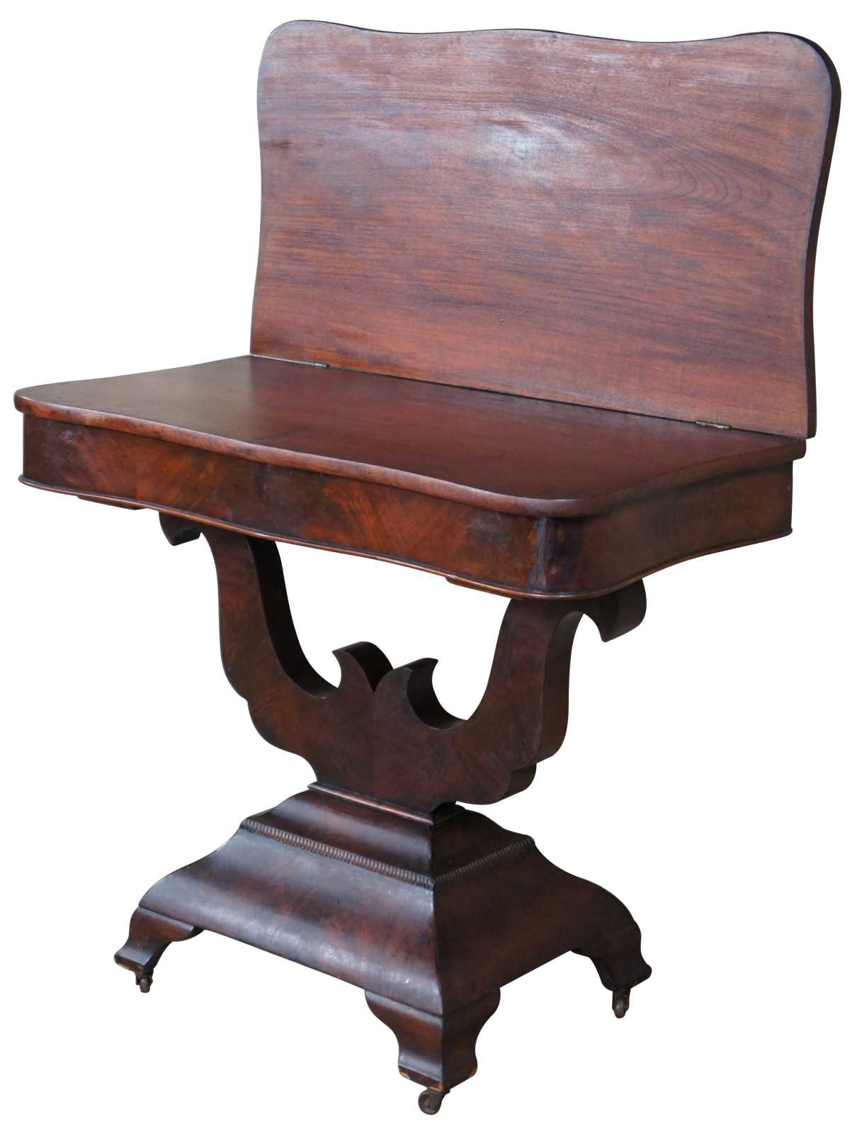 Antique 19th century, mahogany bookmatch veneered game table featuring rectangular serpentine form with a flip top game surface supported by lyre-form base.