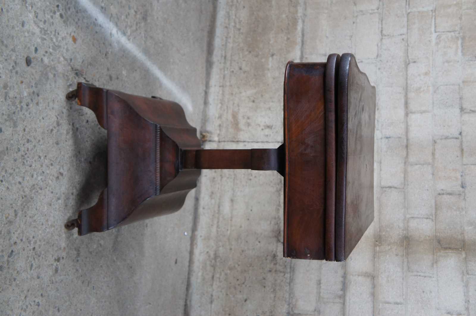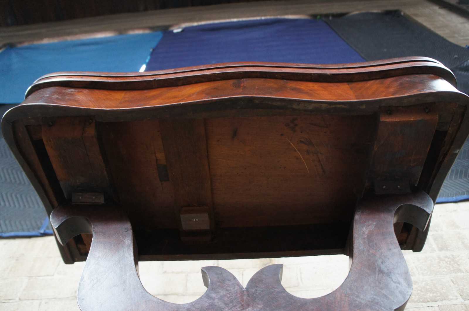 Good antique condition, wear and distressing commensurate with age and use, marking, scuffing, veneer loss, finish wear. Slight gap in top when closed