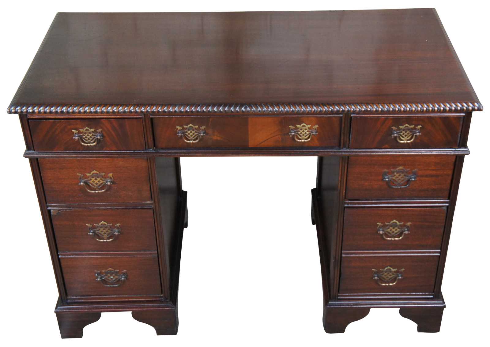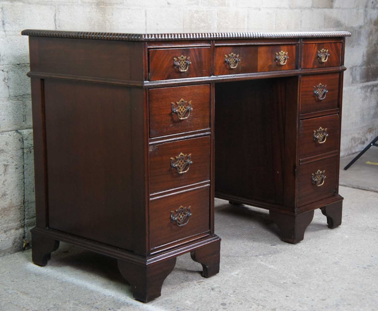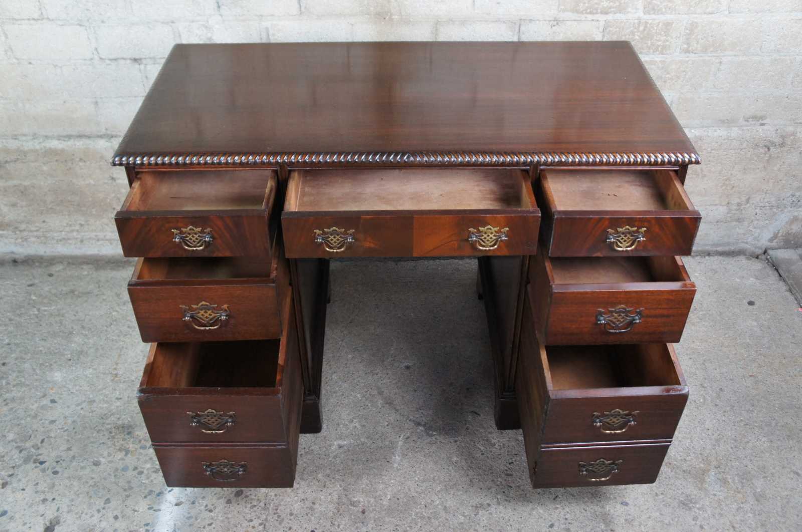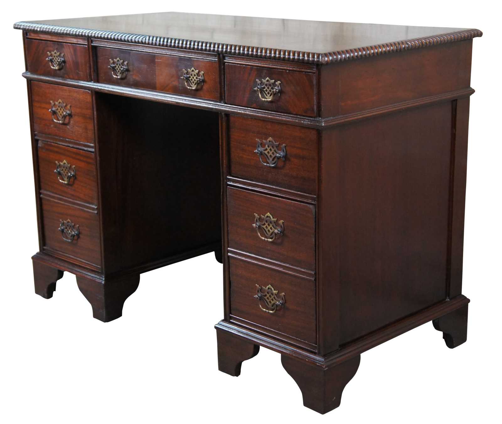 Circa 1940s mahogany writing desk. A rectangular form with gadrooning edge, 7 drawers and brass chippendale style hardware.