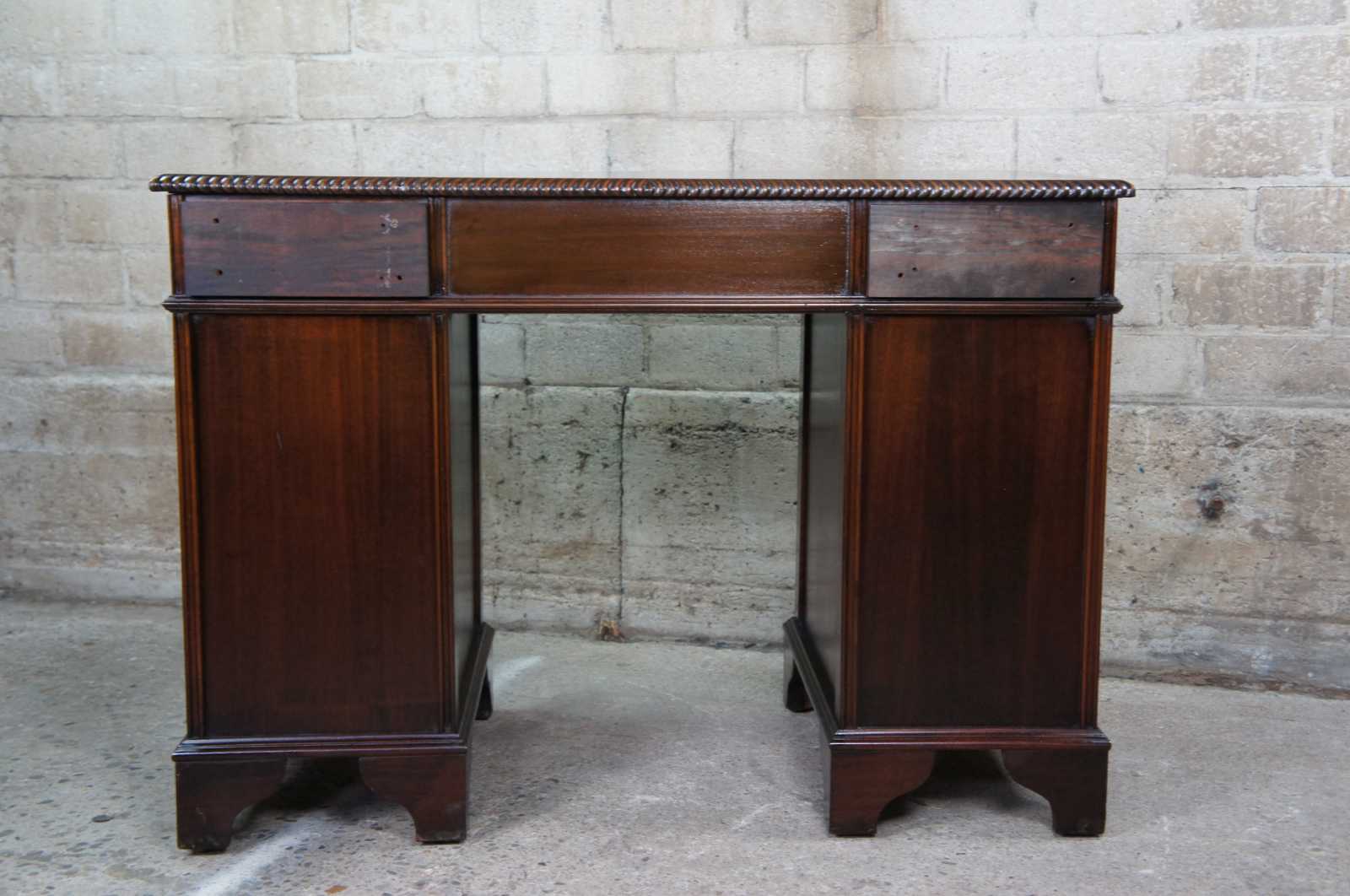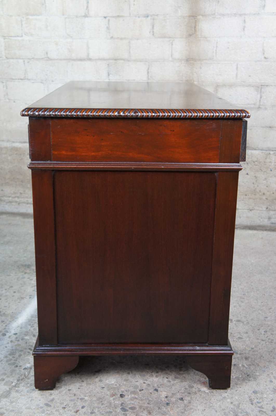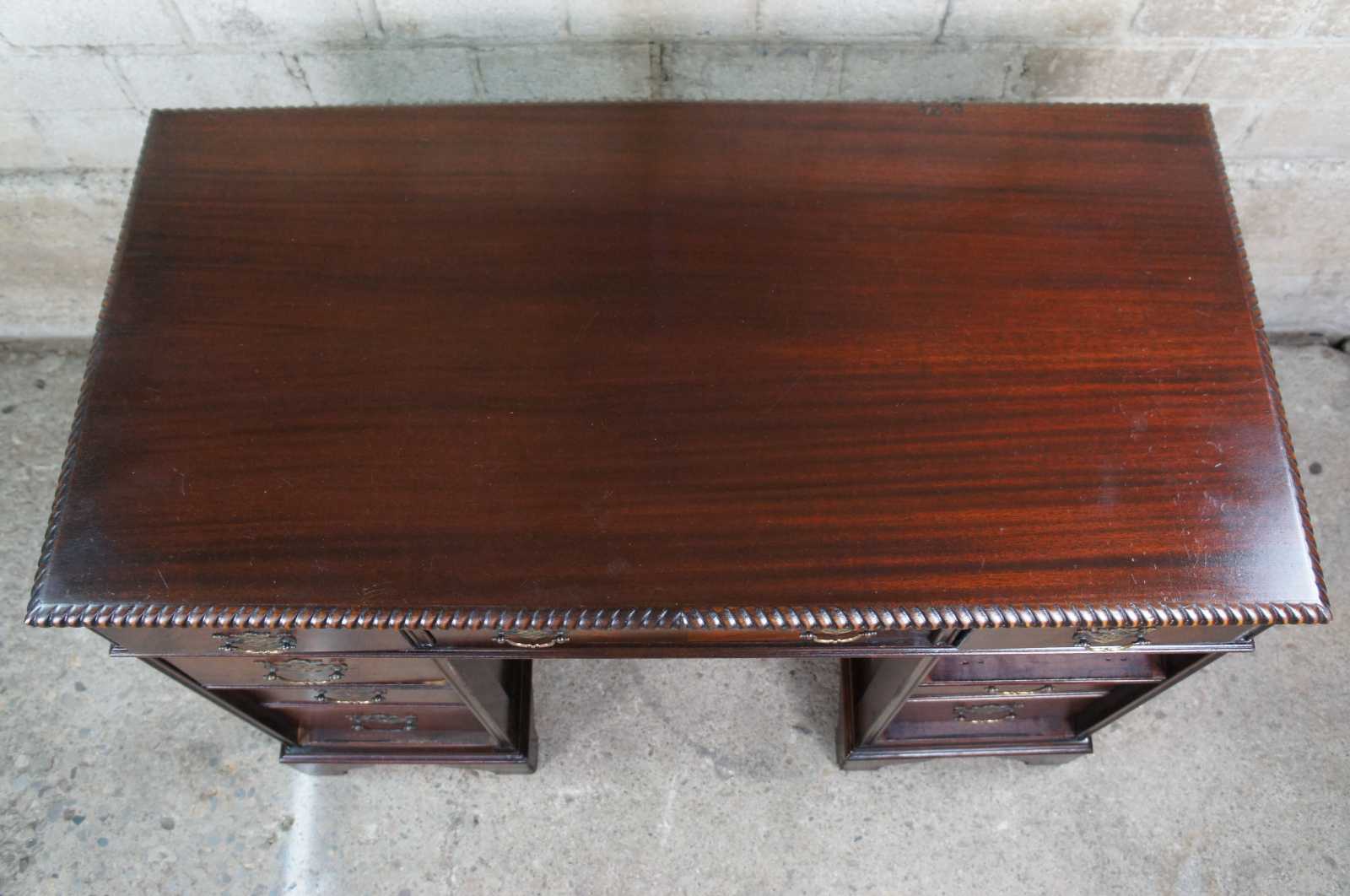 Circa 1940s mahogany writing desk. A rectangular form with gadrooning edge, 7 drawers and brass chippendale style hardware.