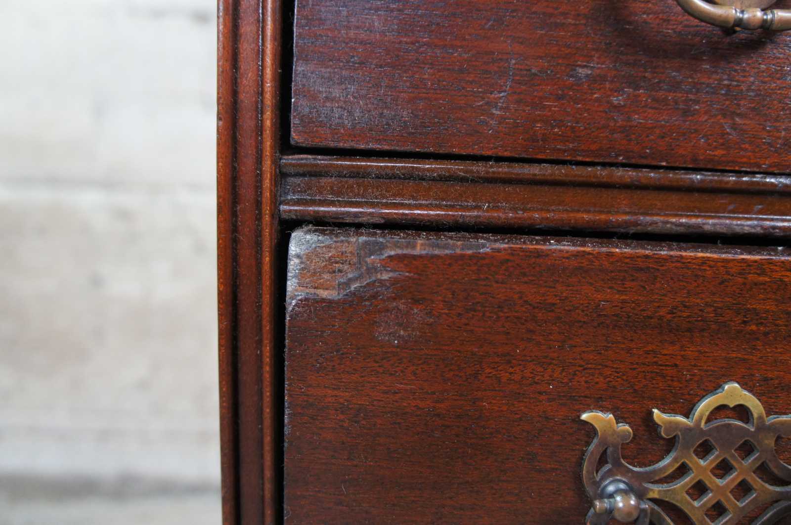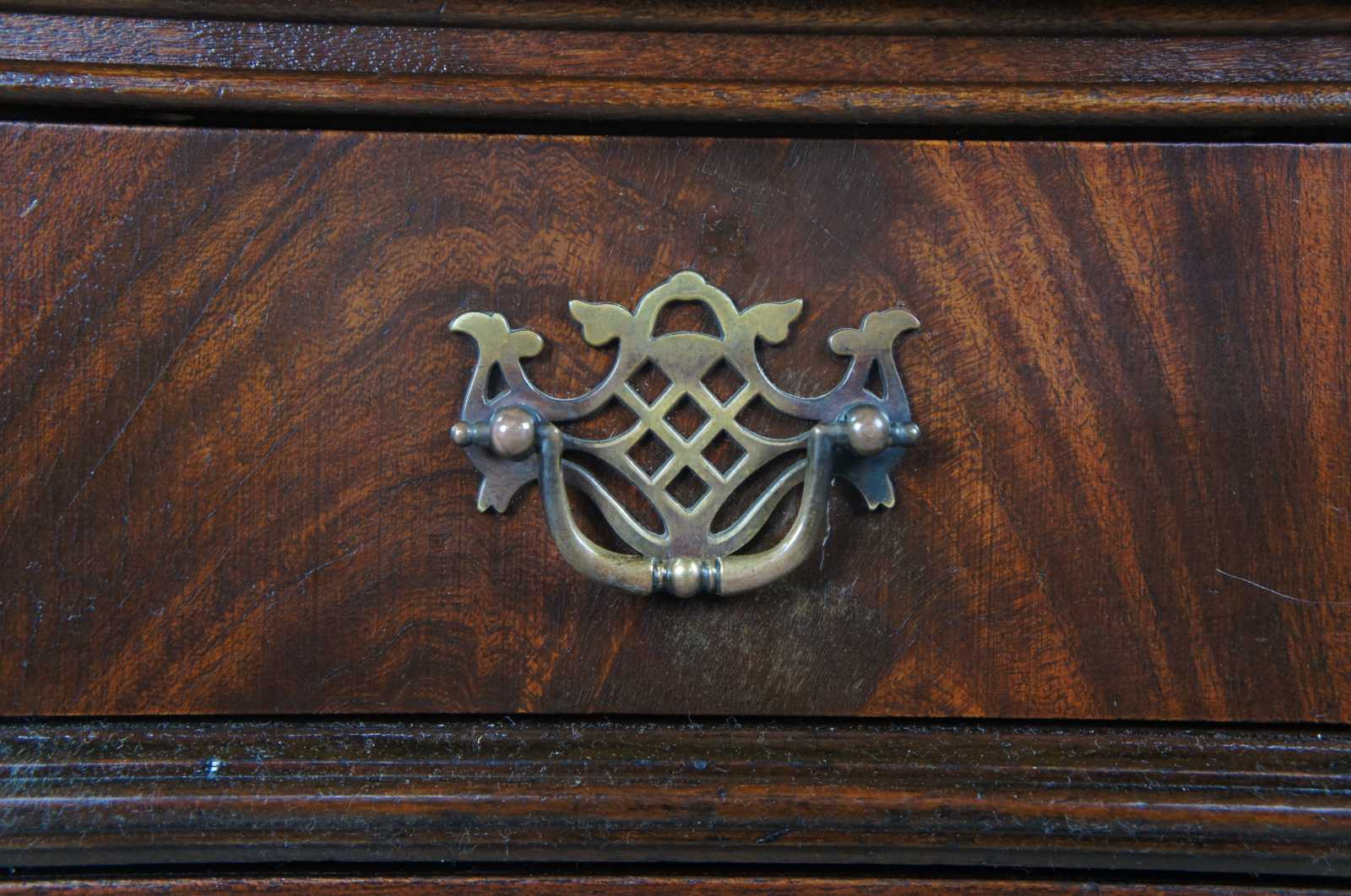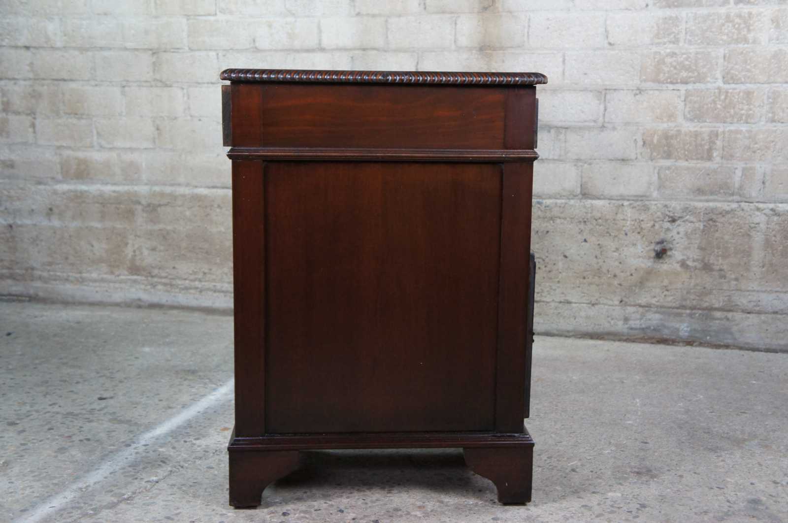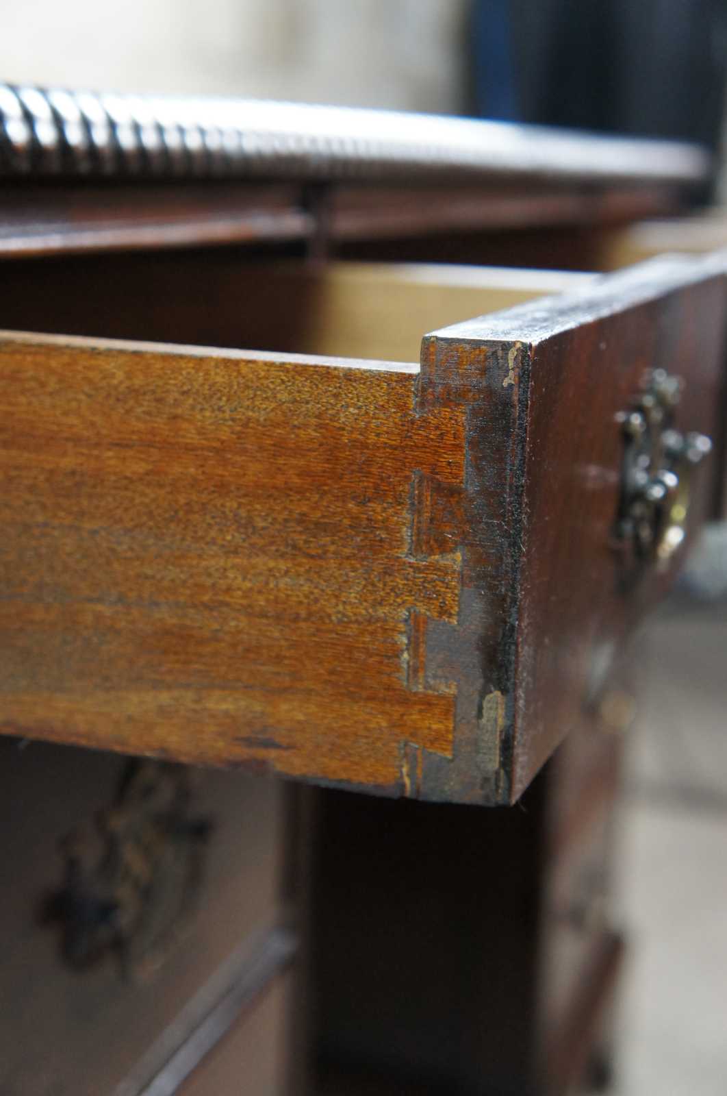 Circa 1940s mahogany writing desk. A rectangular form with gadrooning edge, 7 drawers and brass chippendale style hardware.
