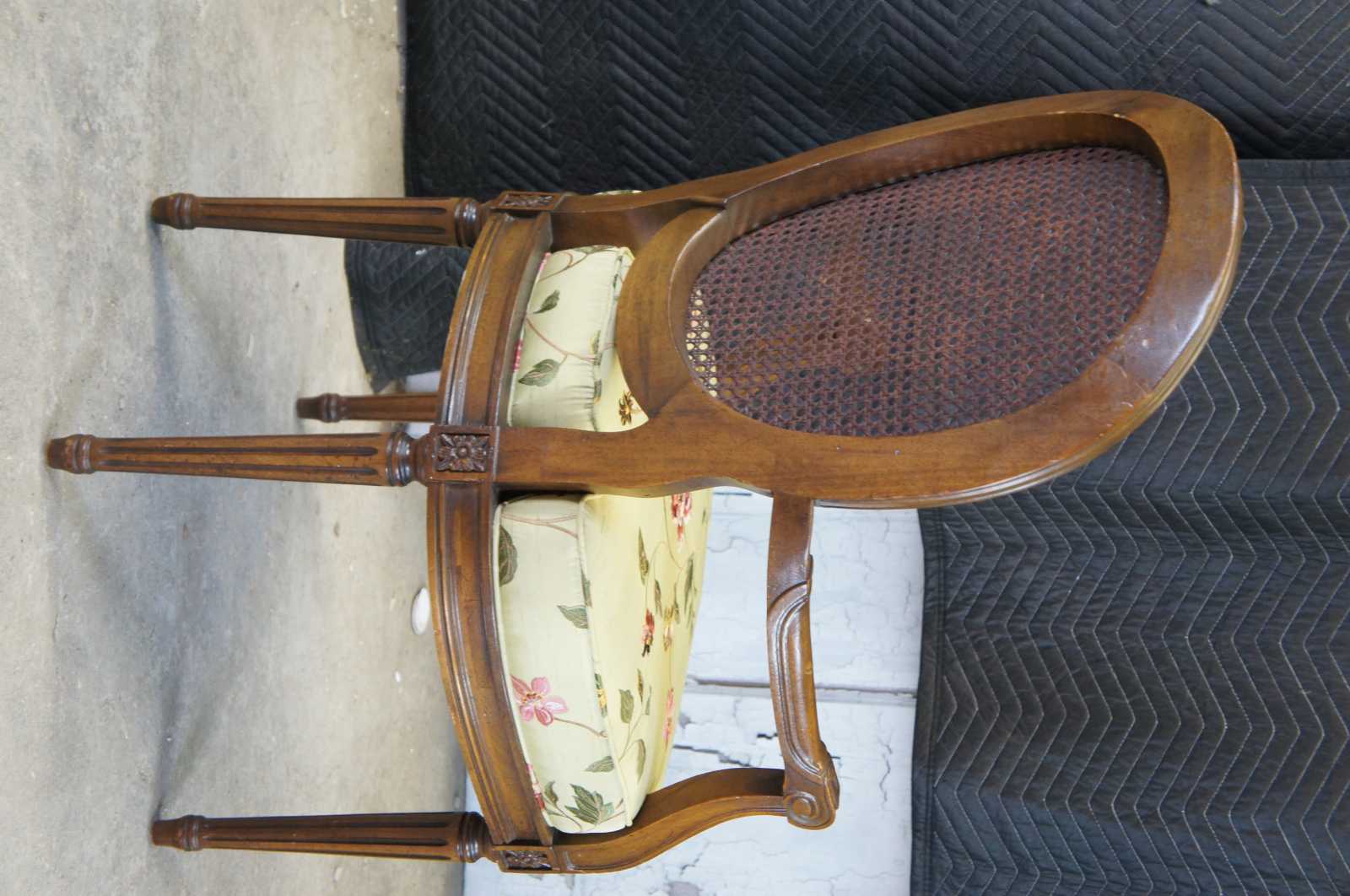 Two vintage French Louis XV armchairs. Made of walnut featuring caned oval balloon backs with a fauteuil style arm, floral / acanthus carved accents, and tapered fluted legs.