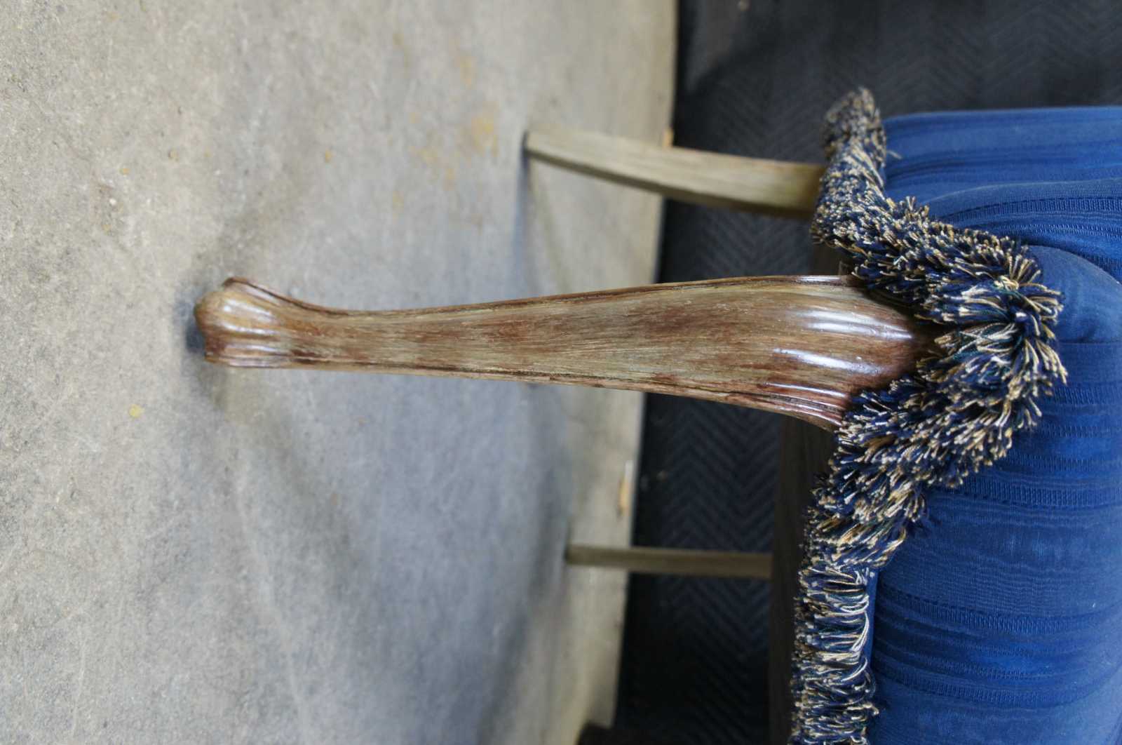 Two vintage French Provincial wingback club, library or lounge armchairs featuring serpentine form with blue striped fabric and fringe over scrolled arms, tufted flared wingback and serpentine legs.
