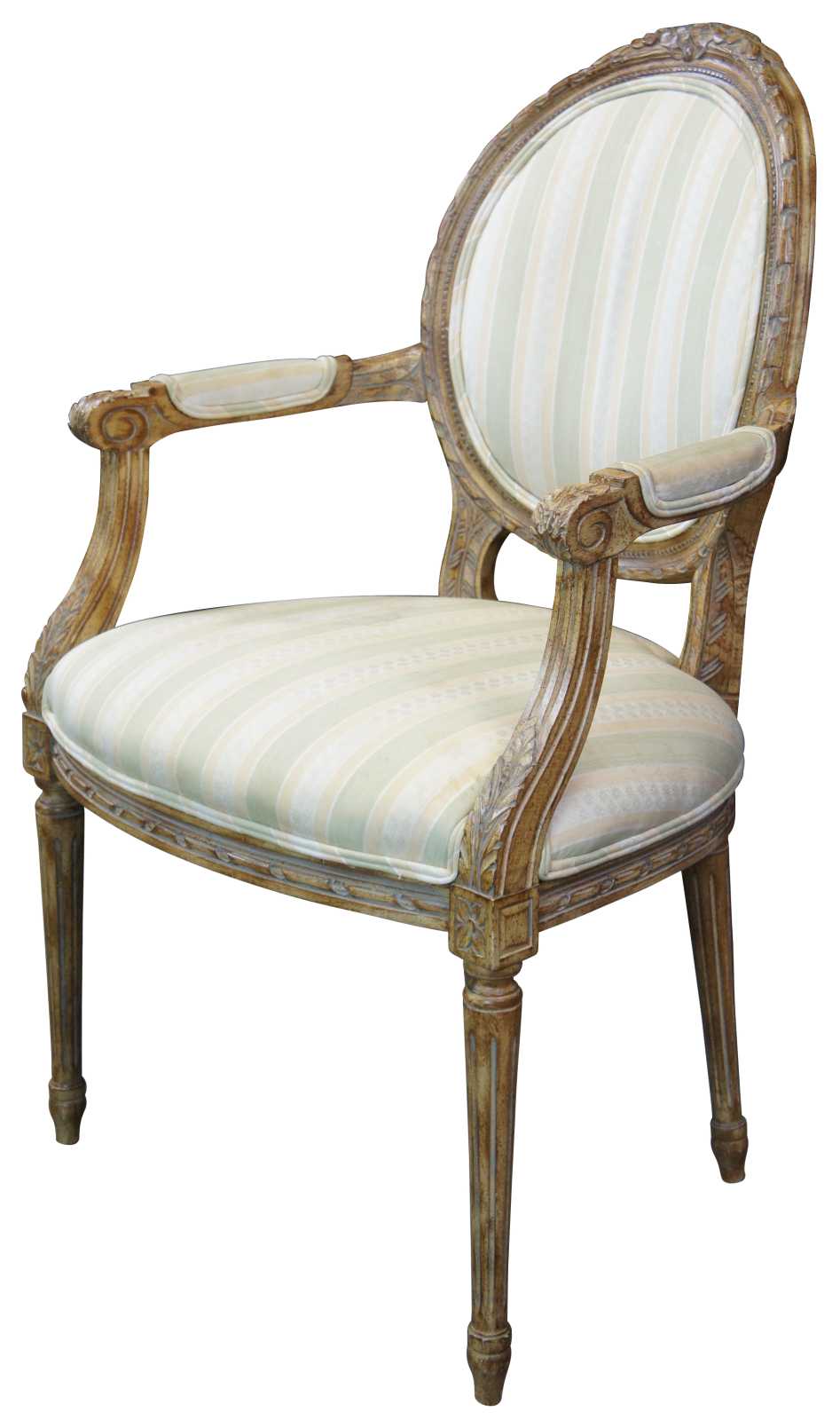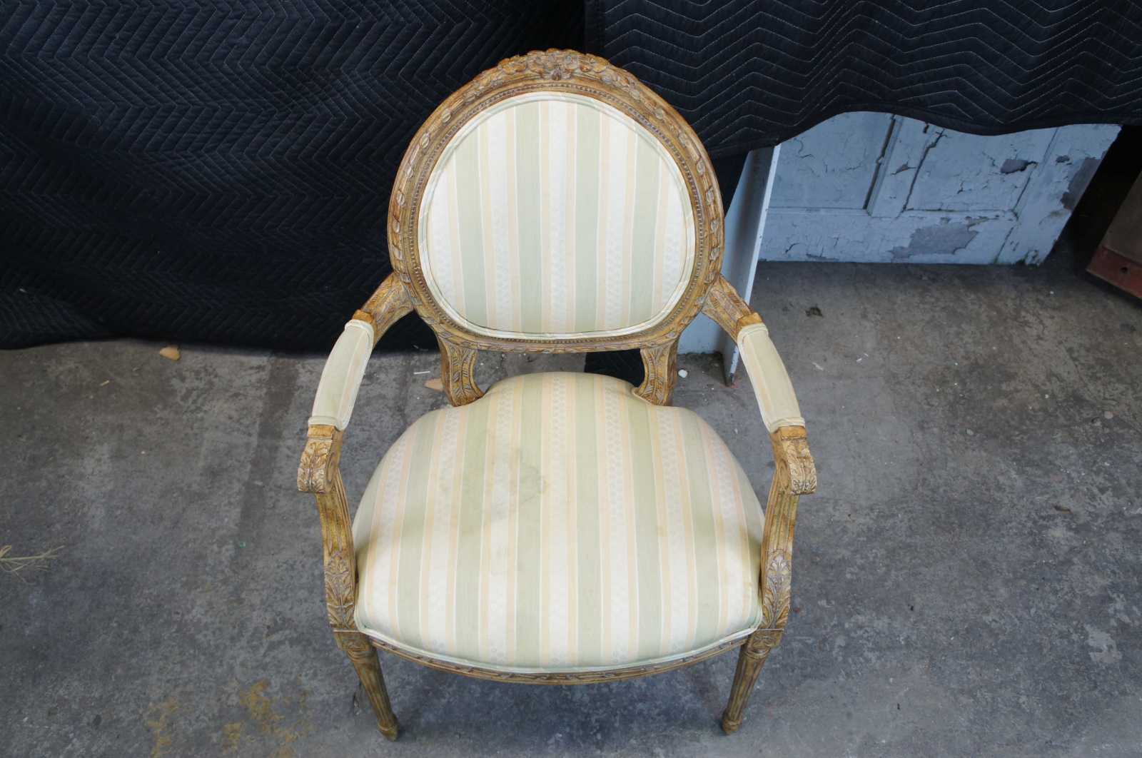 Vintage Louis XVI style fauteuil armchair featuring acanthus carvings, braded and beaded accents with a striped silk fabric. The chair is supported by tapered and fluted legs leading to an arrow foot. Purchased from Norman Miller & Son of Dayton, Ohio. Norman Miller Interiors was a popular store located in the historic Dietz Block building, built in 1886.
