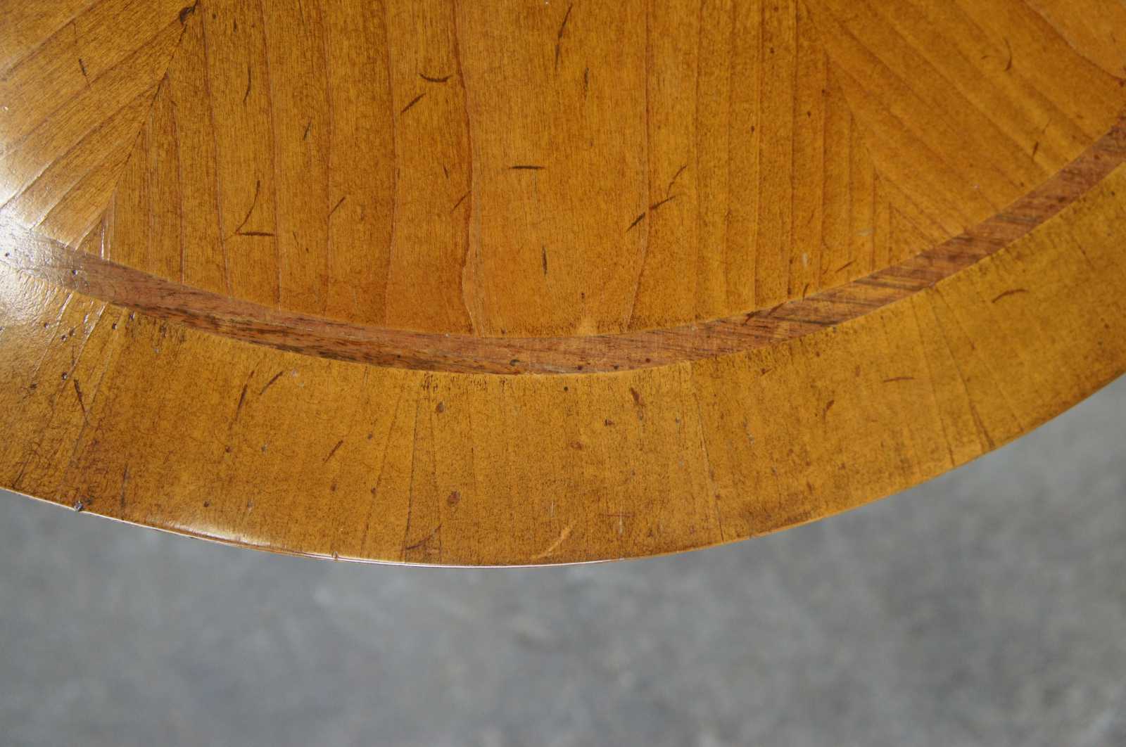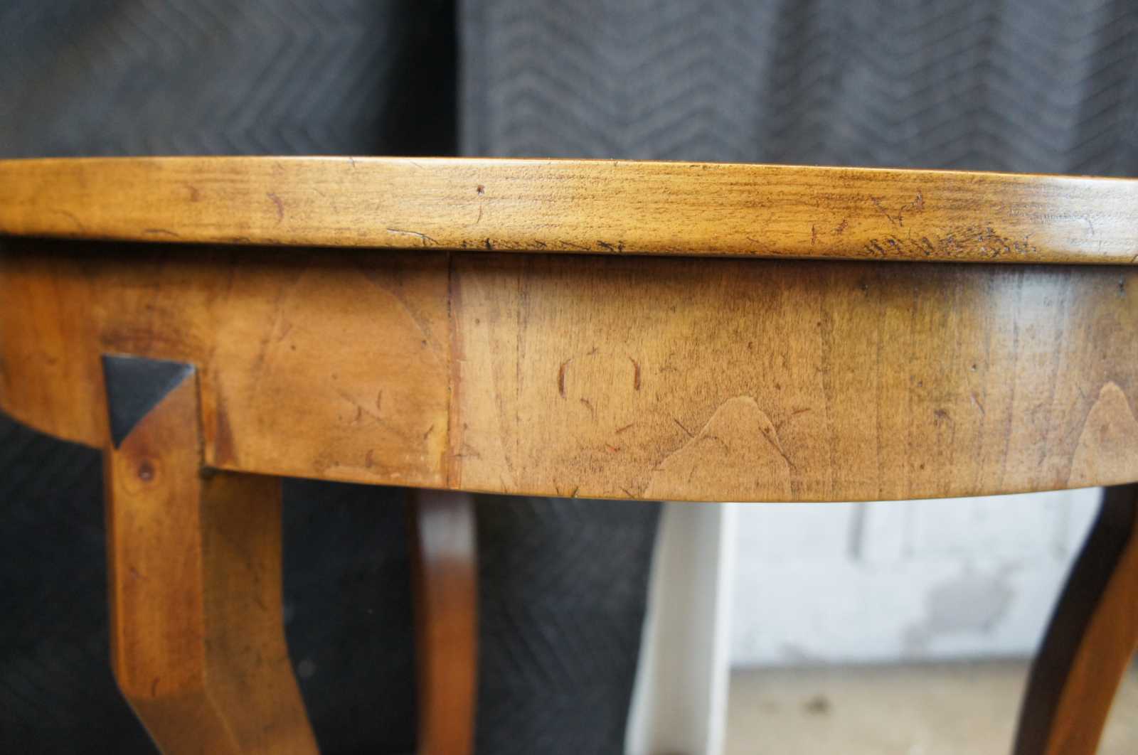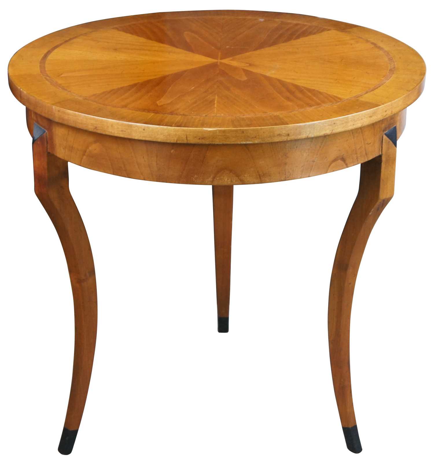Italian crafted Gueridon table in Biedermeier form, circa last quarter 20th century. Features a round top made from Cherry with matchbook veneer and banding over three saber legs with ebonized trim. Naturally distressed finish. Marked along underside.