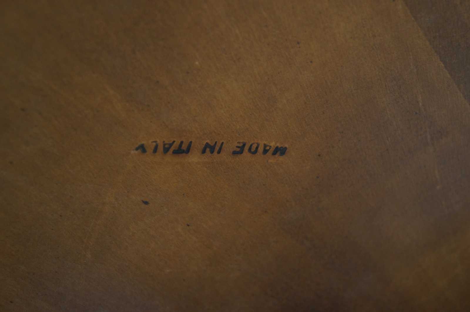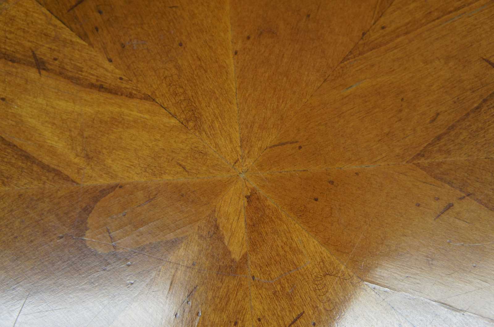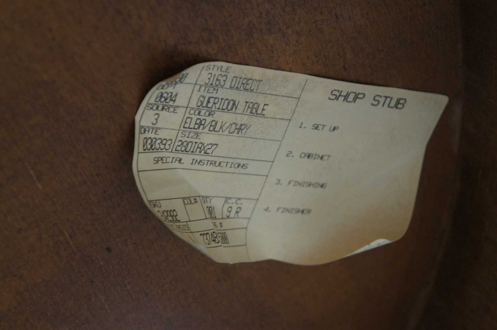 Italian crafted Gueridon table in Biedermeier form, circa last quarter 20th century. Features a round top made from Cherry with matchbook veneer and banding over three saber legs with ebonized trim. Naturally distressed finish. Marked along underside.