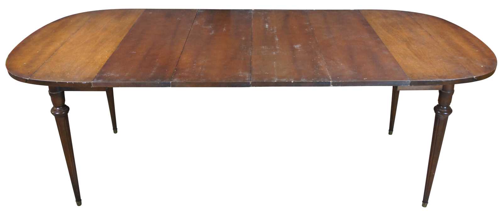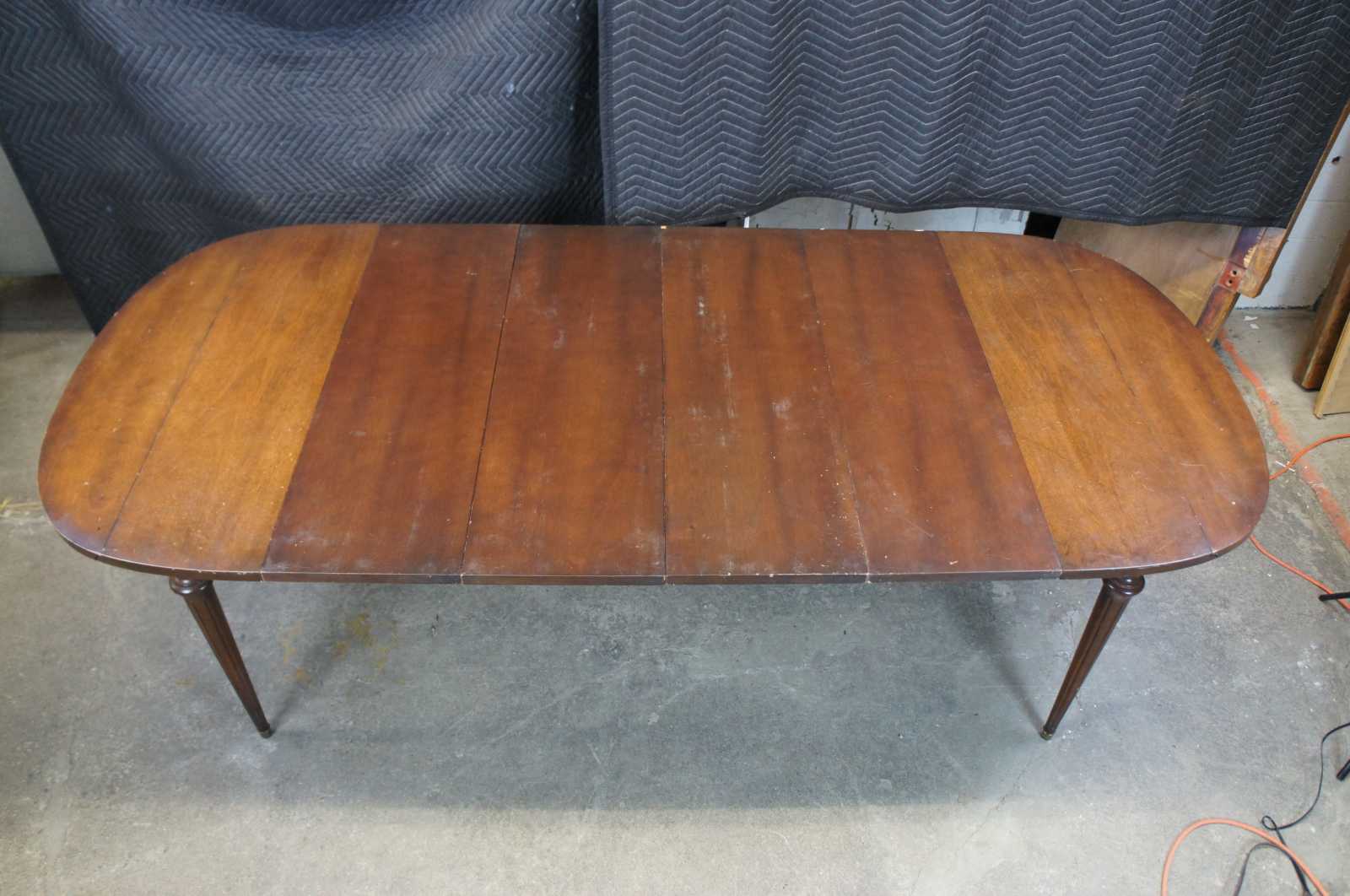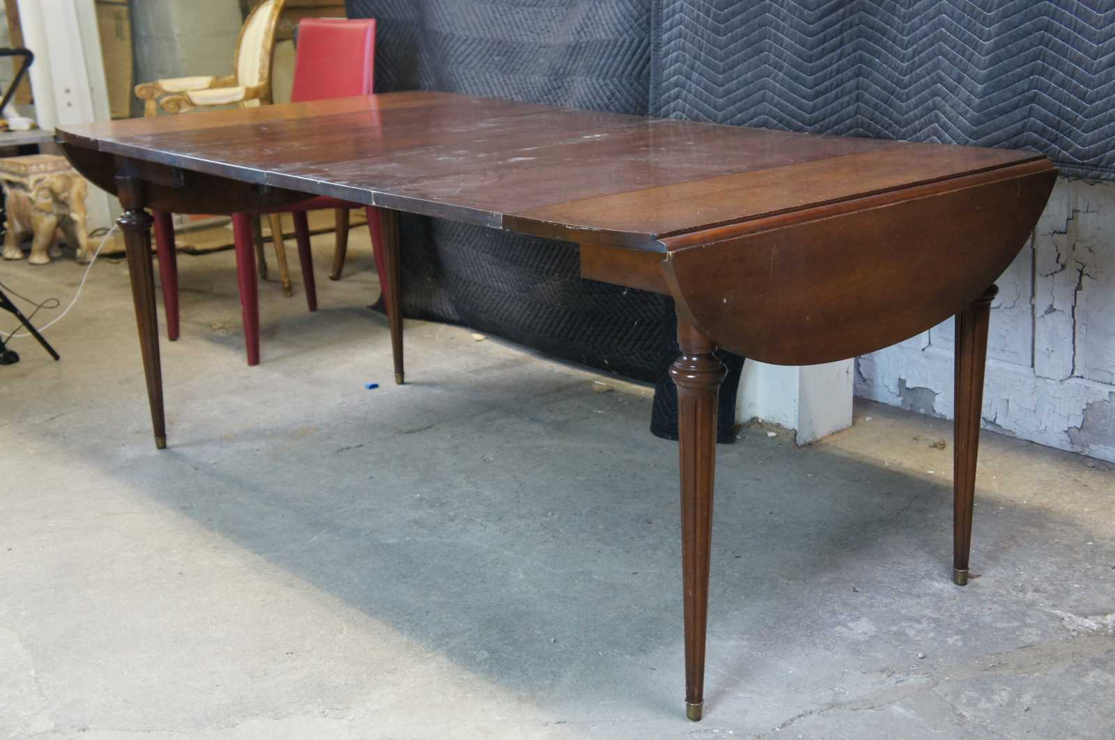 Mid century walnut drop leaf dining table featuring four leaves, rounded ends and fluted tapered legs with brass caps.