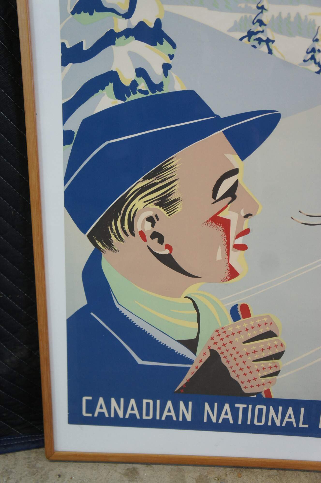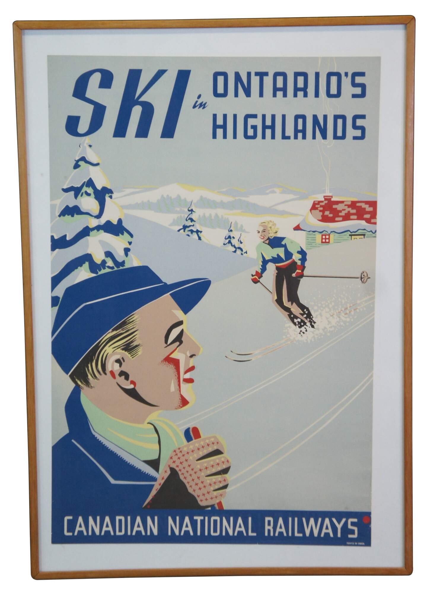 Two Original retro mid century framed advertising ski posters featuring Ski in Jasper National Park Canadian National and Ski in Ontarios Highlands Canadian National Railways. Both feature skiiers on the mountain slopes. Printed in Canada.