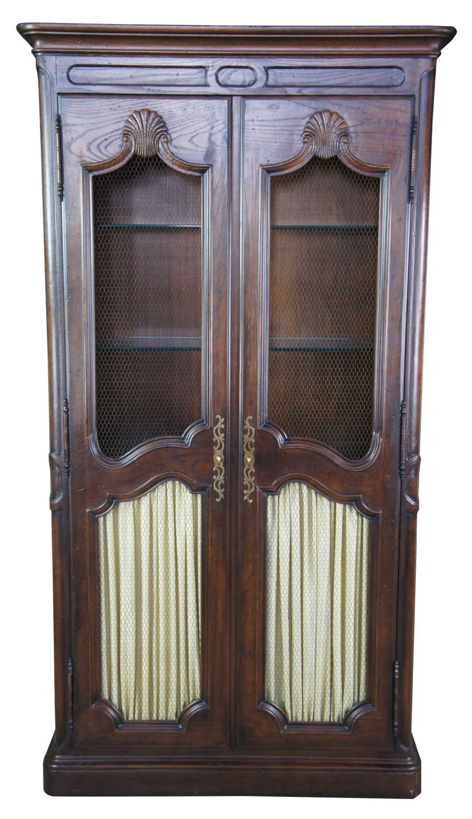 Vintage Henredon lattice door china display or curio cabinet, circa 1980s. Made of oak featuring French country styling with lattice doors and shell motif. Interior illuminates adjustable glass shelving. Includes silk lining for lower doors that can installed to conceal china or collectibles. 49-7001.