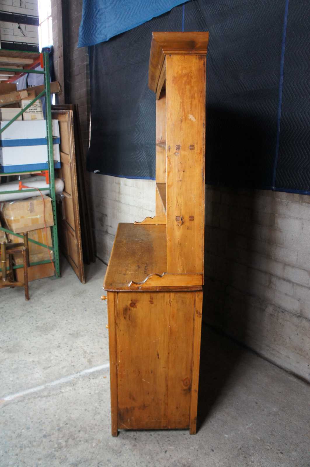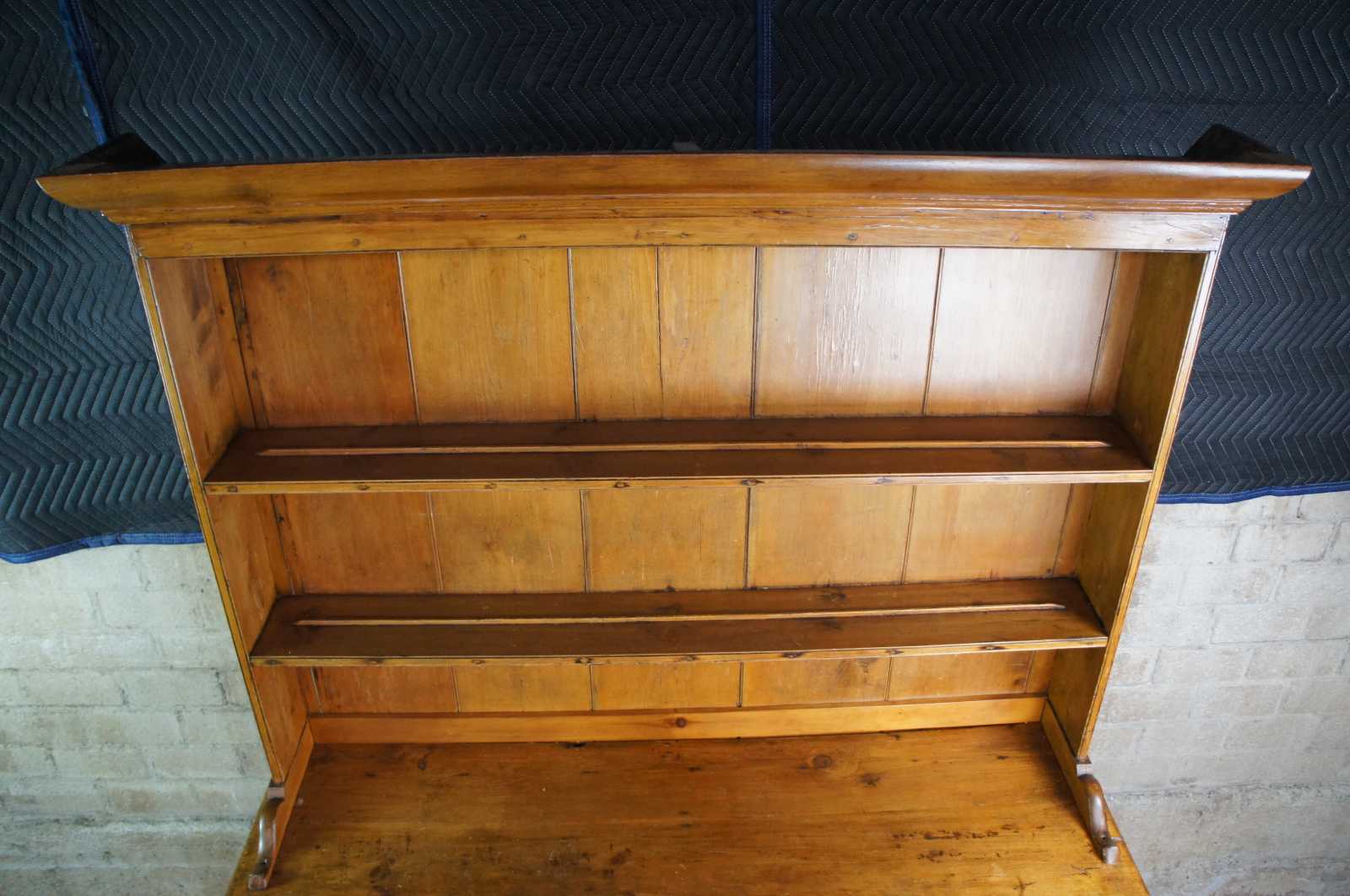 Antique English step back cupboard or china hutch featuring upper shelves with plate grooves and lower cabinet with drawers. Circa 1870s
