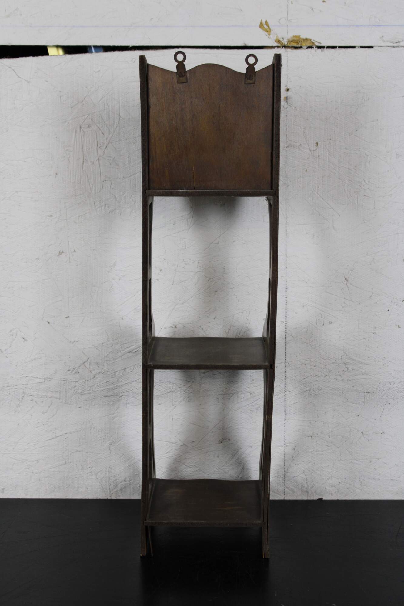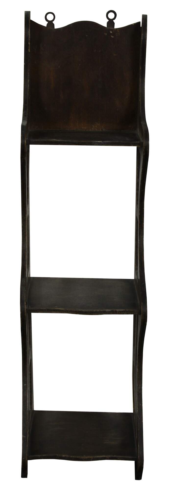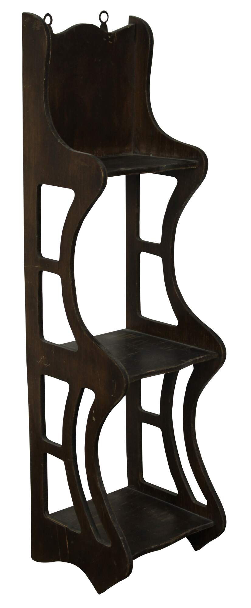 Antique veneered wooden wall hanging shelf with three tiers and pierced, scalloped sides.