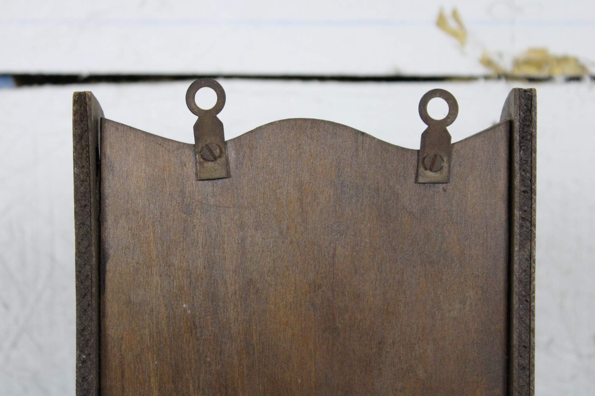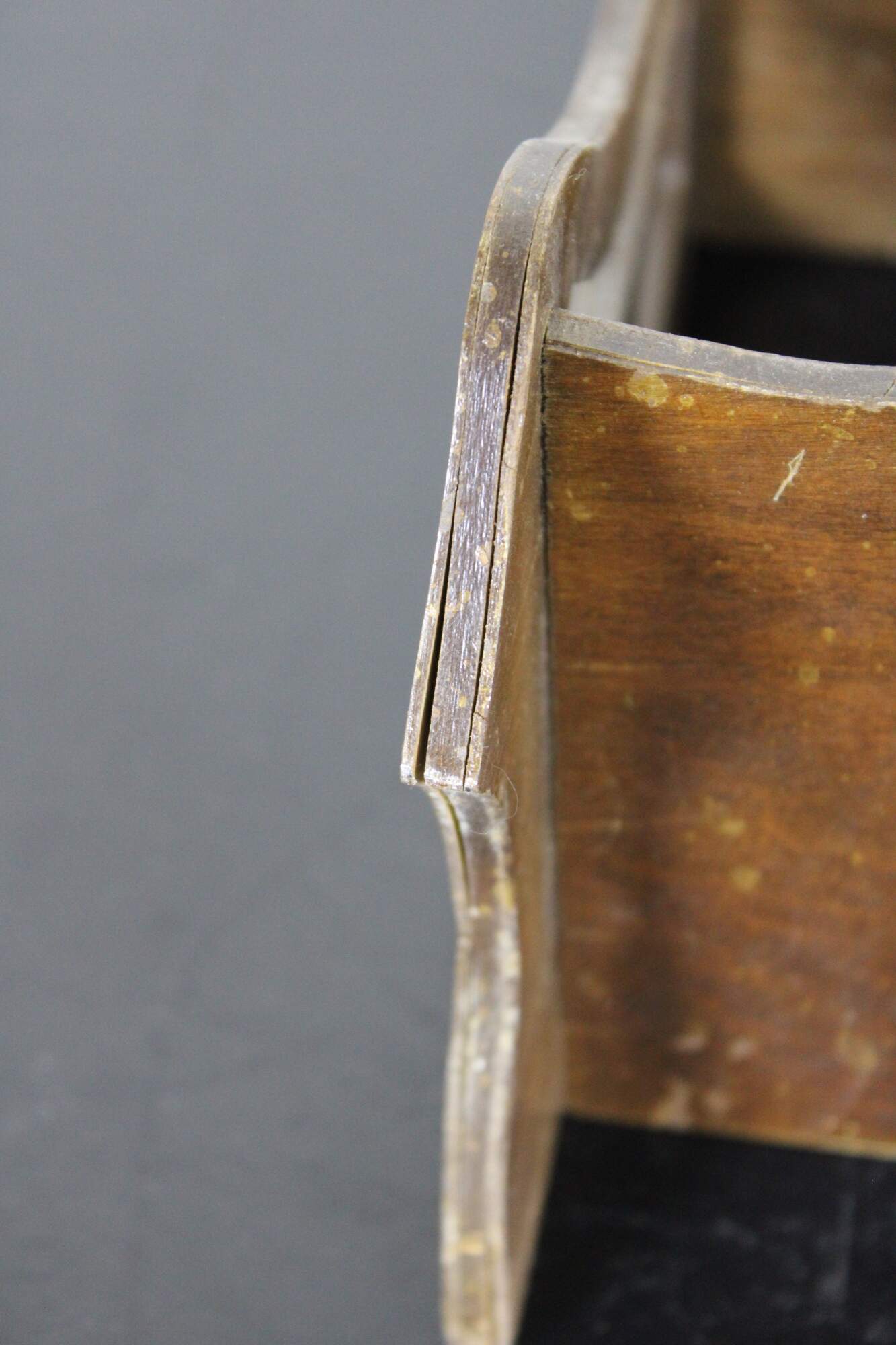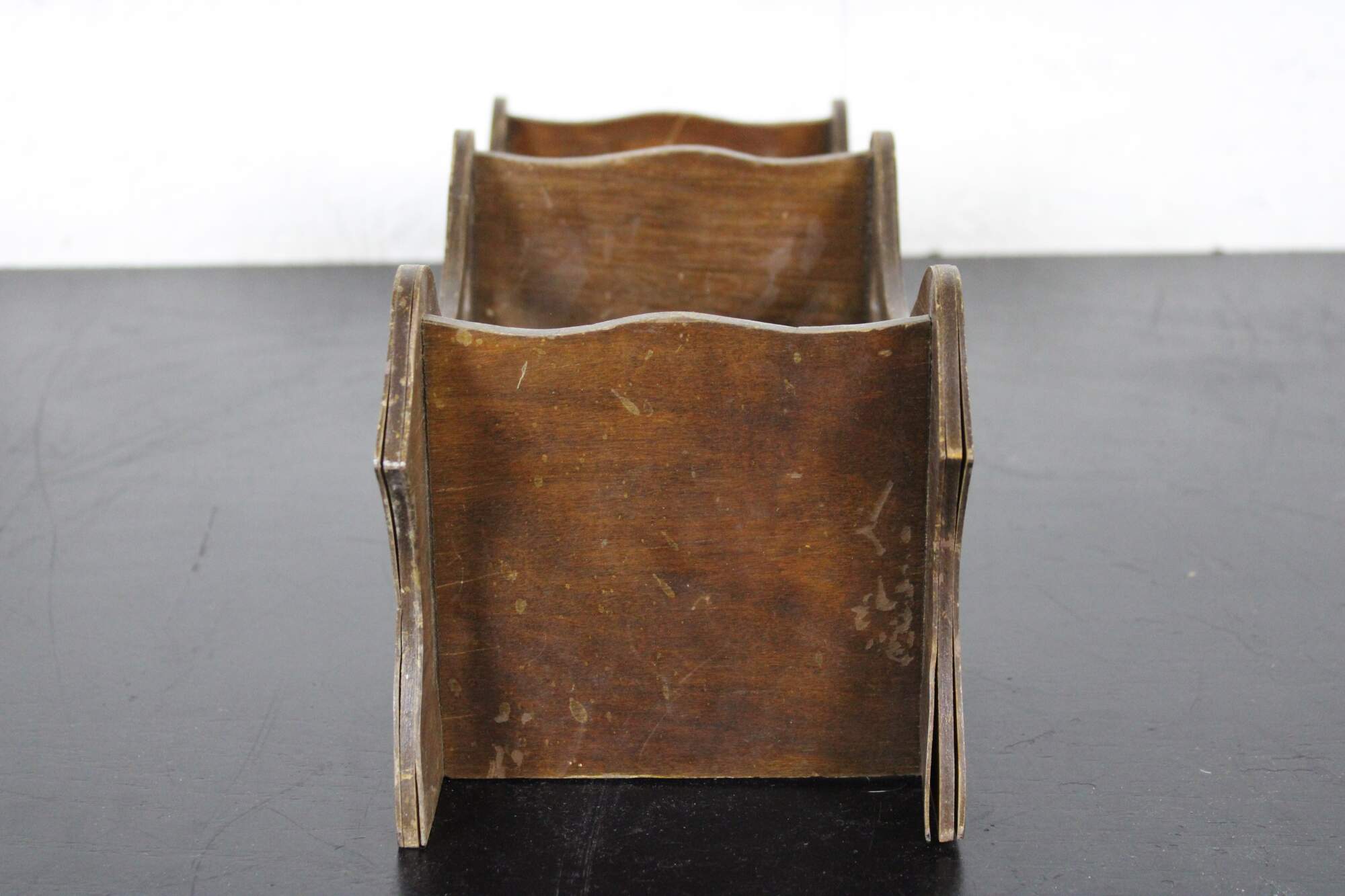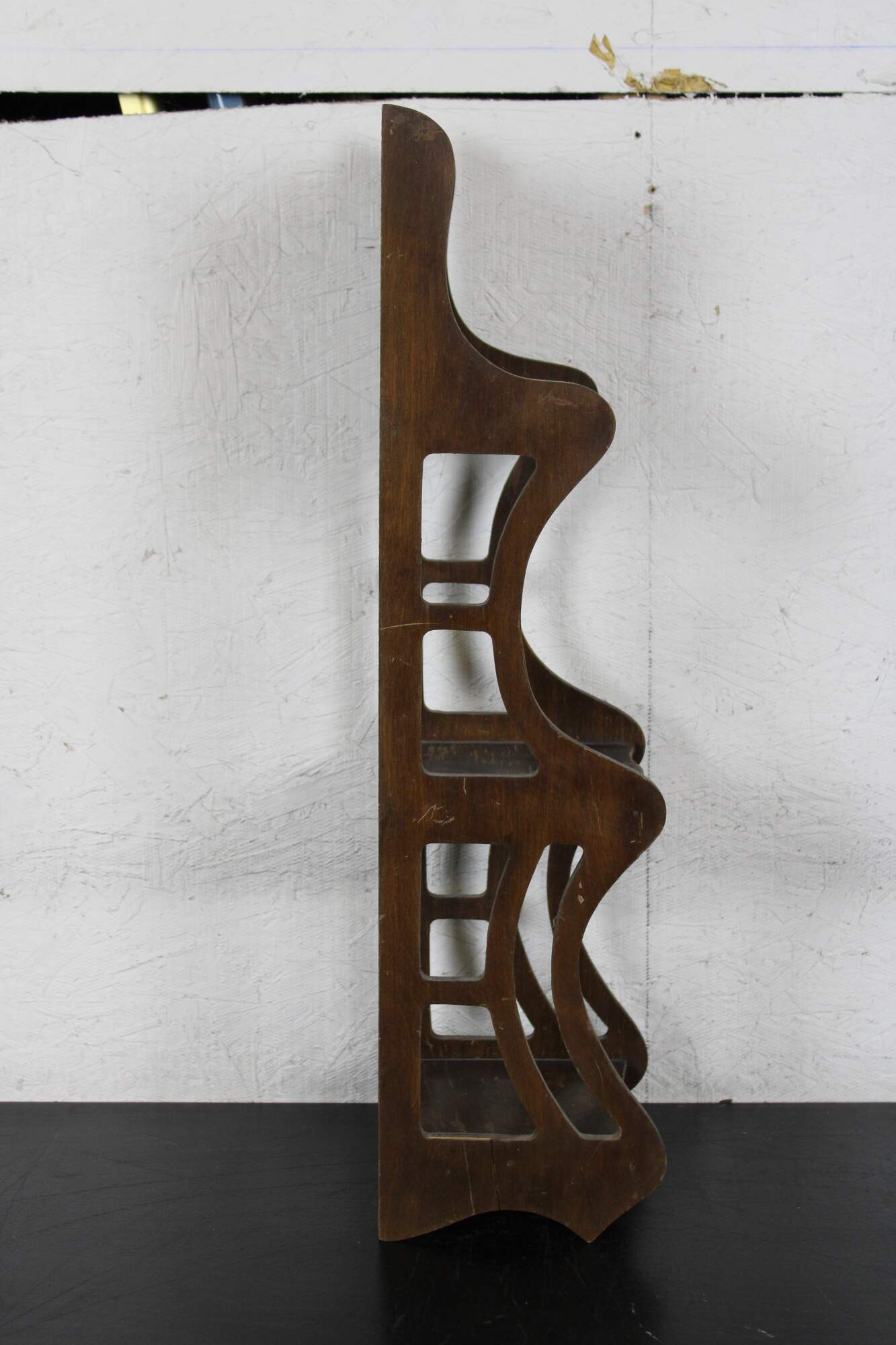 Antique veneered wooden wall hanging shelf with three tiers and pierced, scalloped sides.