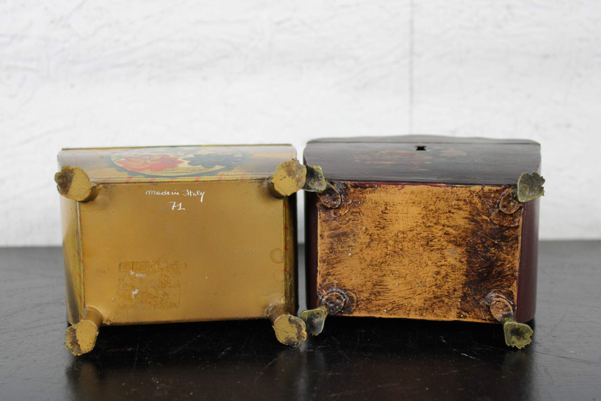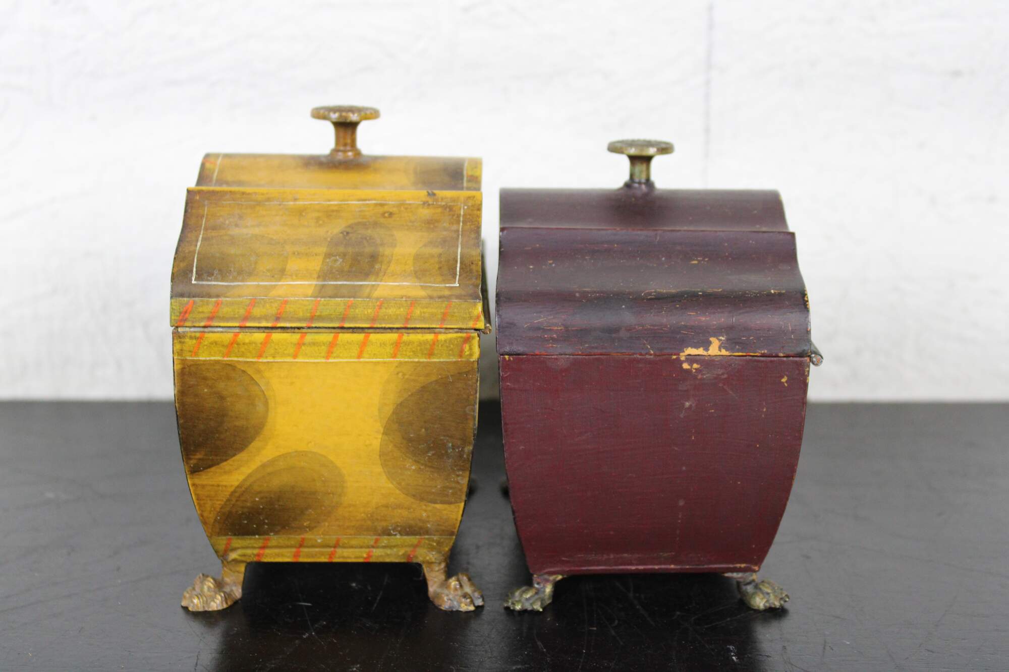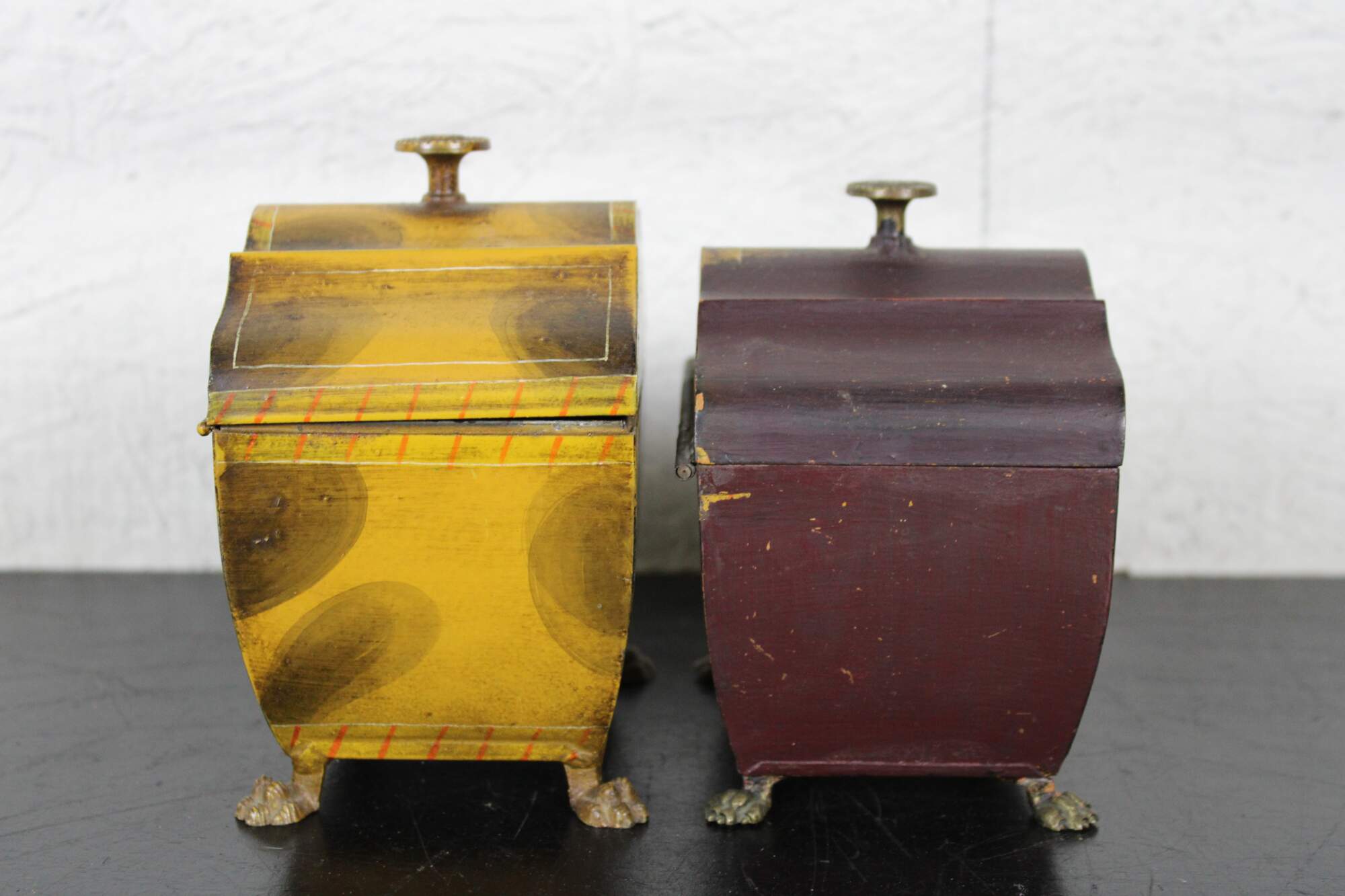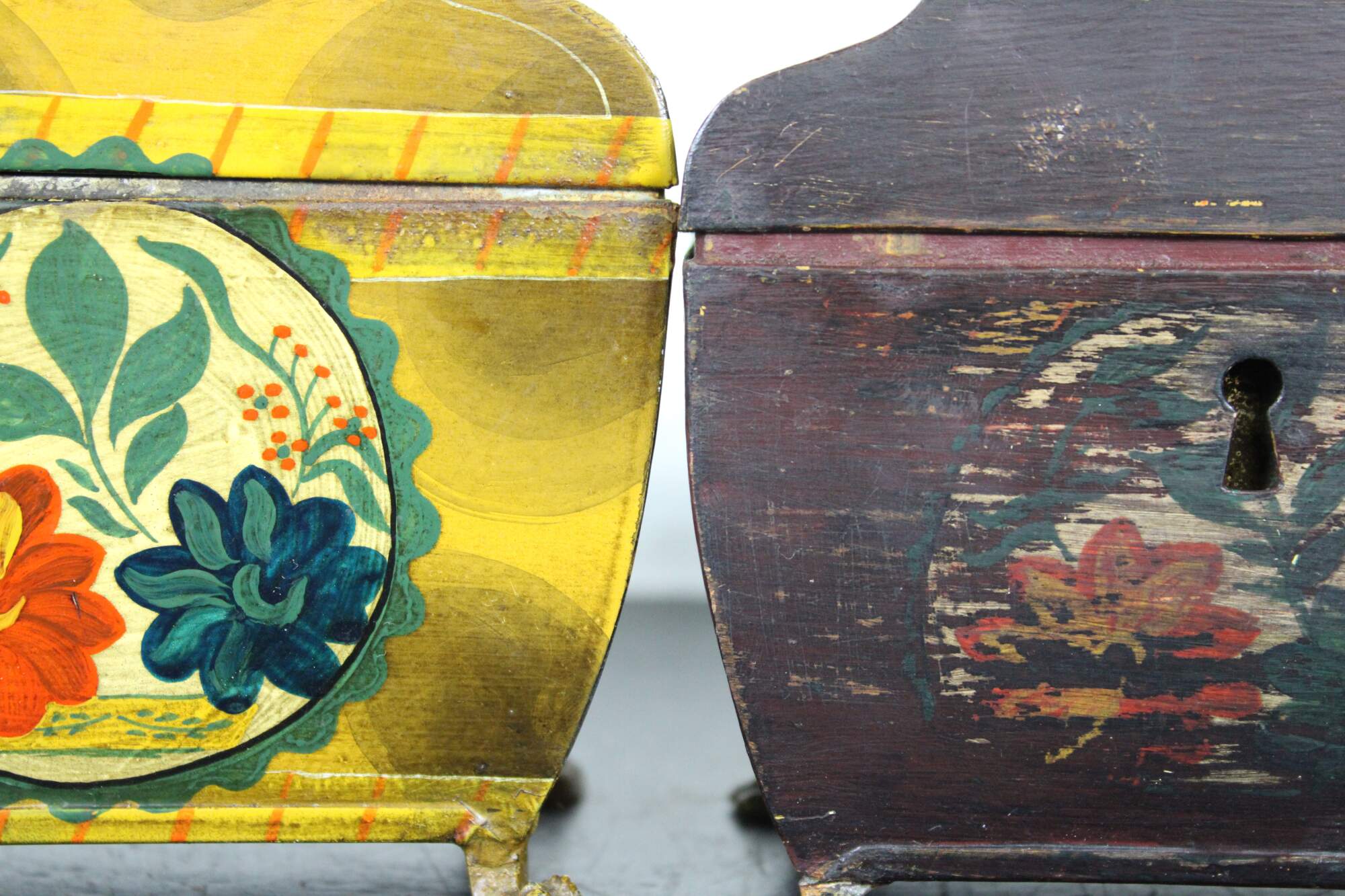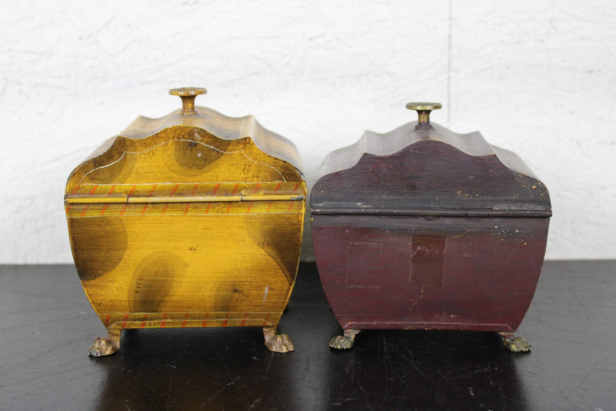 Set of two vintage toleware painted tin tea caddy boxes with paw feet. Yellow one marked “Made in Italy 71.”. Circa 1970s after styles from Italy and England in the 19th century.