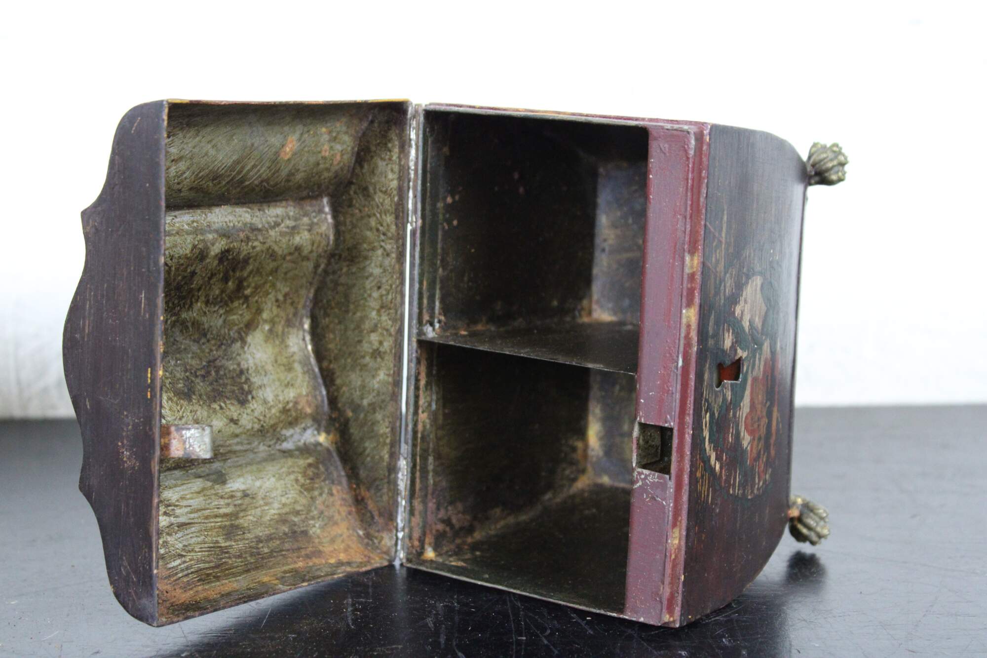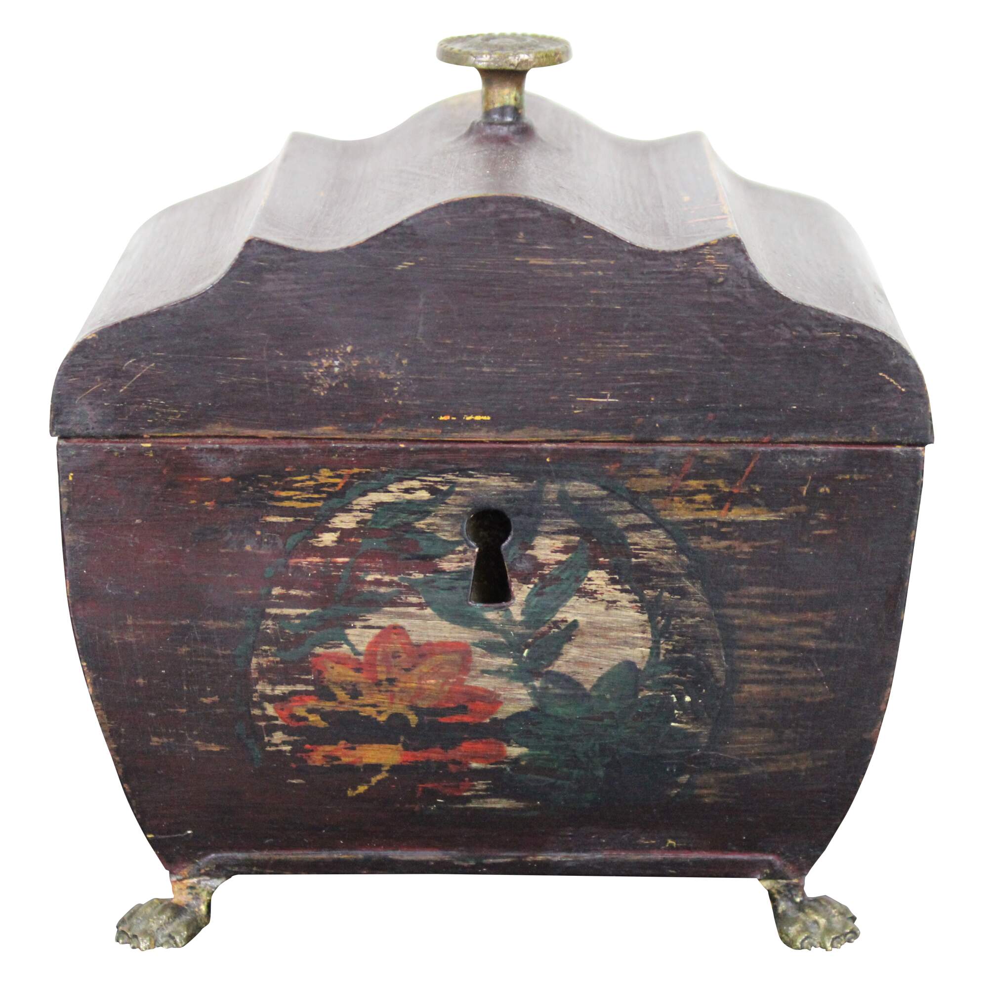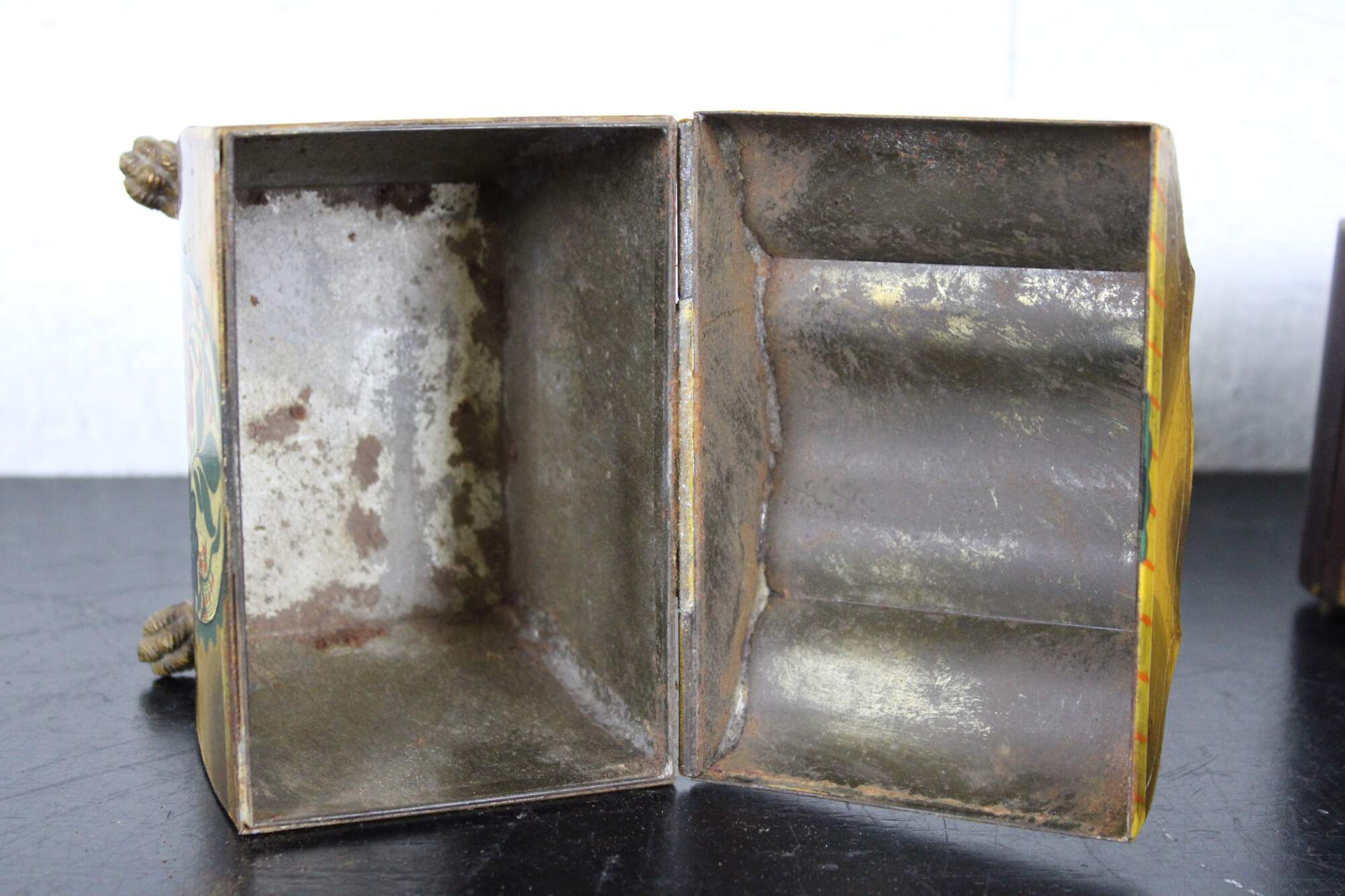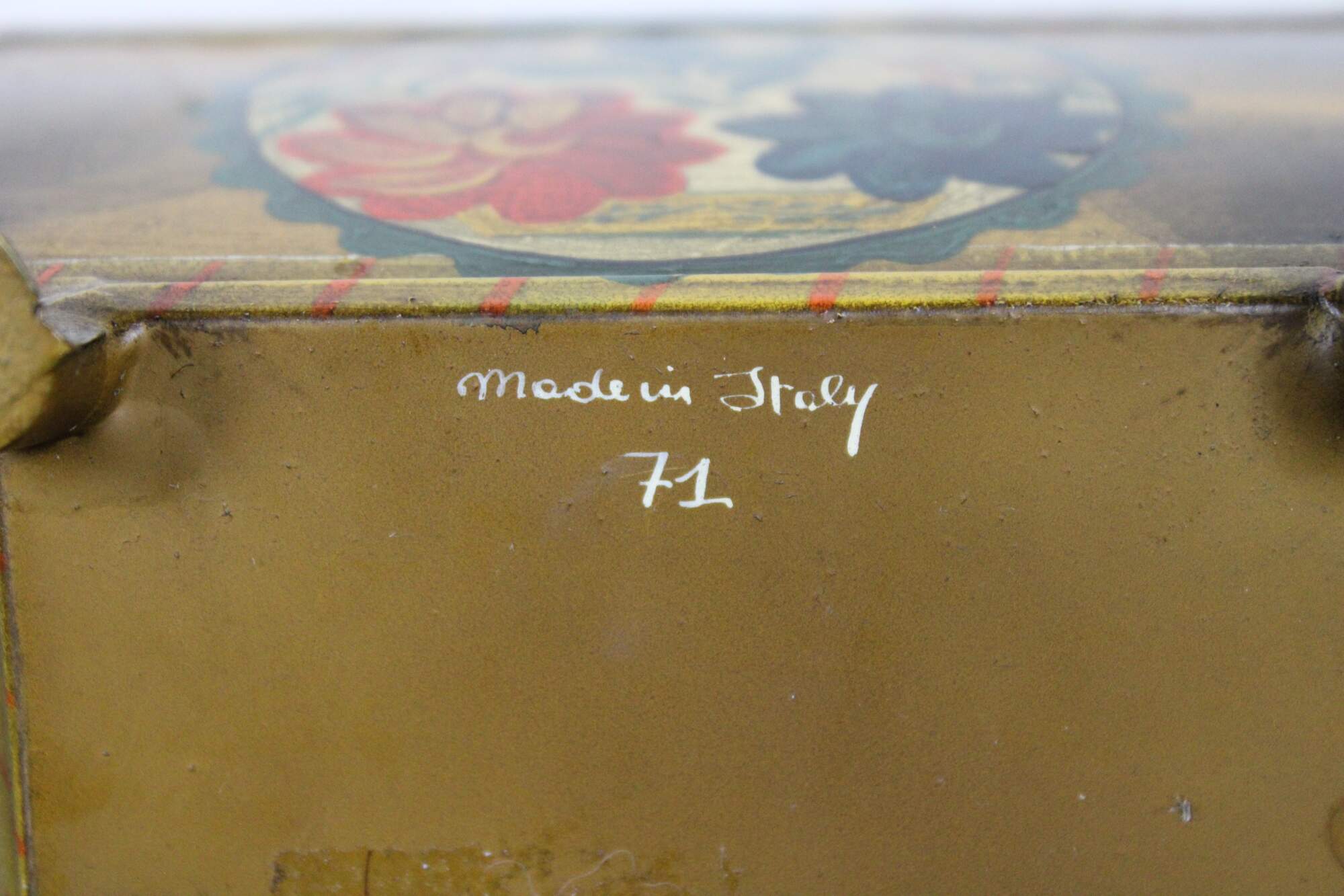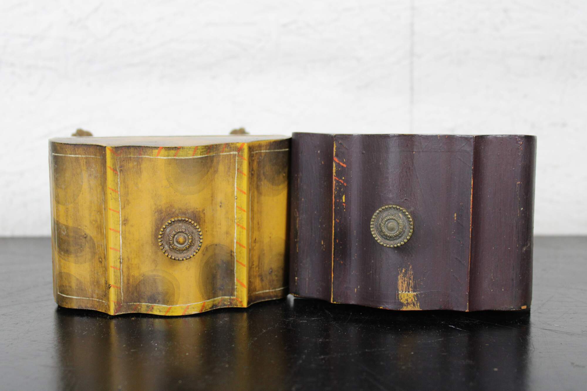 Set of two vintage toleware painted tin tea caddy boxes with paw feet. Yellow one marked “Made in Italy 71.”. Circa 1970s after styles from Italy and England in the 19th century.