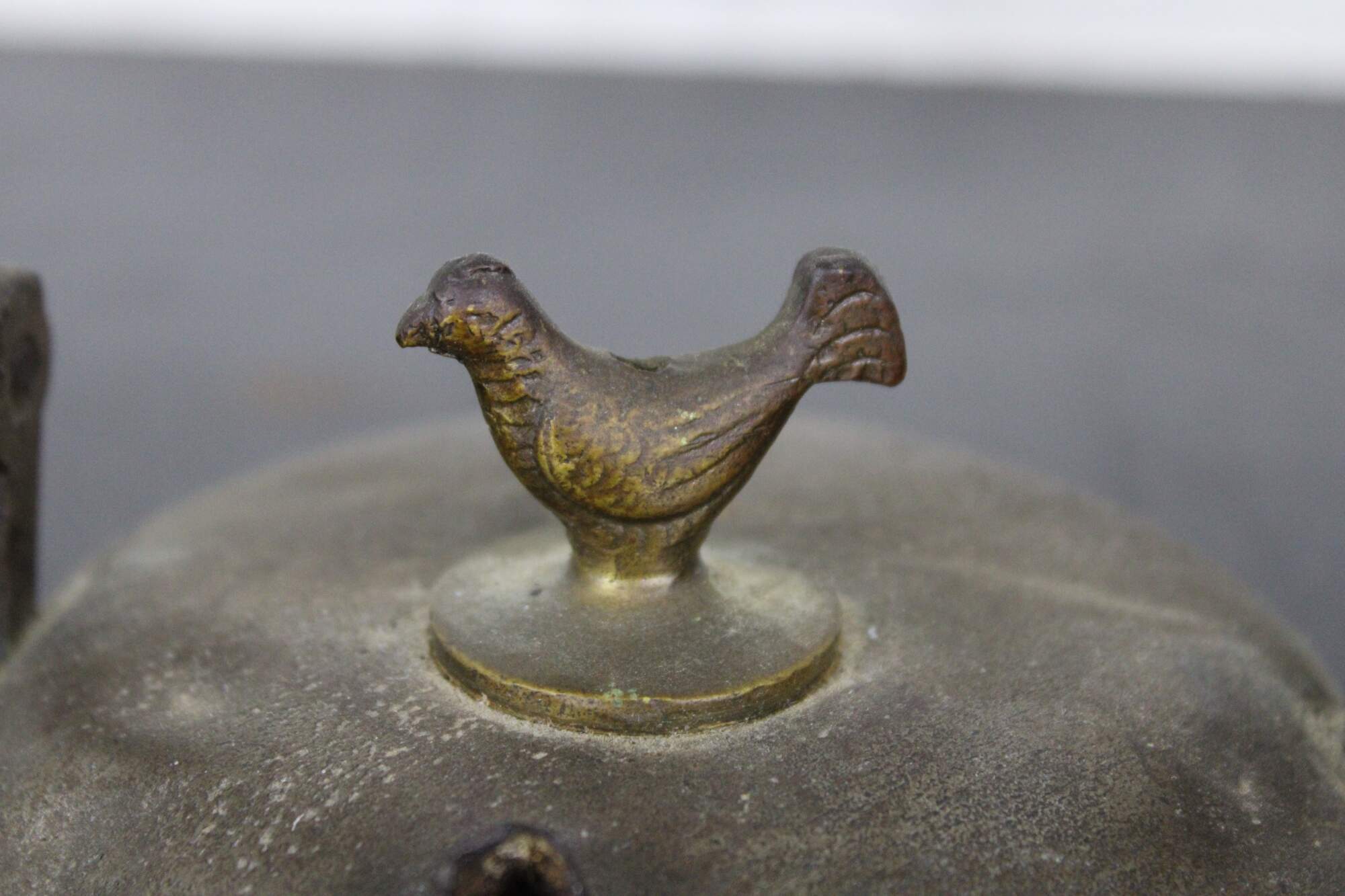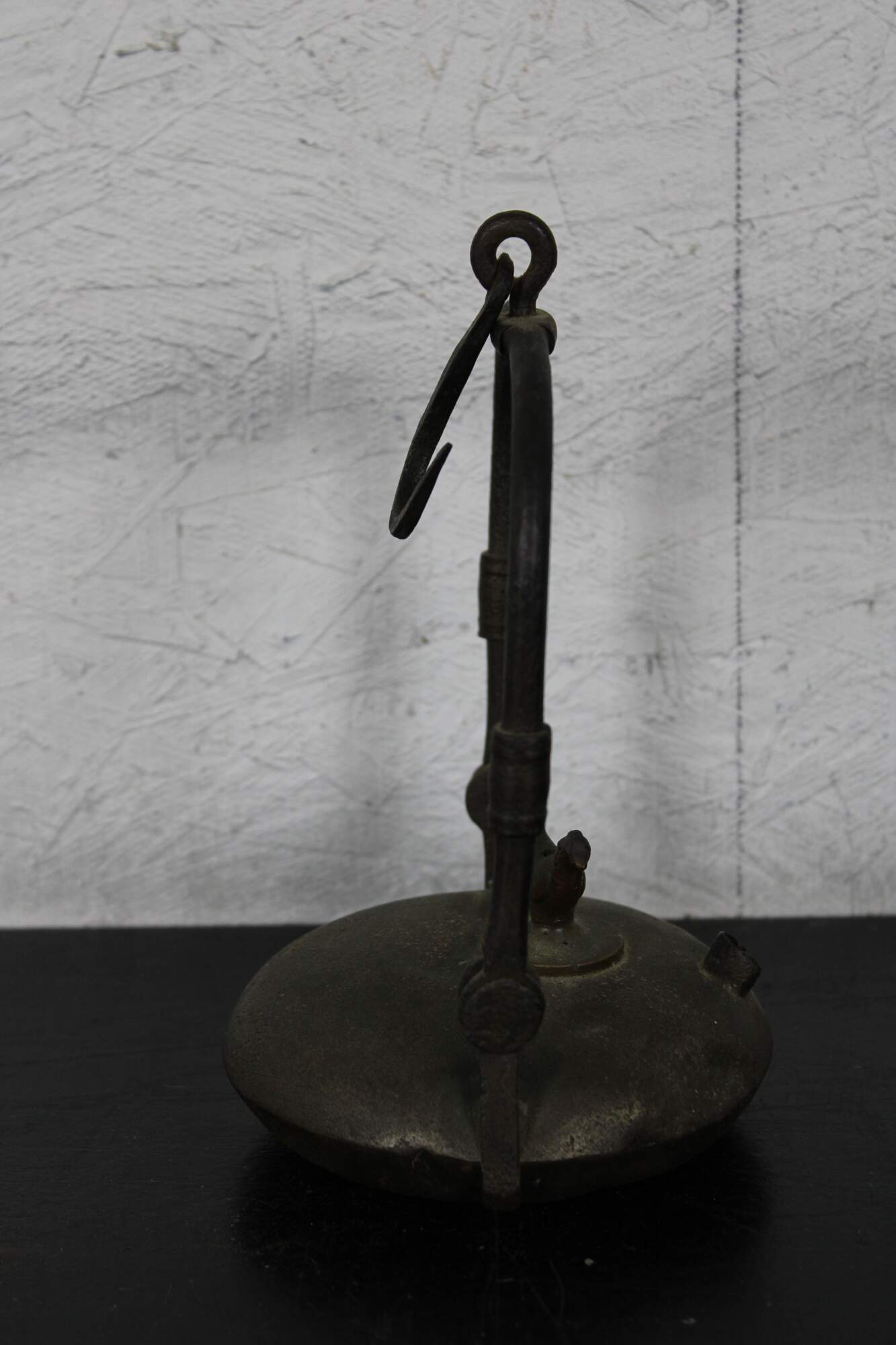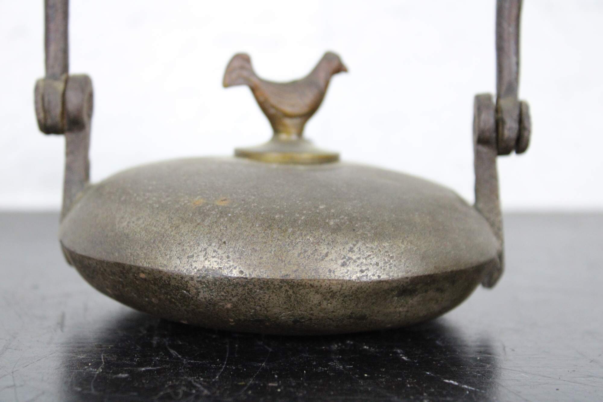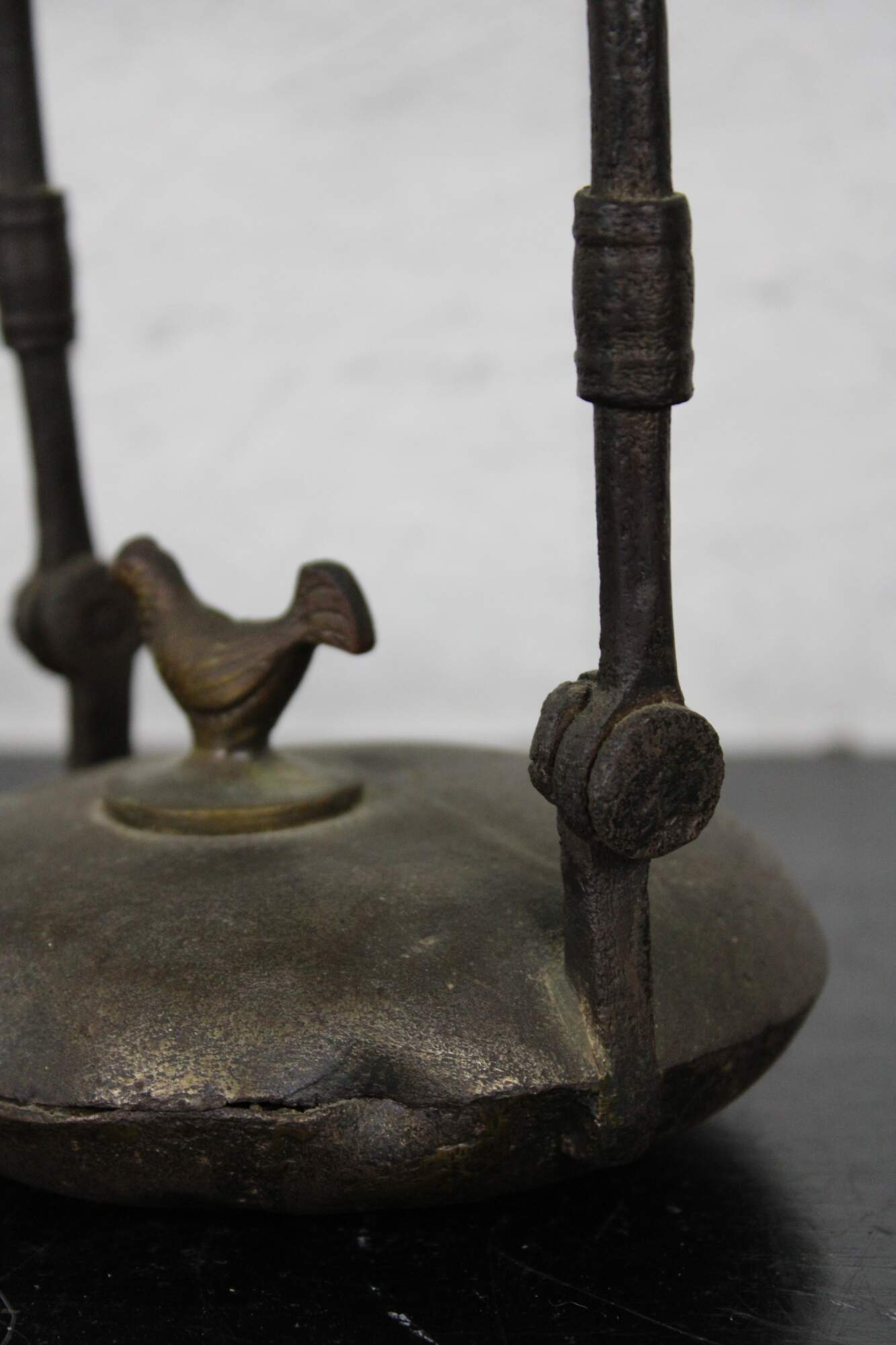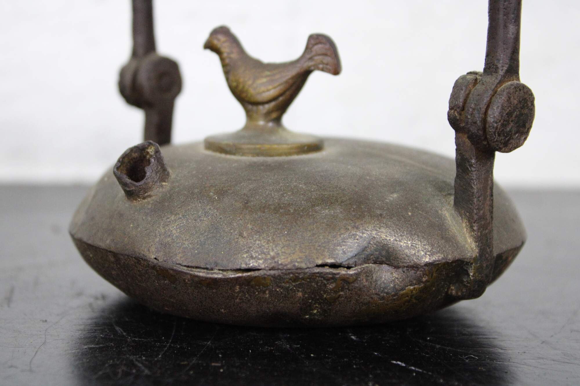 Antique early 18th century French miner’s whale oil lantern, decorated with a brass rooster and iron handle/hook.