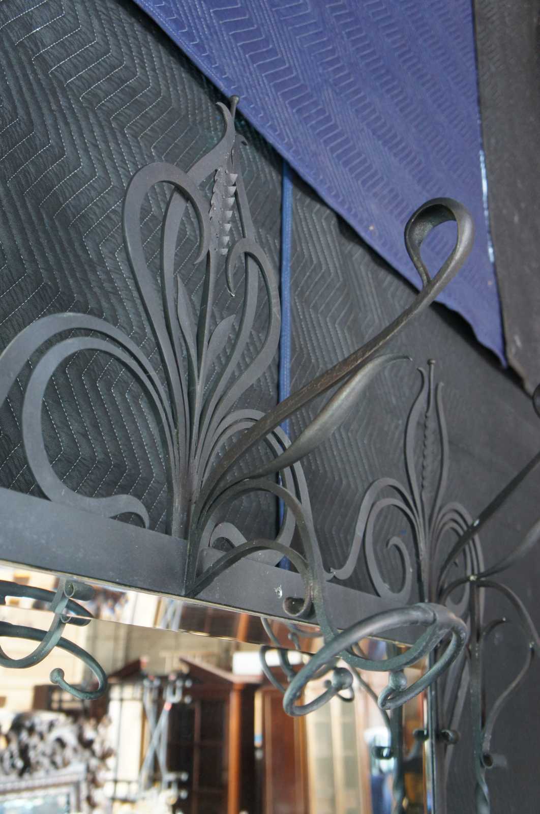 Monumental French hall tree, coat rack or umbrella / cane stand. Made of wrought iron featuring a sleek low profile with scrolled and twisted accents, large beveled mirror, and multiple areas for storage and hanging.