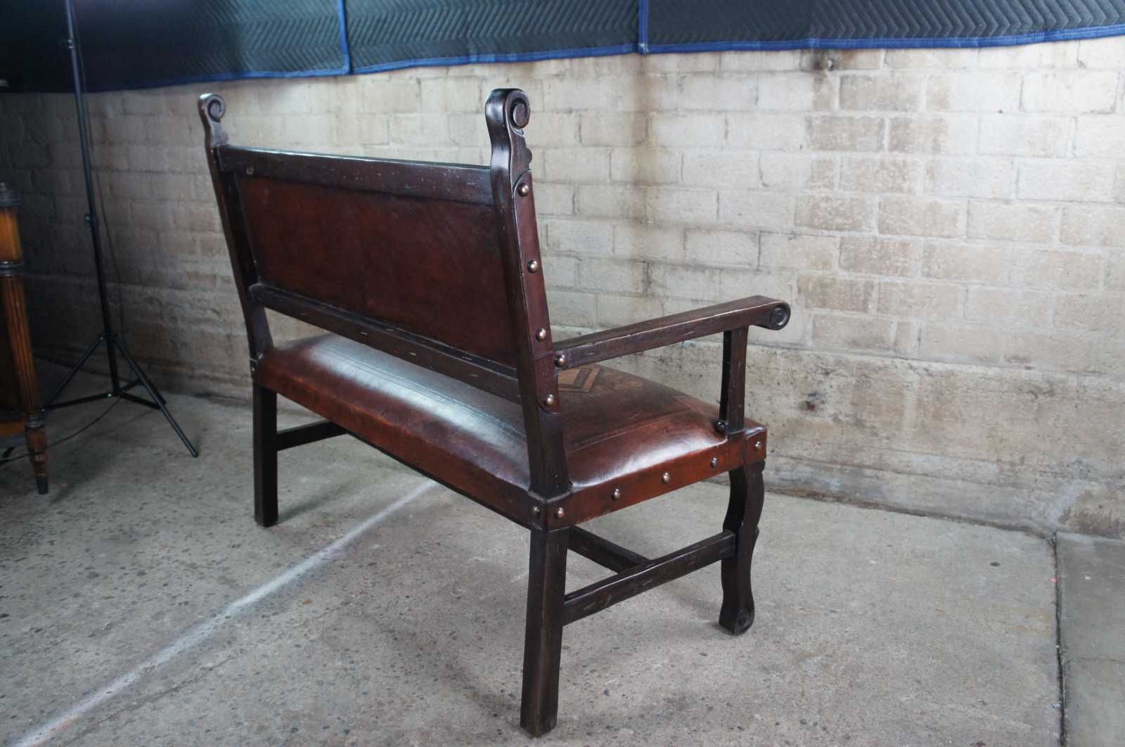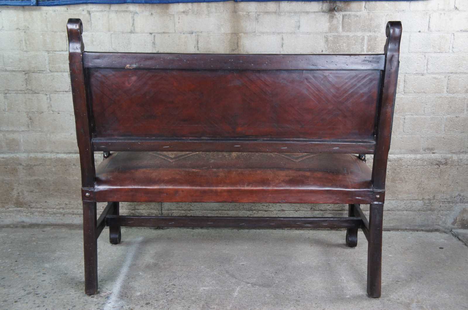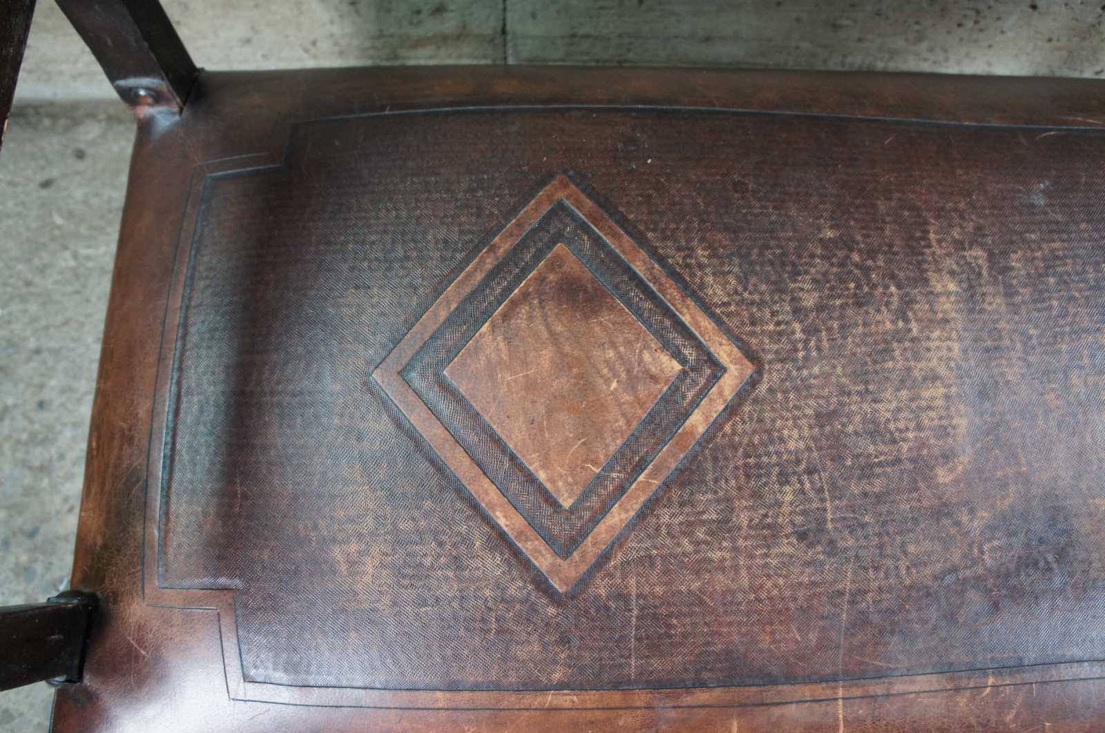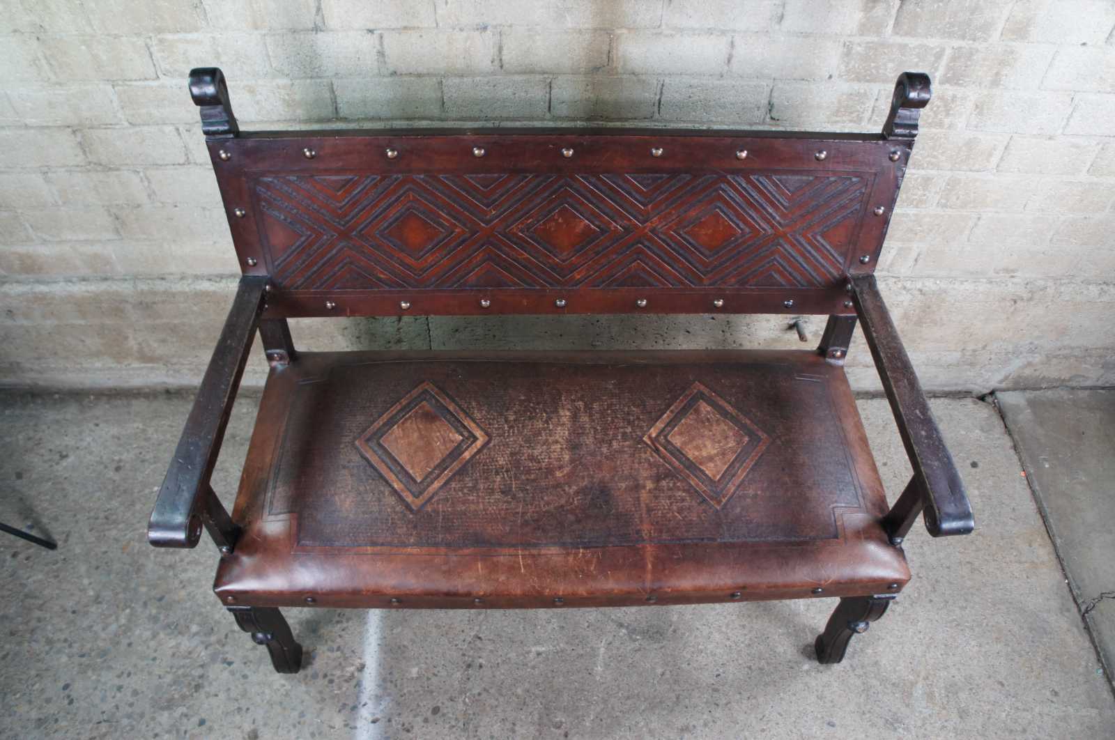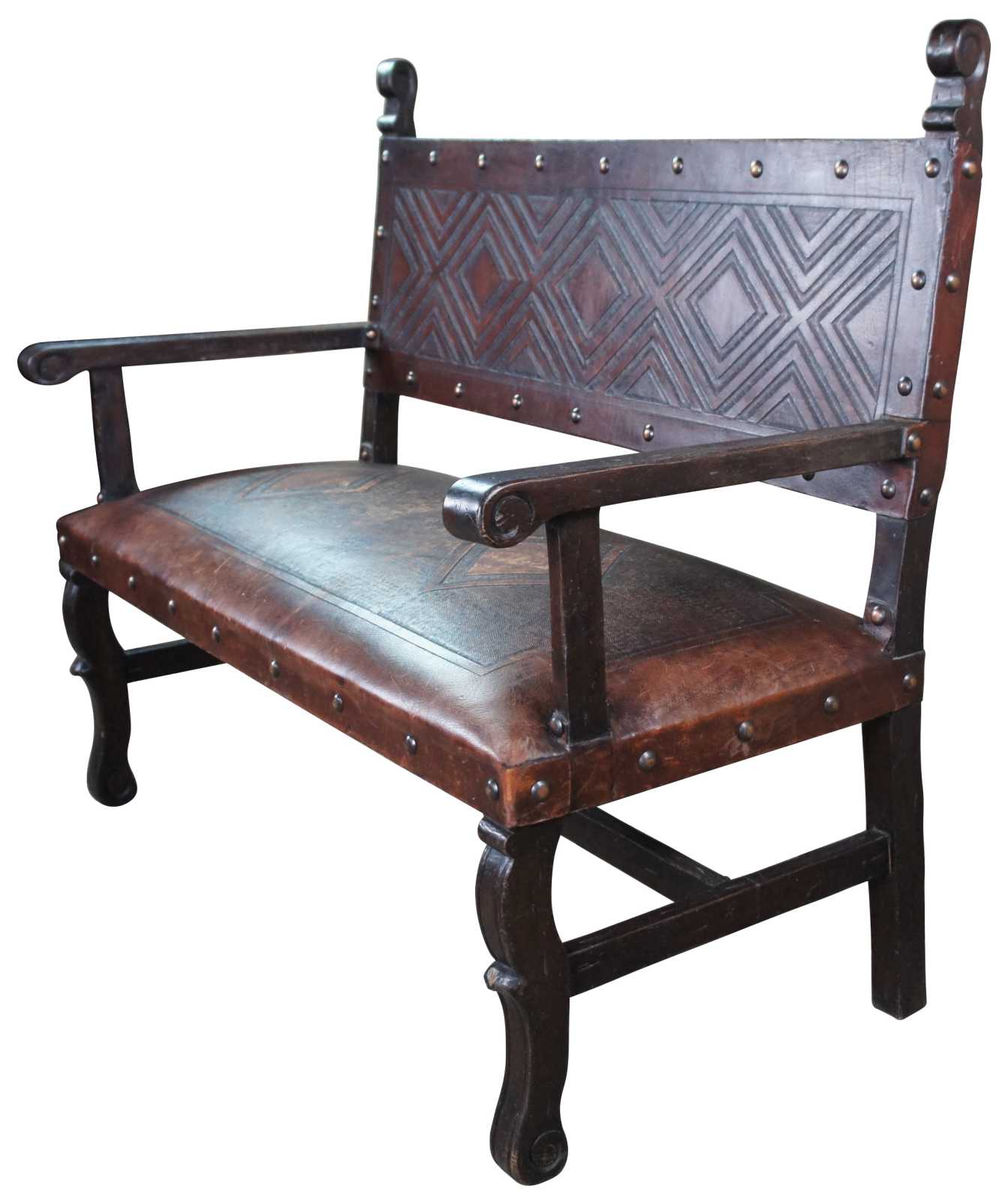 Vintage Spanish Heritage tooled leather bench featuring geometric diamond and nailhead design.