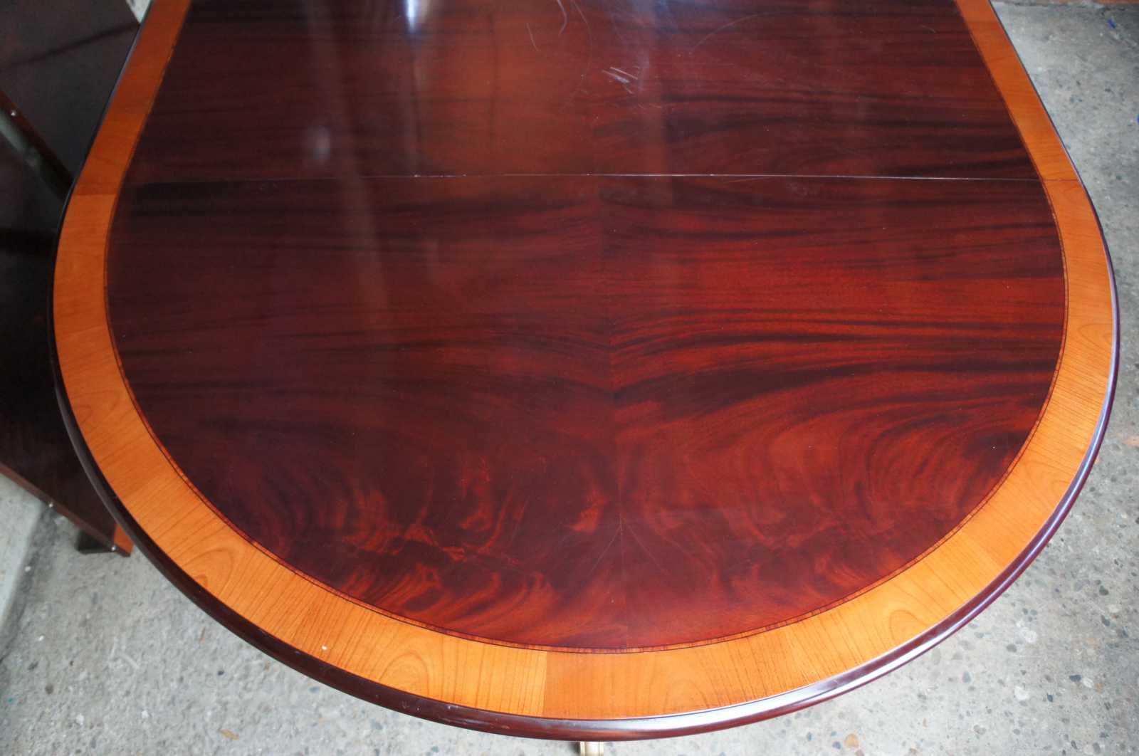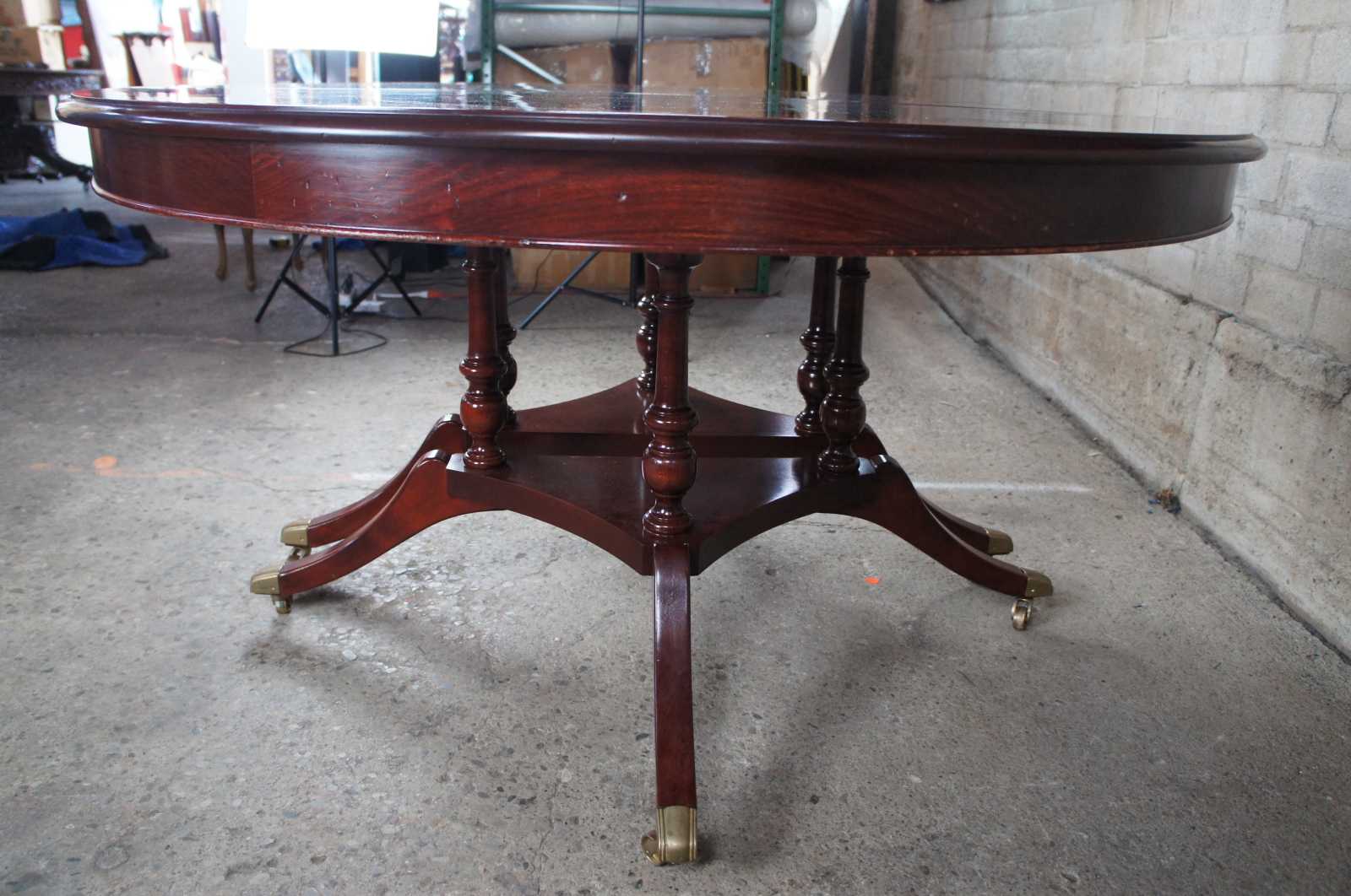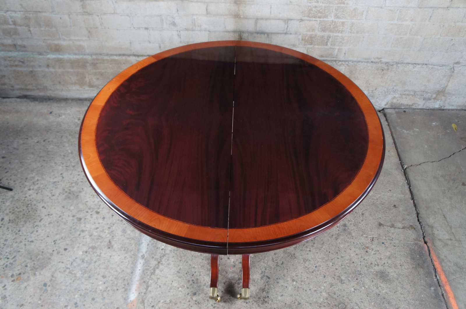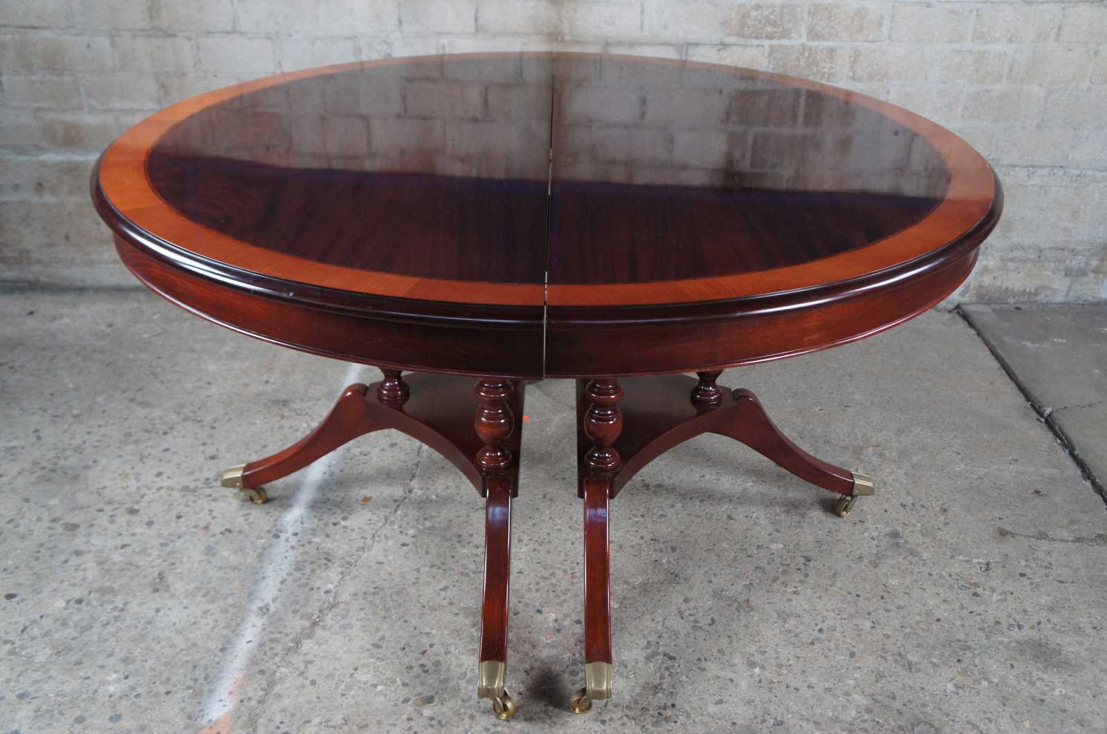 Vintage flame mahogany pedestal table featuring round or oval form with banded top, double pedestal base and swivel castors. Attributed to Ethan Allen's 18th Century Collection.
