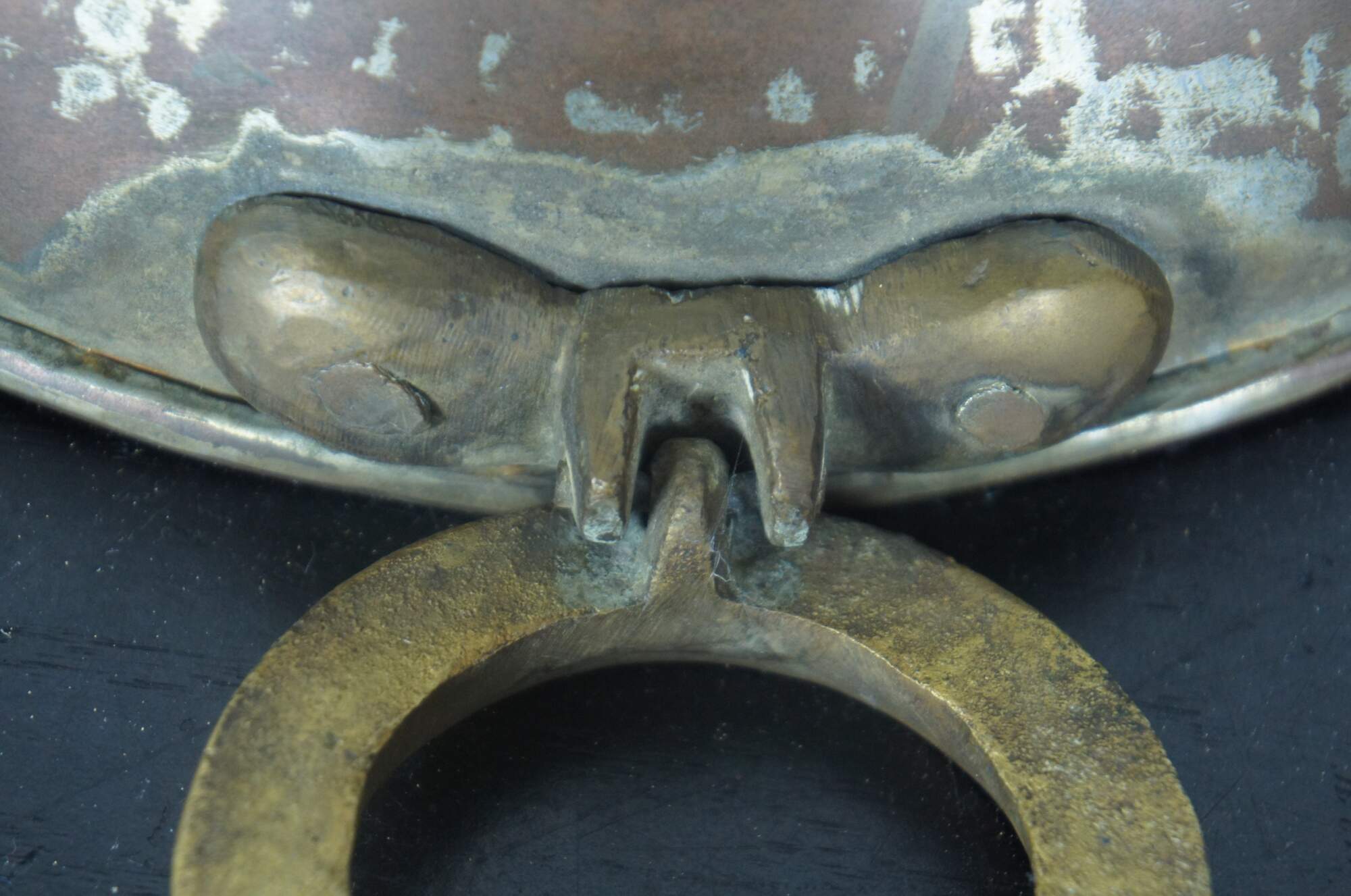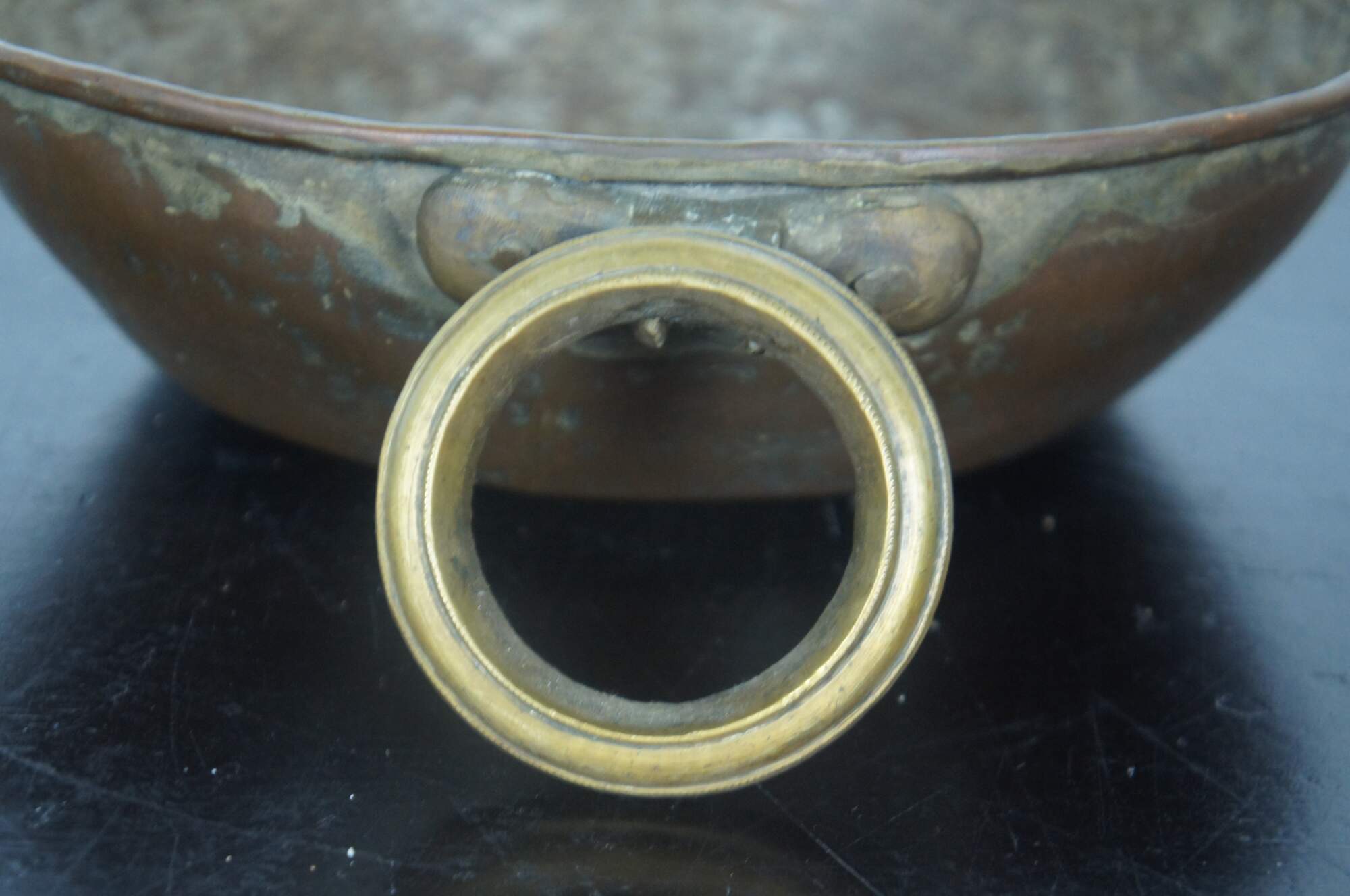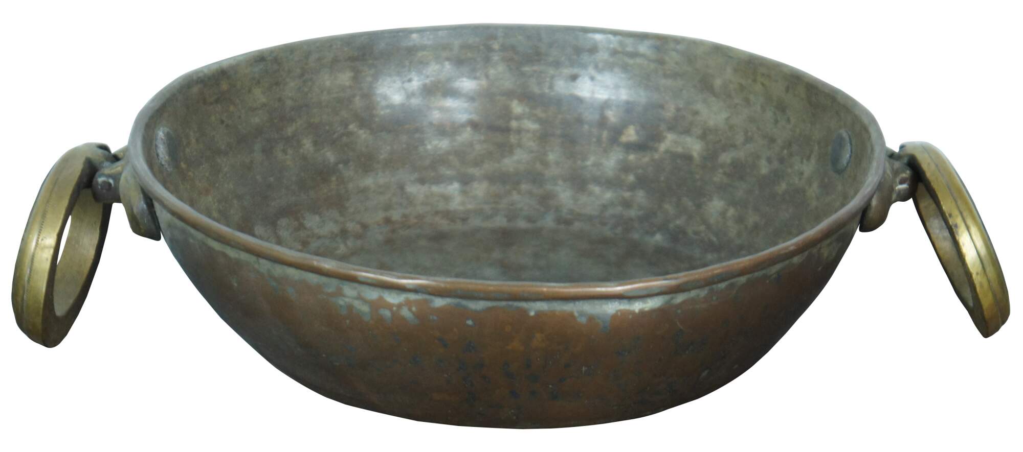 Antique 19th century hammered copper candy kettle with large brass handles.