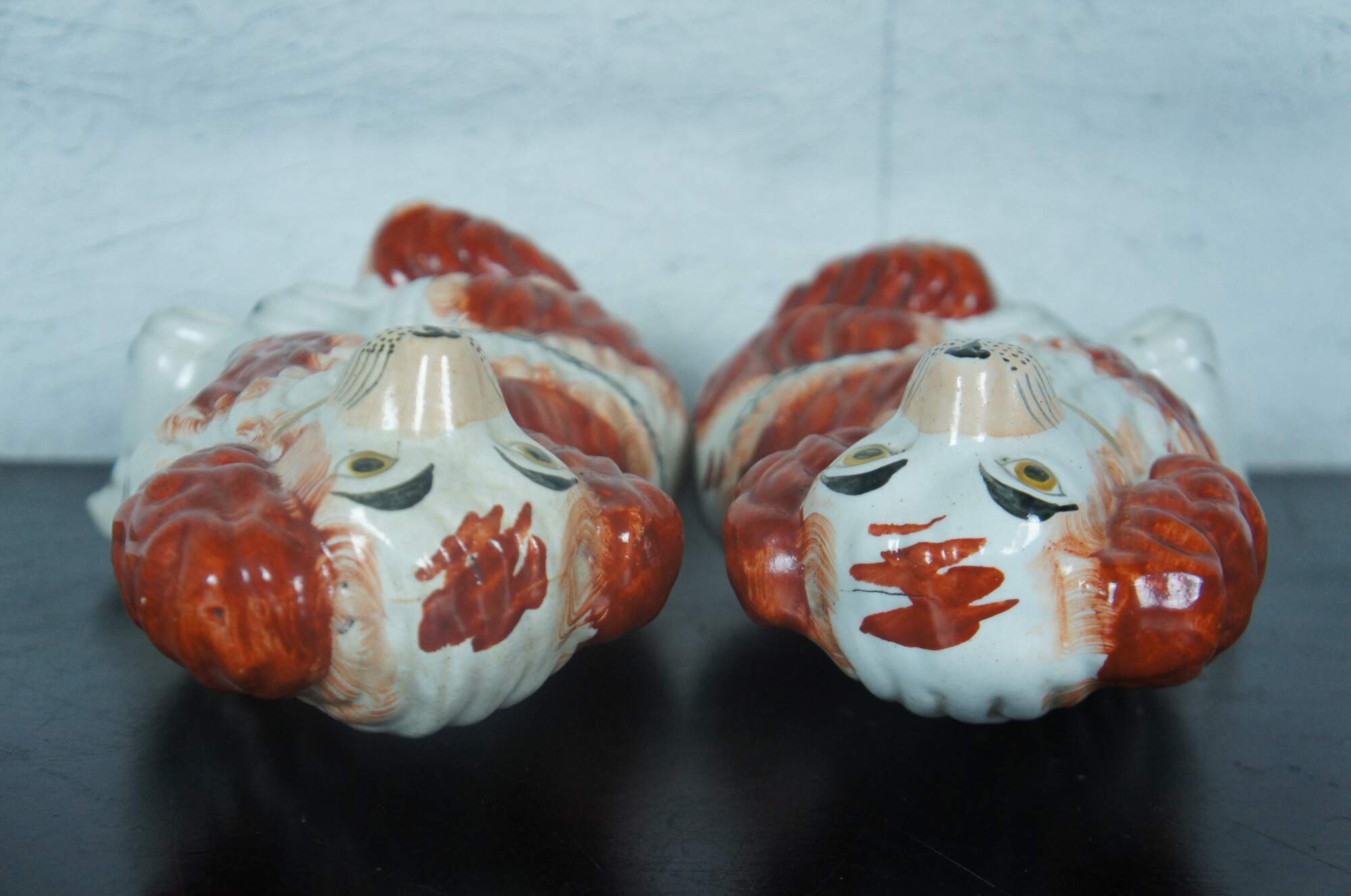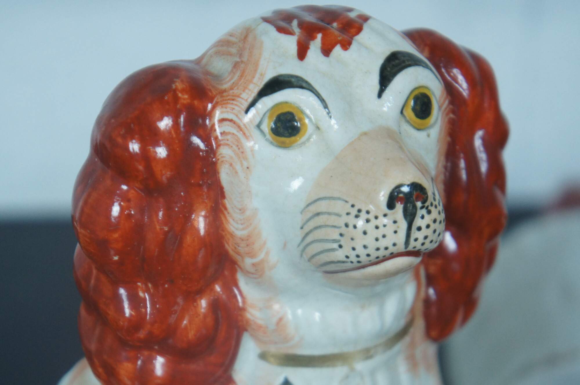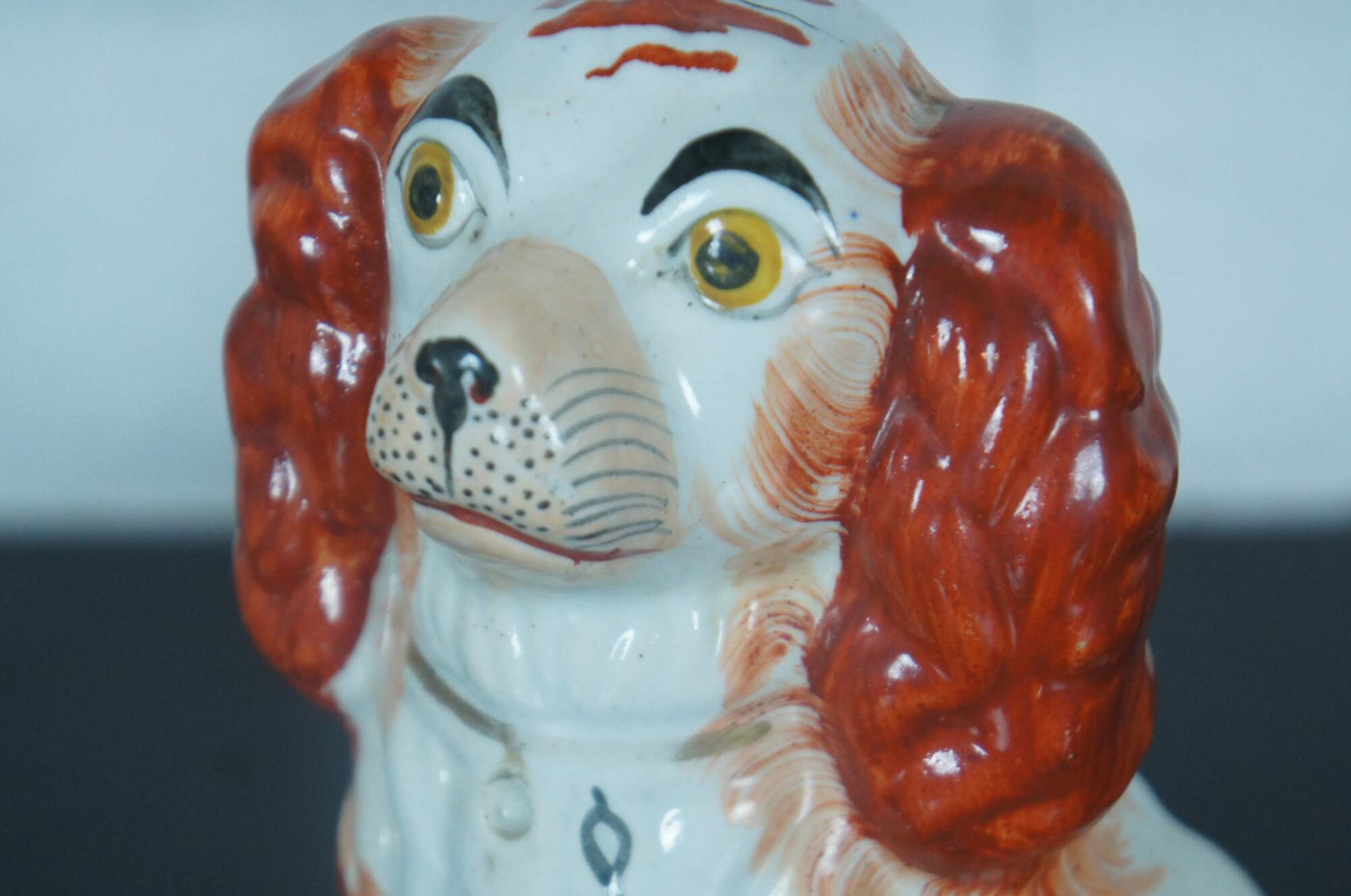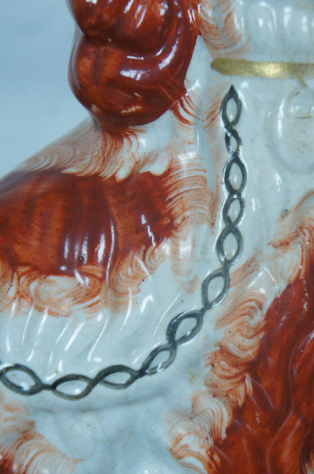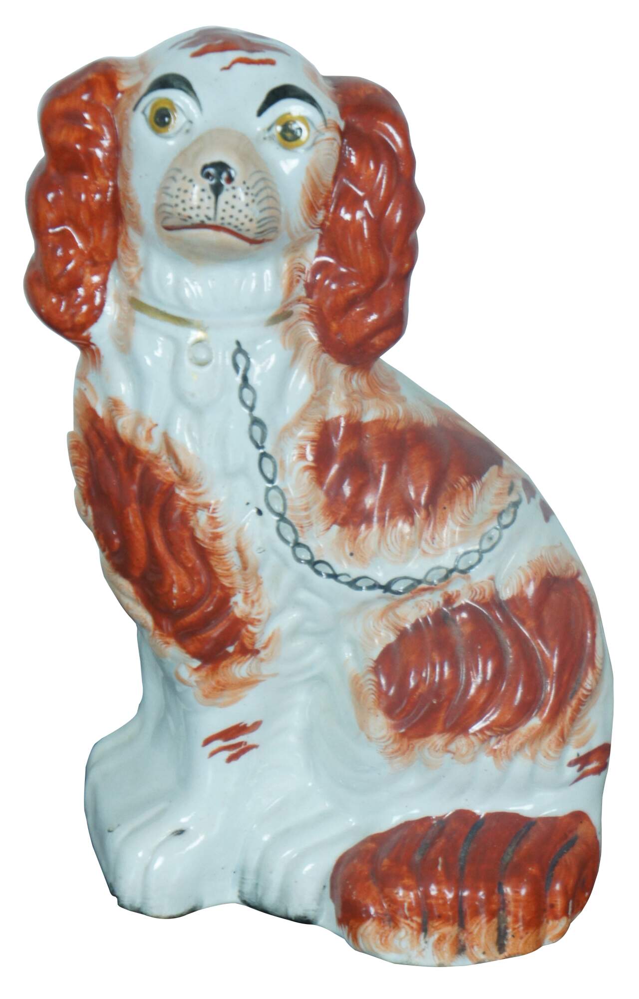 Pair of antique Staffordshire porcelain red and white King Charles Spaniel sculptures with gilded collars and chains. Circa last quarter 19th century, incised with a #2 along the base.
