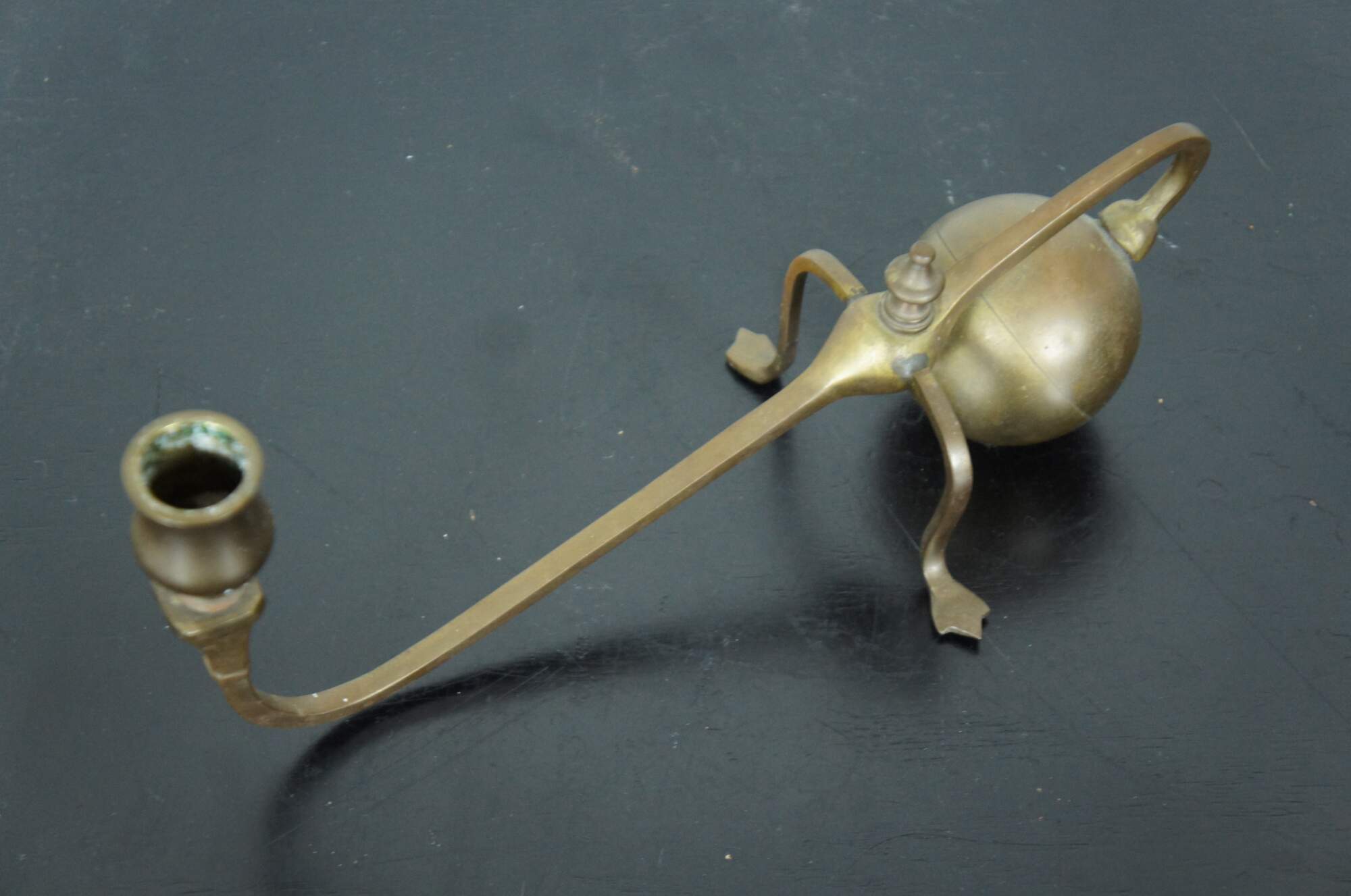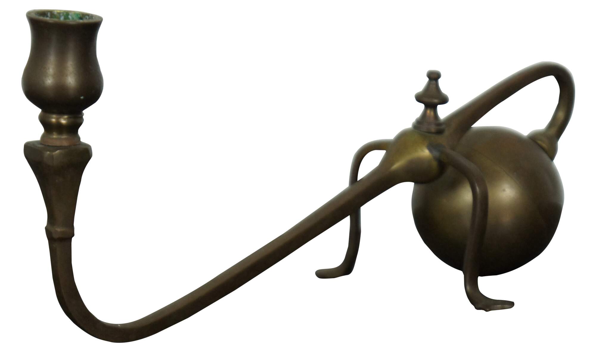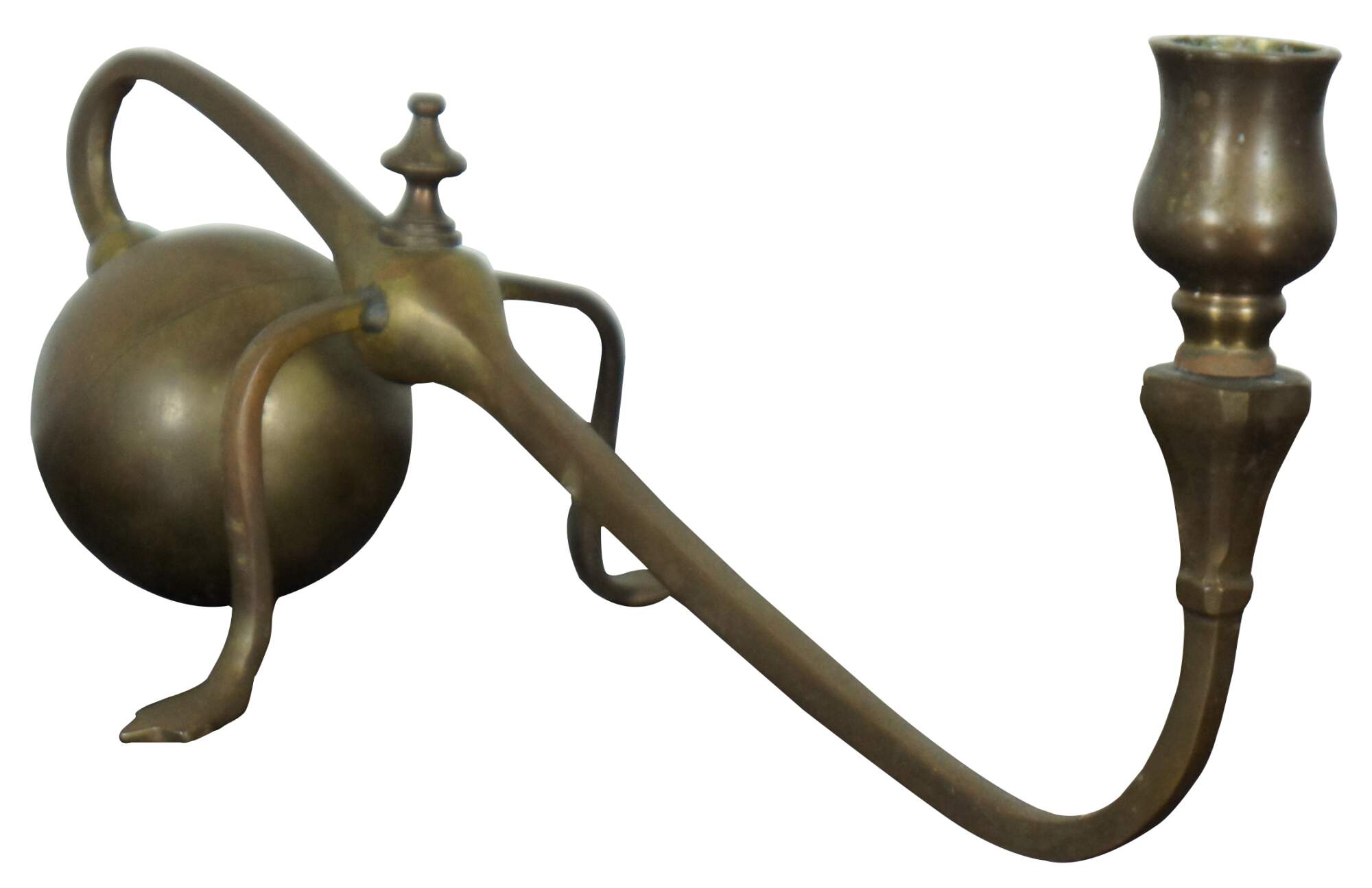 Antique cantilevered brass candlestick made to extend out over the edge of a mantel or piano, in a splay footed, cannonball style popularized by W.A.S. Benson; made in Spain.