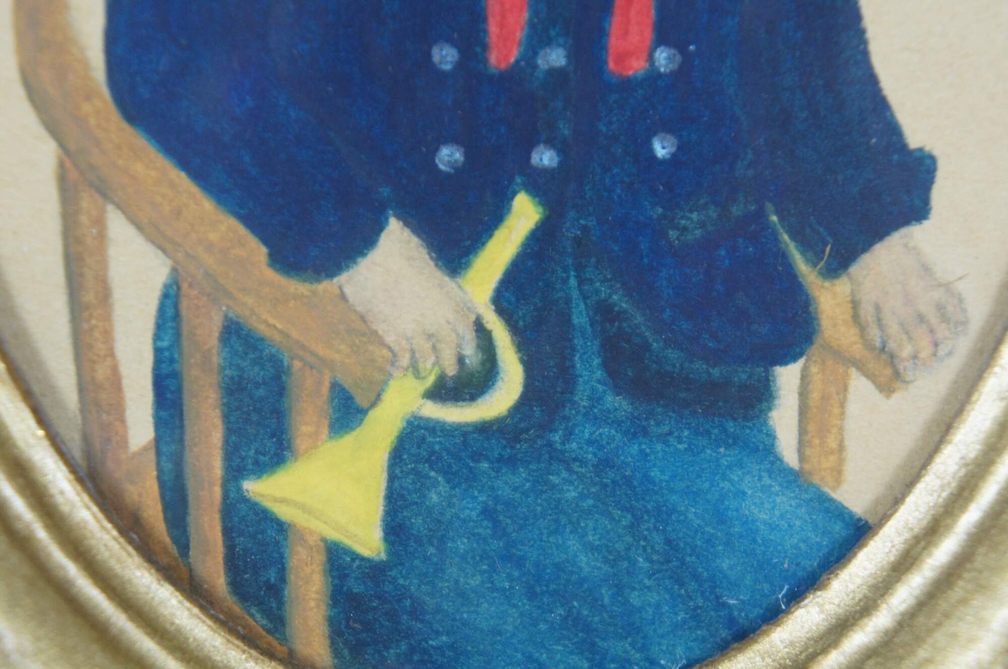 Antique Victorian Americana watercolor portrait of a young boy dressed in blue and holding a horn. Signed P. Hackett on the back of the frame.