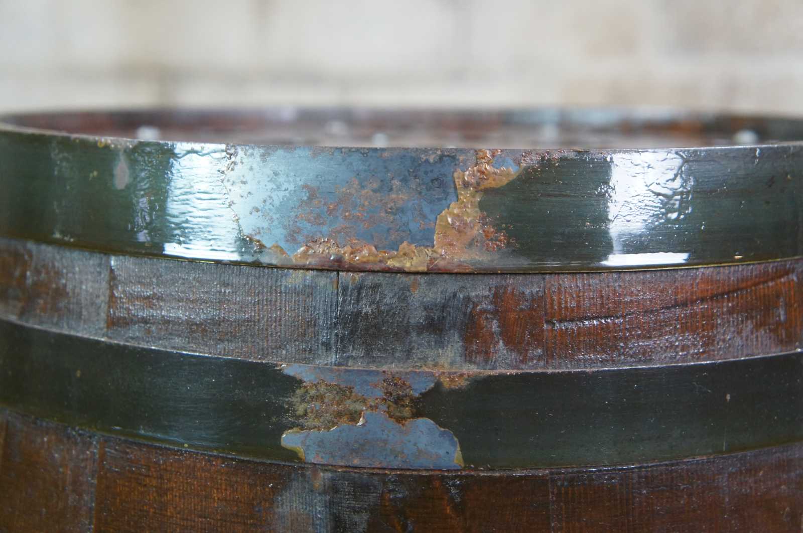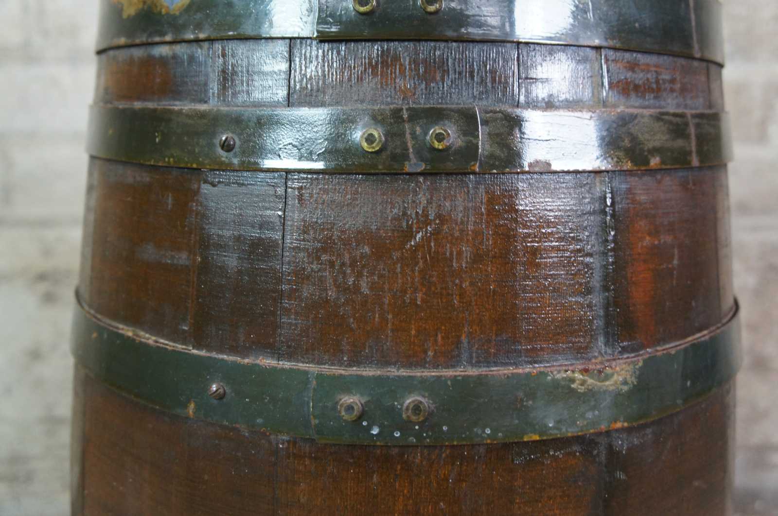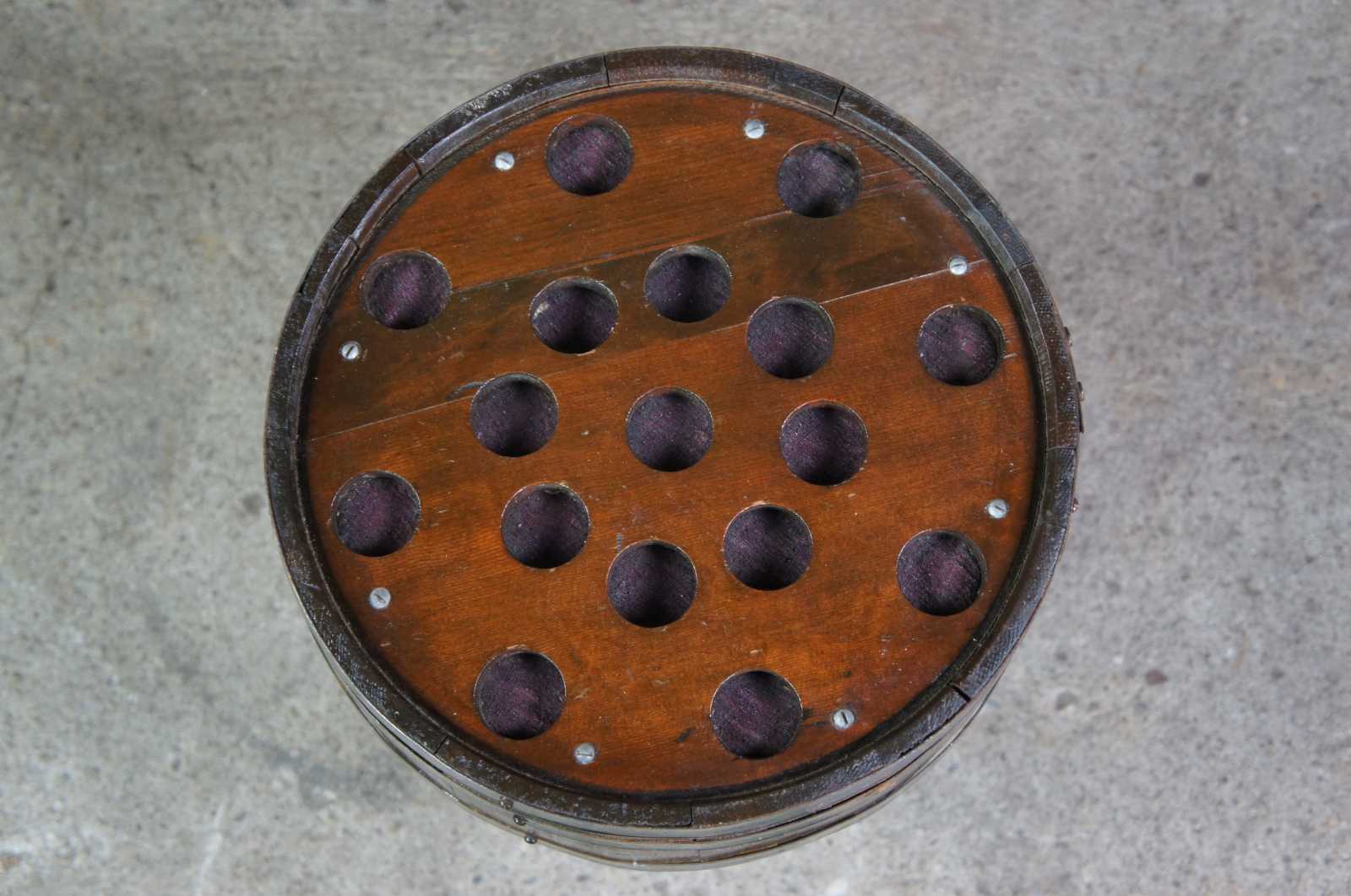 An antique whisky barrel that was converted into a speaker in the 1960s. Beautifully designed with metal banding and port holes for sound.